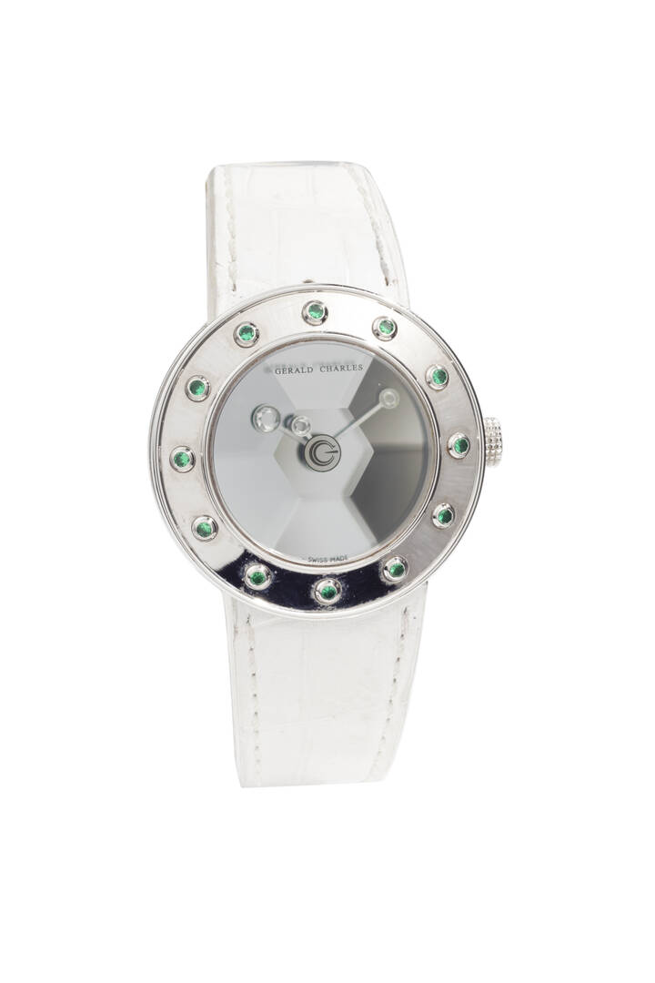 Cassa in acciaio, in tre parti, con lunetta recante incastonati dodici piccoli smeraldi. Quadrante a specchio, con lancette composte da tre gemme di colore bianco. Chiusura a scomparsa.