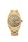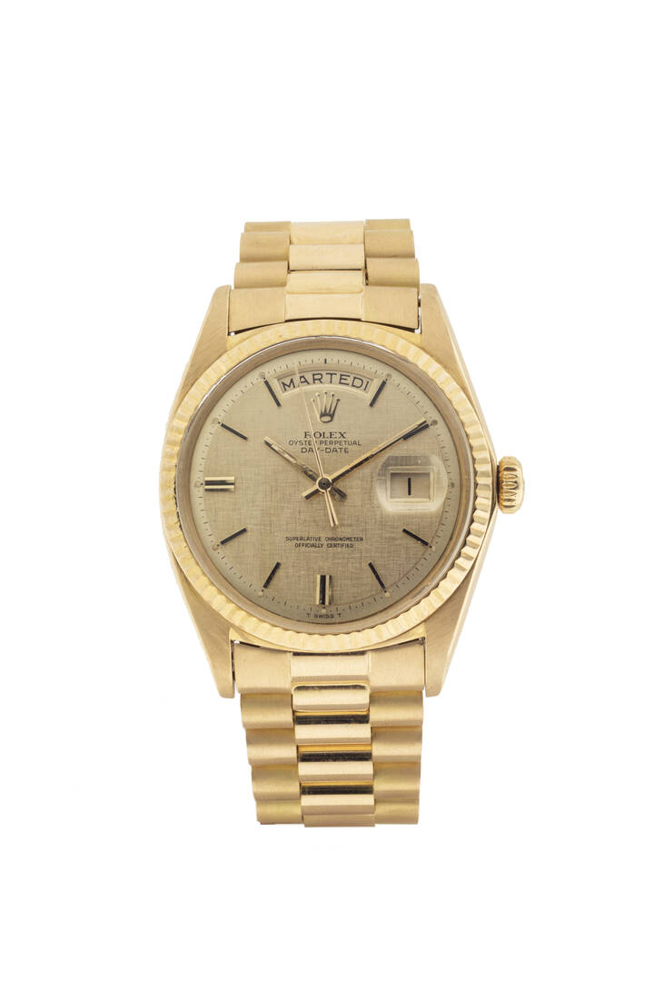 Cassa in oro con fondello a vite e lunetta godronata. Quadrante tapisserie nei toni dell'oro con indici geometrici applicati. Finestra con indicazione della data ad ore 3 e del giorno della settimana ad ore12. Bracciale President in oro, integrato, con chiusura clasp (21 maglie)