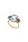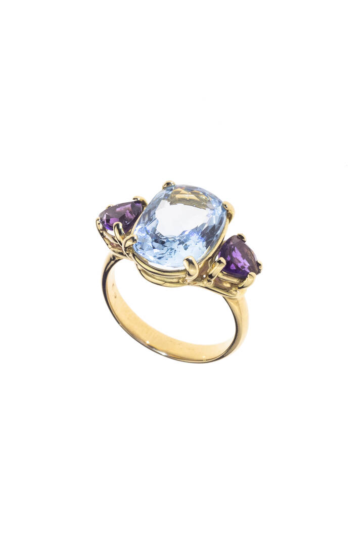 in oro giallo con topazio azzurro centrale taglio ovale e ai lati due amatiste taglio triangolare