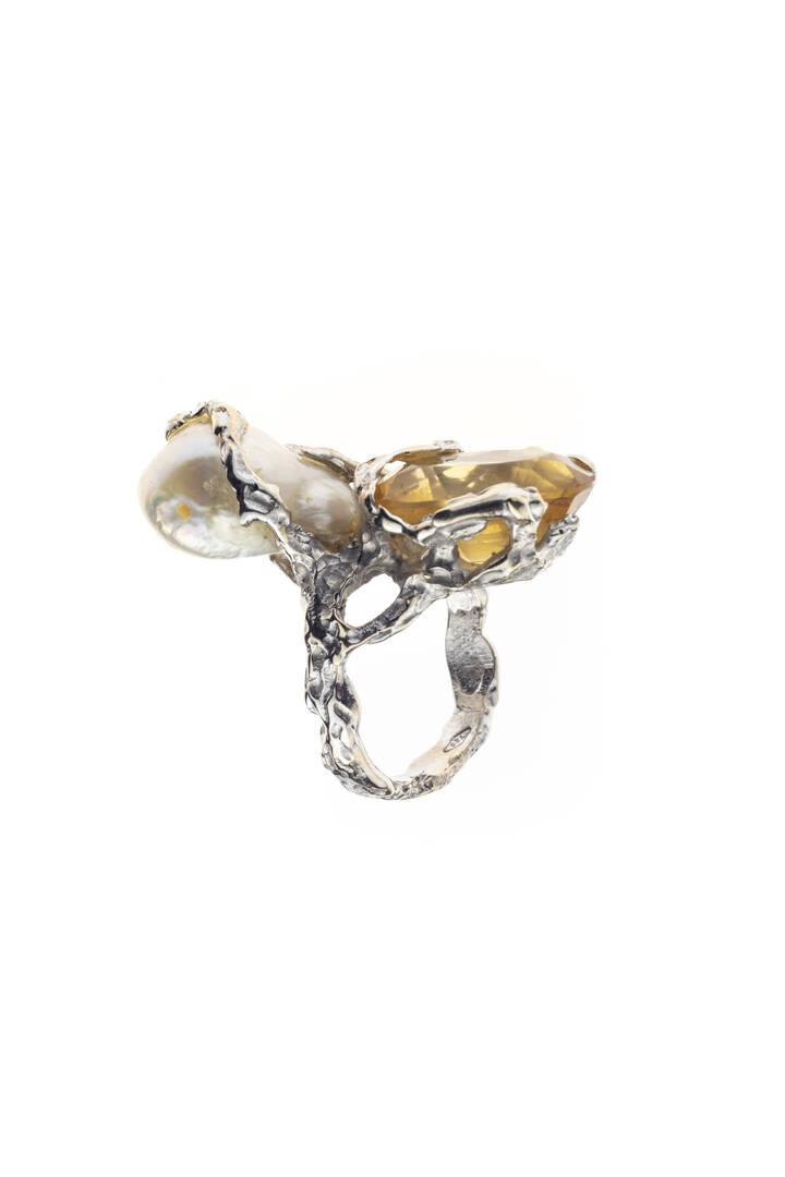 in oro bianco, con quarzo citrino taglio ovale e perla scaramazza di acqua dolce
