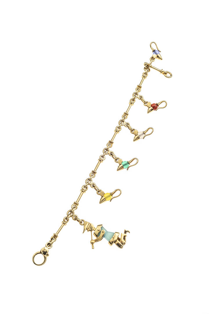 Bracciale in oro giallo, firmato "Pomellato", collezione "Fiabe", con sette charms in pietre dure raffiguranti la storia del "Pifferaio magico"