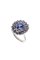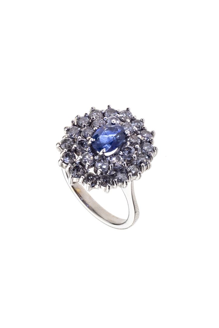 in oro bianco, sommità con al centro zaffiro Ceylon taglio ovale di ct 1,10 ca e doppio contorno di diamanti taglio brillante per totali ct 1,0 ca