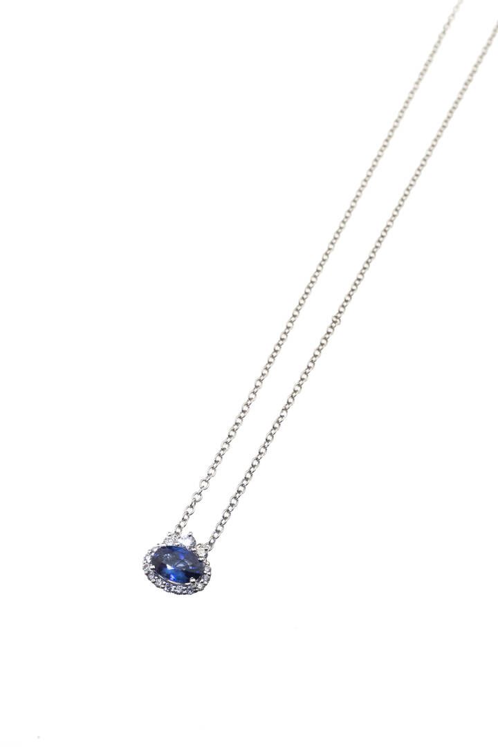 in oro bianco, con zaffiro taglio ovale di ct 0,58 ca e contorno di piccoli diamanti per totali ct 0,12 ca