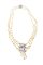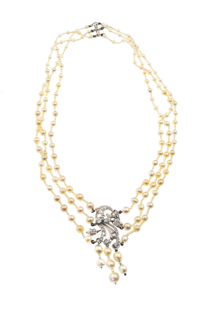 composto da tre fili di perline Keshi e giapponesi del diam di mm 4 a 6 ca; al centro voluta in oro bianco con diamanti taglio 8/8 e rosette per totali ct 0,50 ca