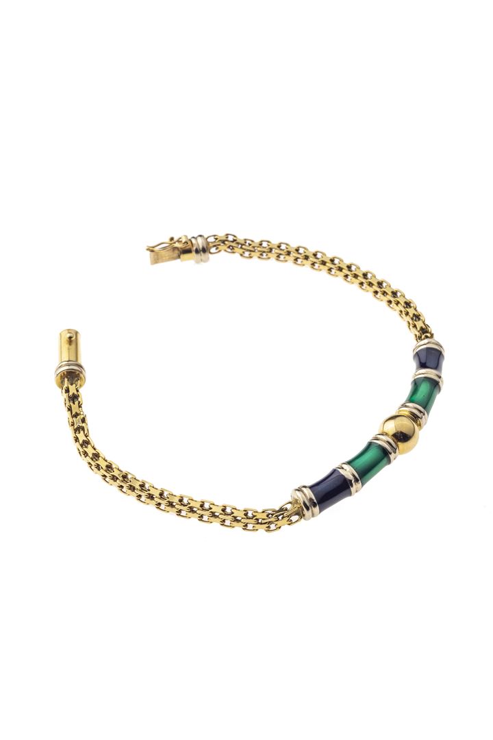 in oro giallo a maglia veneziana lavorata con parte centrale rigida recante smalti verdi e neri