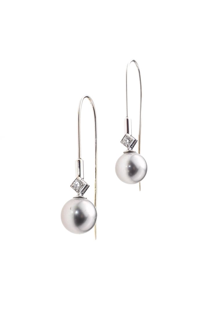 in oro bianco, ad amo, con due perle Tahiti nei toni del grigio chiaro del diam di mm 10 ca, sormontate da due diamanti taglio brillante per totali ct 0,15 ca
