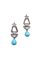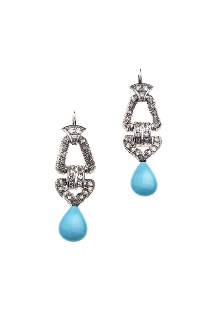 in oro bianco, a monachella, con diamanti taglio 8/8 per totali ct 0,65 ca e due gocce pendenti di turchesi