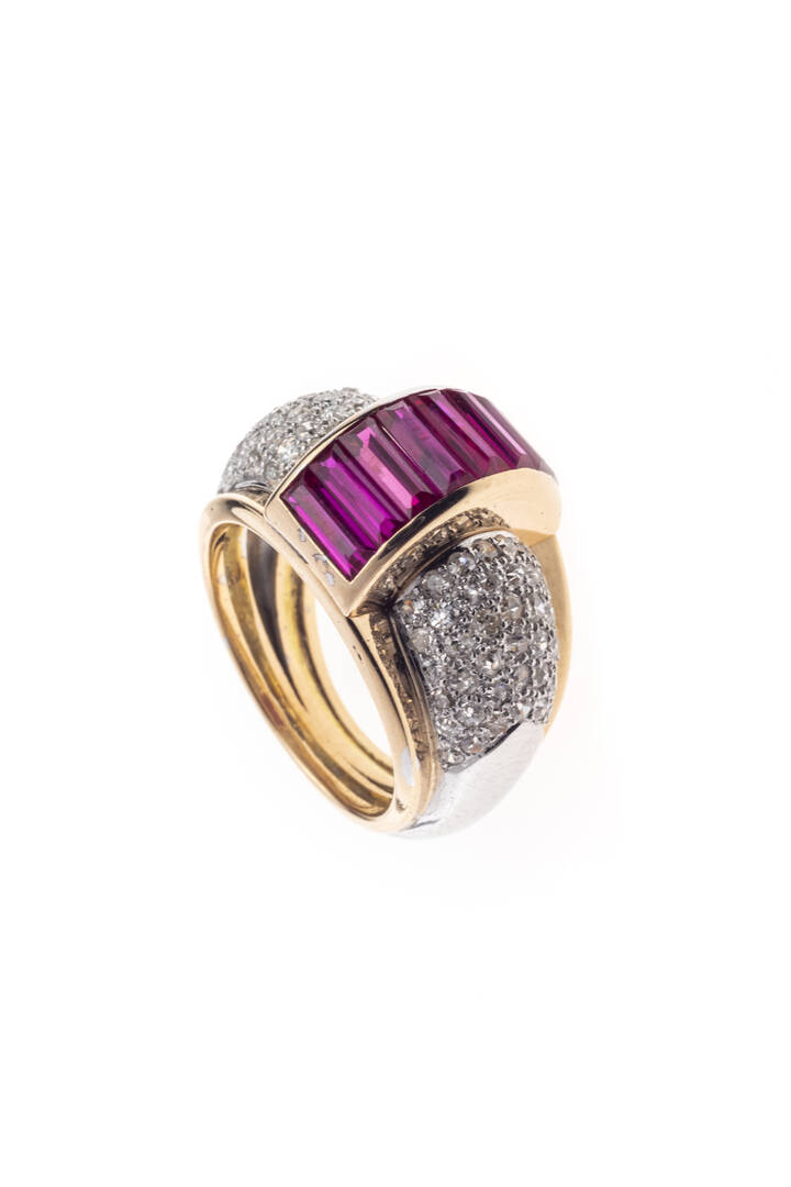 in oro rosa e bianco, anni '40, con sommità bombata in pavé di diamanti taglio 8/8 per totali ct 1,0 ca, e fascia centrale di pietre sintetiche di colore rosso taglio baguette