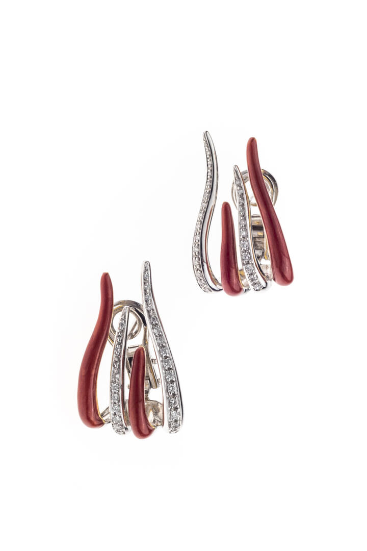 in oro bianco e giallo, a lobo, con volute in diamanti taglio brillante per totali ct 0,32 ca e smalto rosso