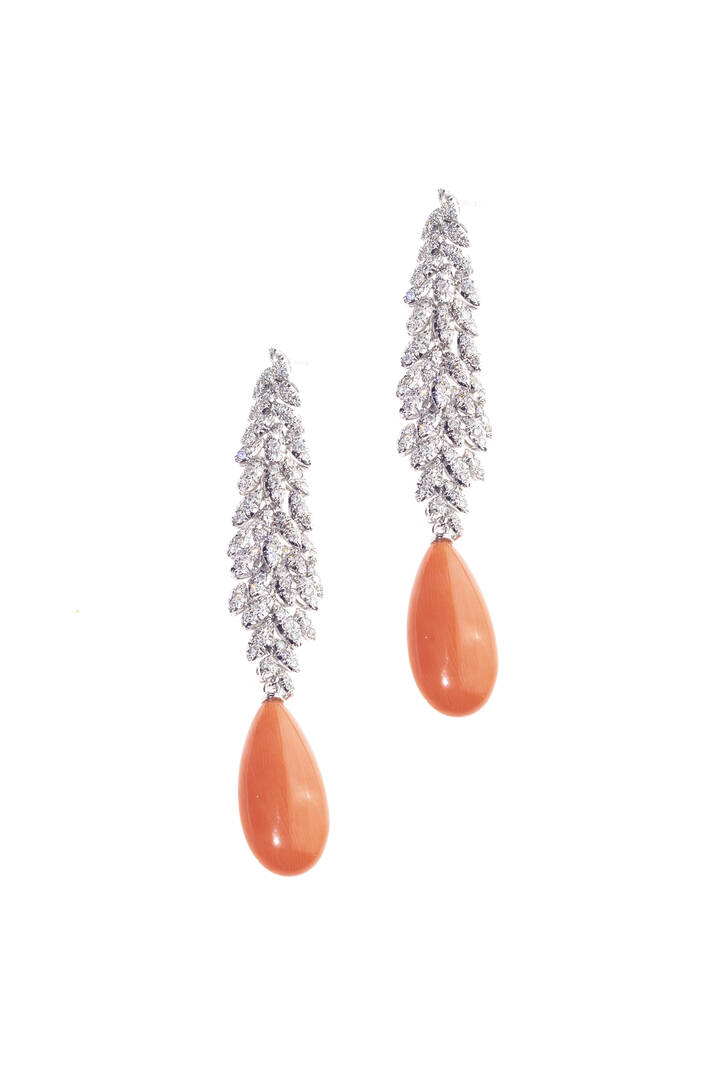 pendenti, in oro bianco 14 Kt, con piume in diamanti taglio brillante per totali ct 3,18 ca, terminanti con due gocce di corallo color salmone