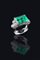 Insolito anello in oro bianco con griffes in oro giallo, firmato “Arcangelo”, gambo geometrico con fondo appiattito, al centro grande smeraldo colombiano taglio ottagonale di ct 10,90 ca, ai lati sei diamanti taglio brillante a decoro per totali ct 1,90 ca