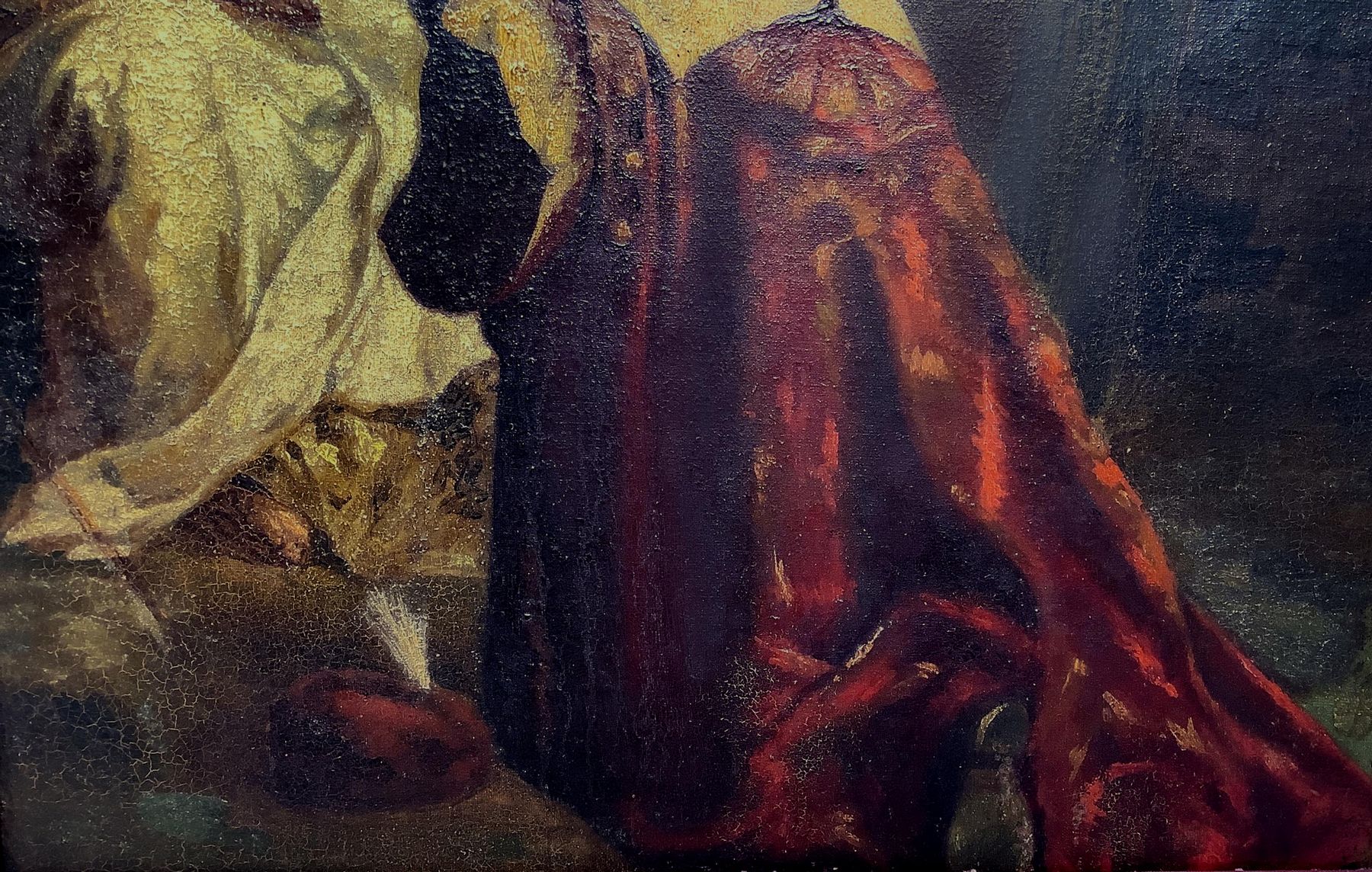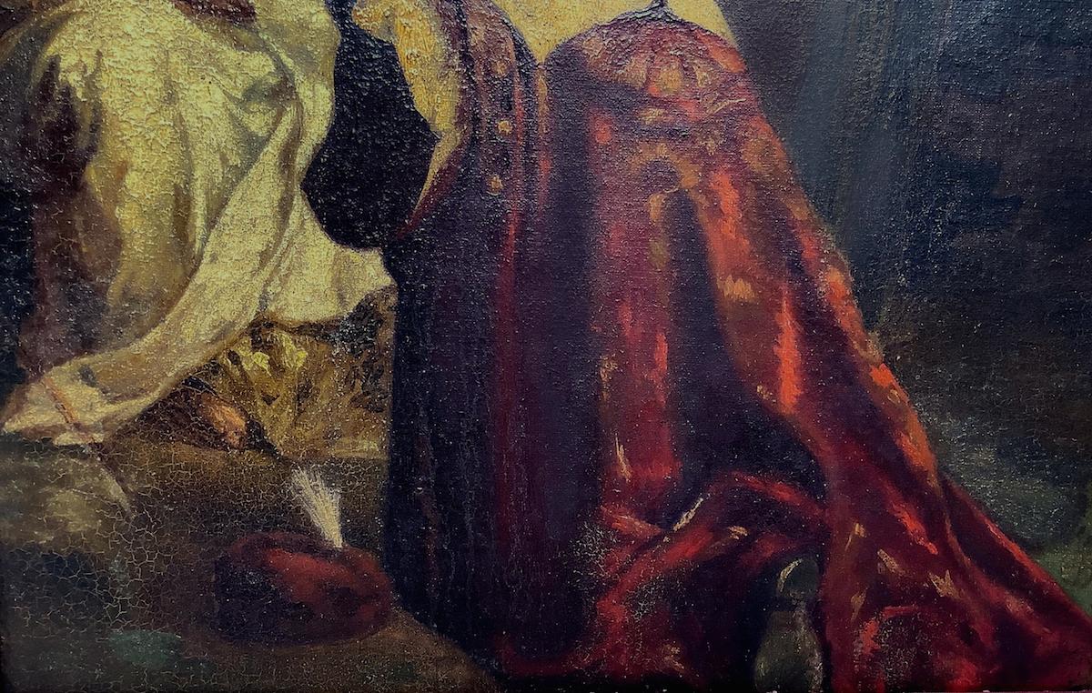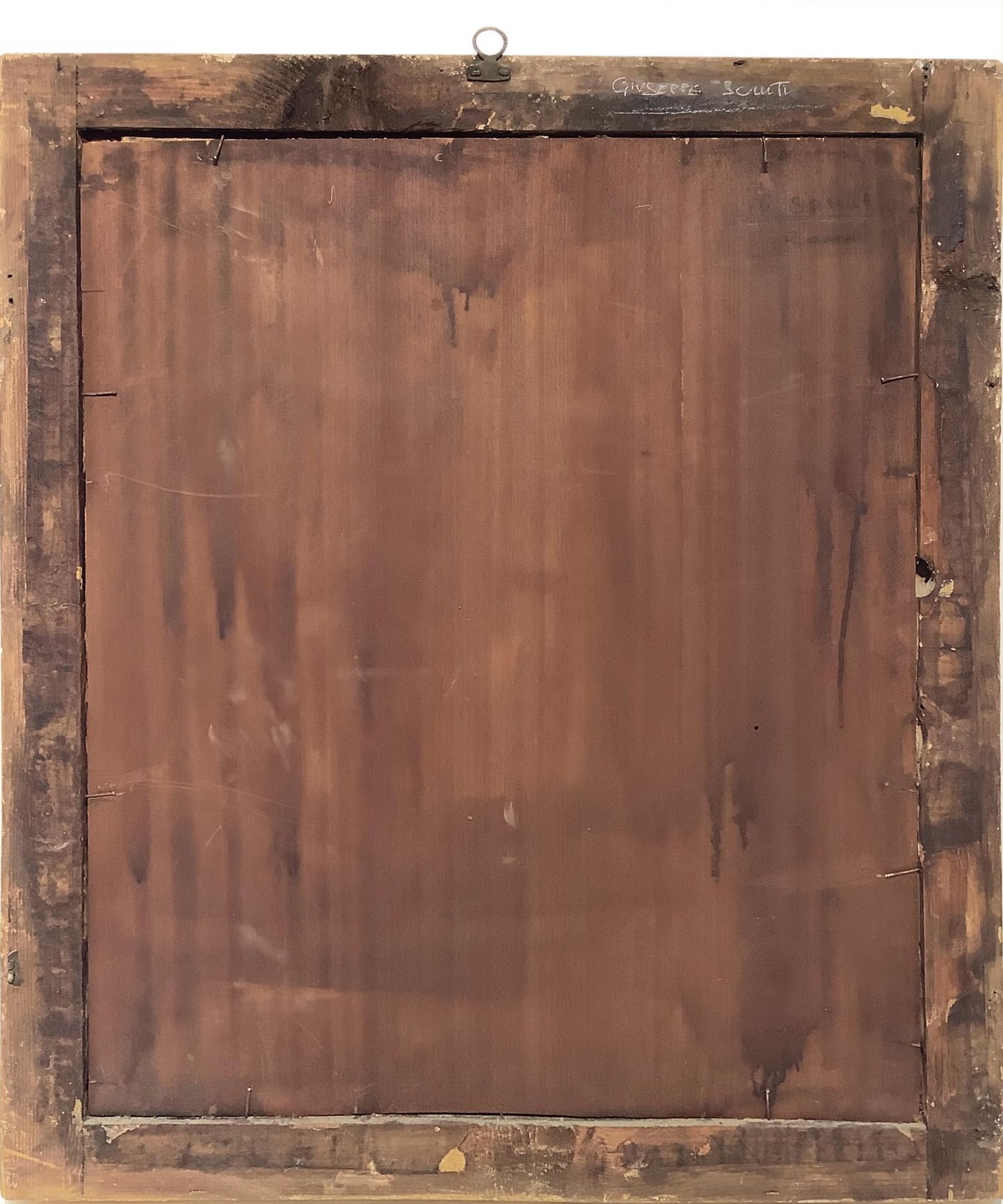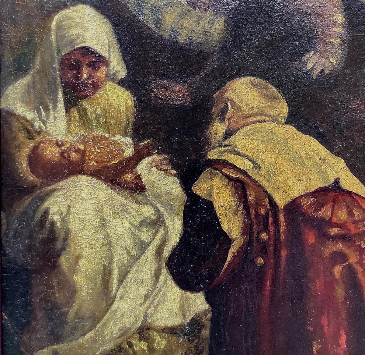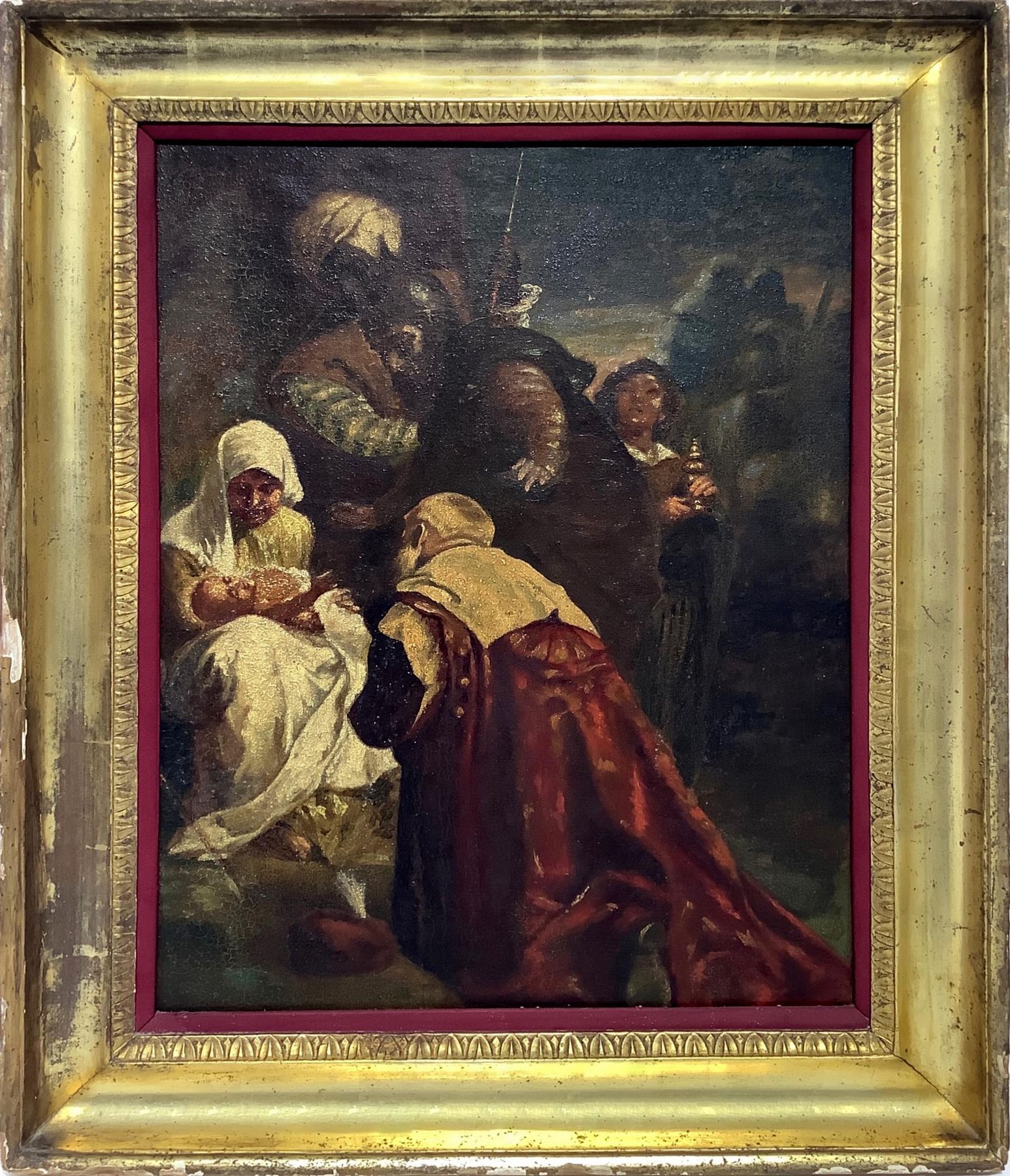 Olio su tela applicata a tavola raffigurante Adorazione dei Magi, Giuseppe Sciuti (Zafferana Etnea, 26 febbraio 1834 – Roma, 13 marzo 1911). Cm 60x46, in cornice cm 70,5x56,5 Dipinto che è estraneo ai soggetti della classicità greco-romana. Sciuti assume in questo, toni più domestici, meno enfatici. La Madonna dal volto di una giovane madre siciliana, che guarda intensamente il proprio bimbo che dorme, fa trasparire un momento di chiara intimità. I magi ammirati sono partecipi di un momento di benevolenza affettuosa. La stesura, un bozzetto, meno sottoposta al controllo dell’ornato disegno, è veloce e quasi istintiva. L’impasto grumoso dei pigmenti ci riporta a una pittura a macchia, estranea alla pratica scenografica dei grandi dipinti che Sciuti amava concepire. La densità corposa della pennellata esalta l’effetto luministico che con perizia cromatica accosta le macchie scure a quelle più chiare, con l’uso sapiente del bianco. Il tutto ci riporta a un’ambientazione quasi familiare, ma di grande qualità pittorica , che rimanda alle esperienze di Firenze e Napoli. In cornice mezza canna siciliana del XIX secolo. ASORstudio