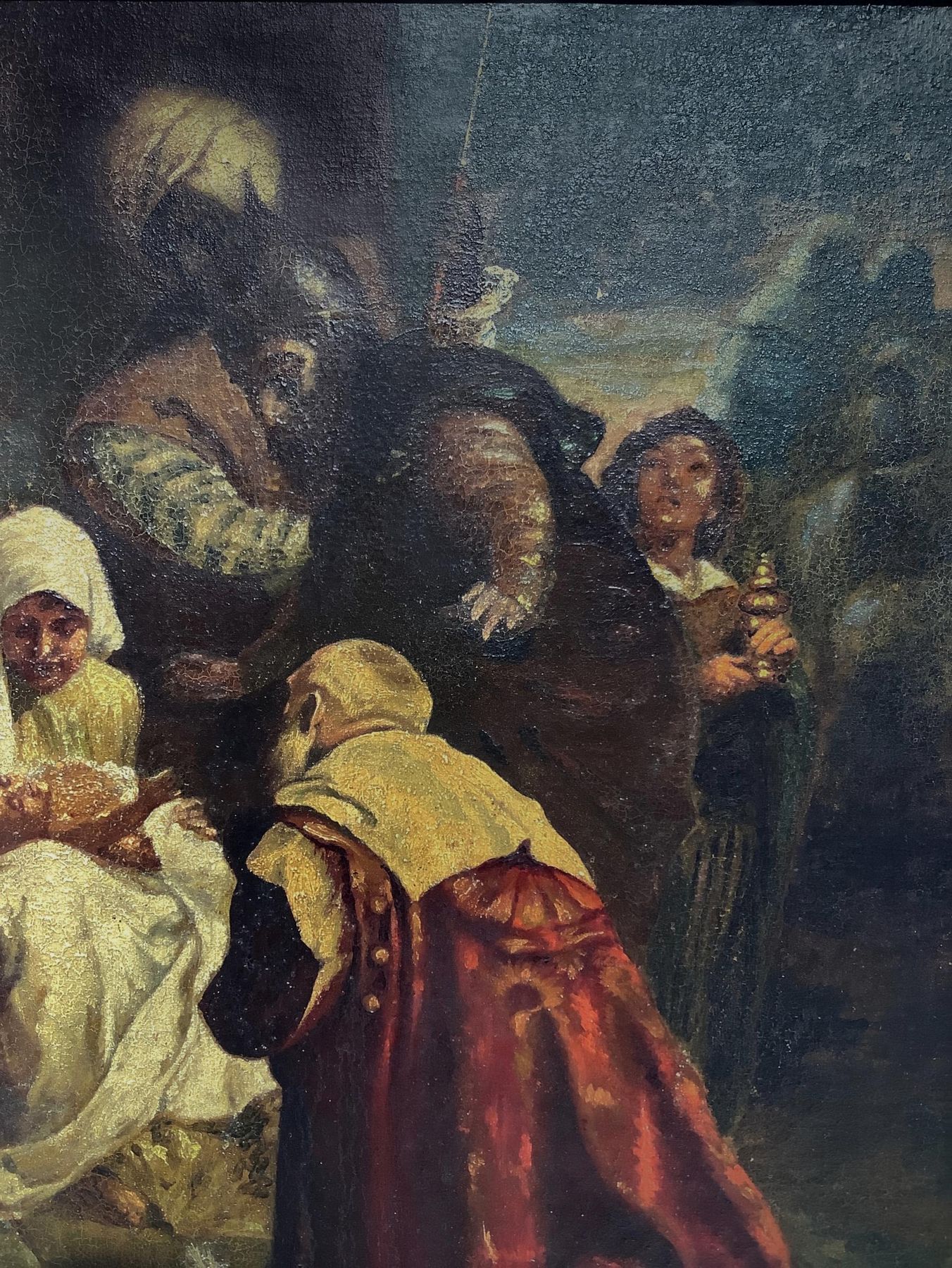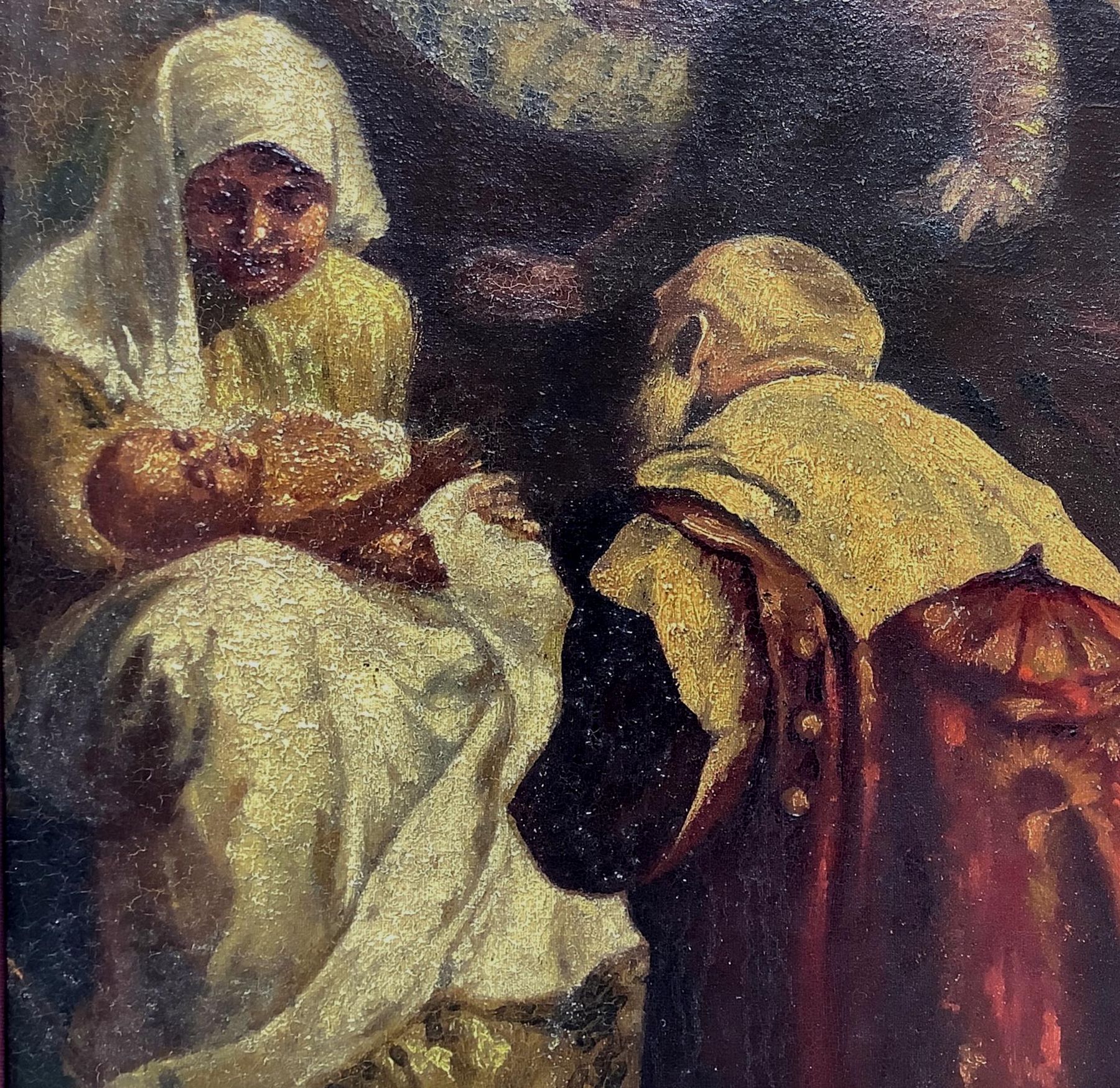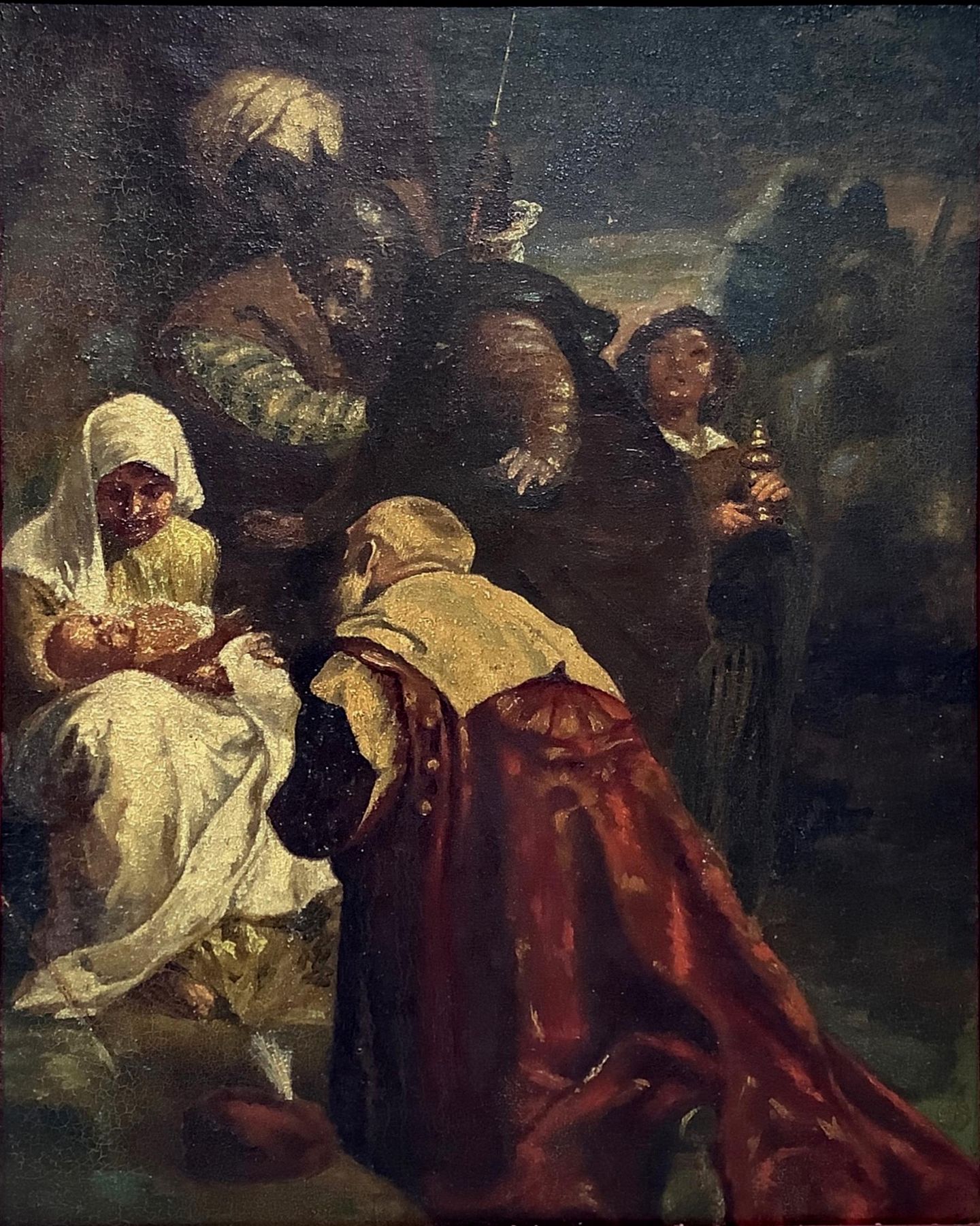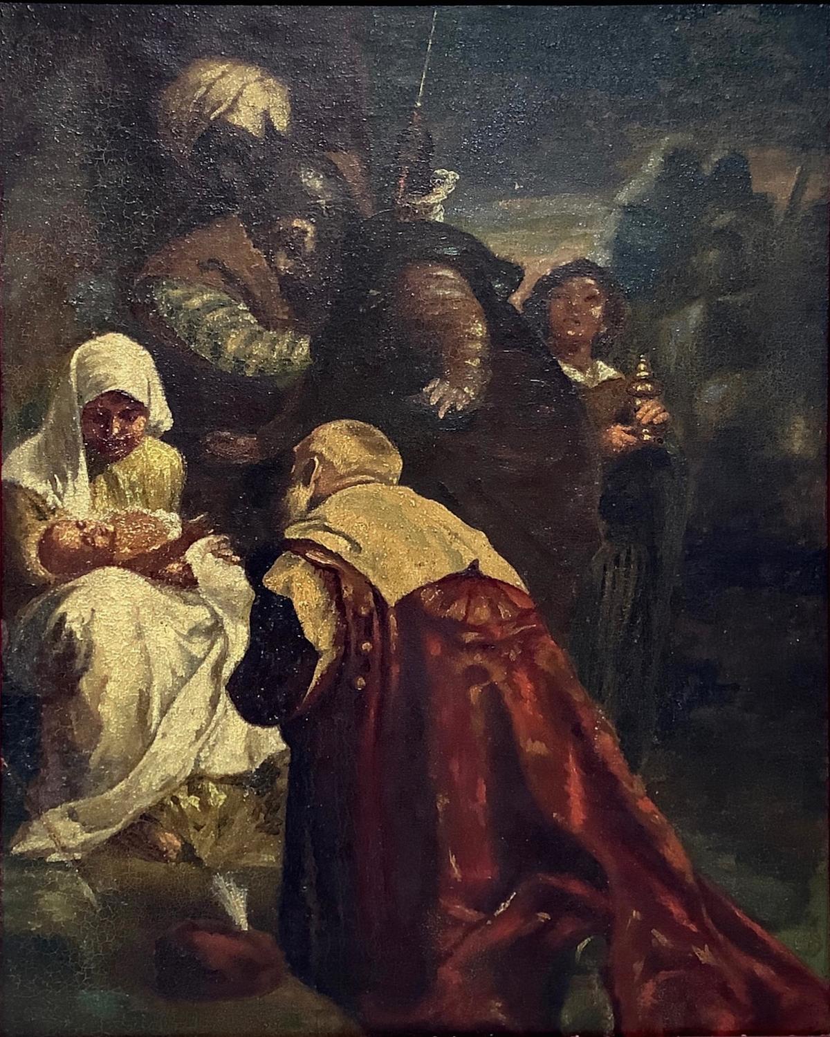 Olio su tela applicata a tavola raffigurante Adorazione dei Magi, Giuseppe...