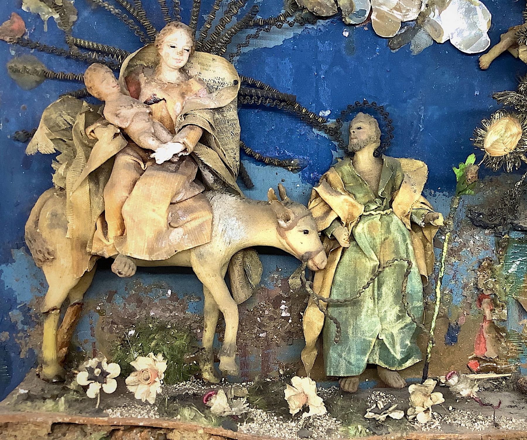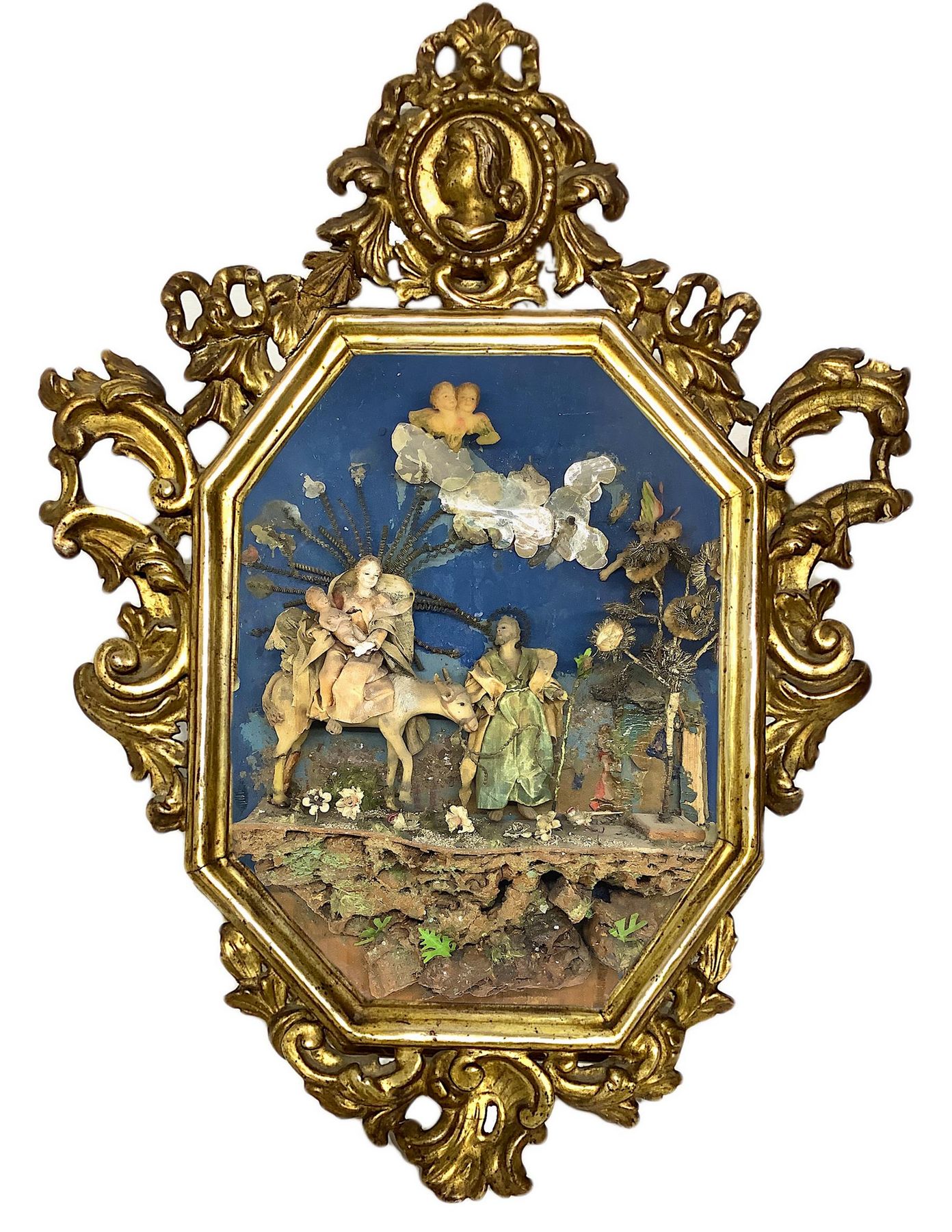 Fuga in Egitto in teca, in cera e stoffa, Sicilia, Trapani, metà del XVIII secolo. Teca coeva Luigi XV in legno dorato Luigi XV. H cm 47 x35, profondità cm 7.