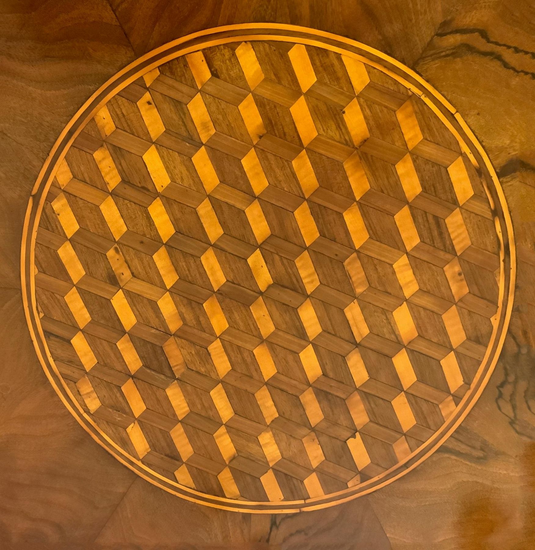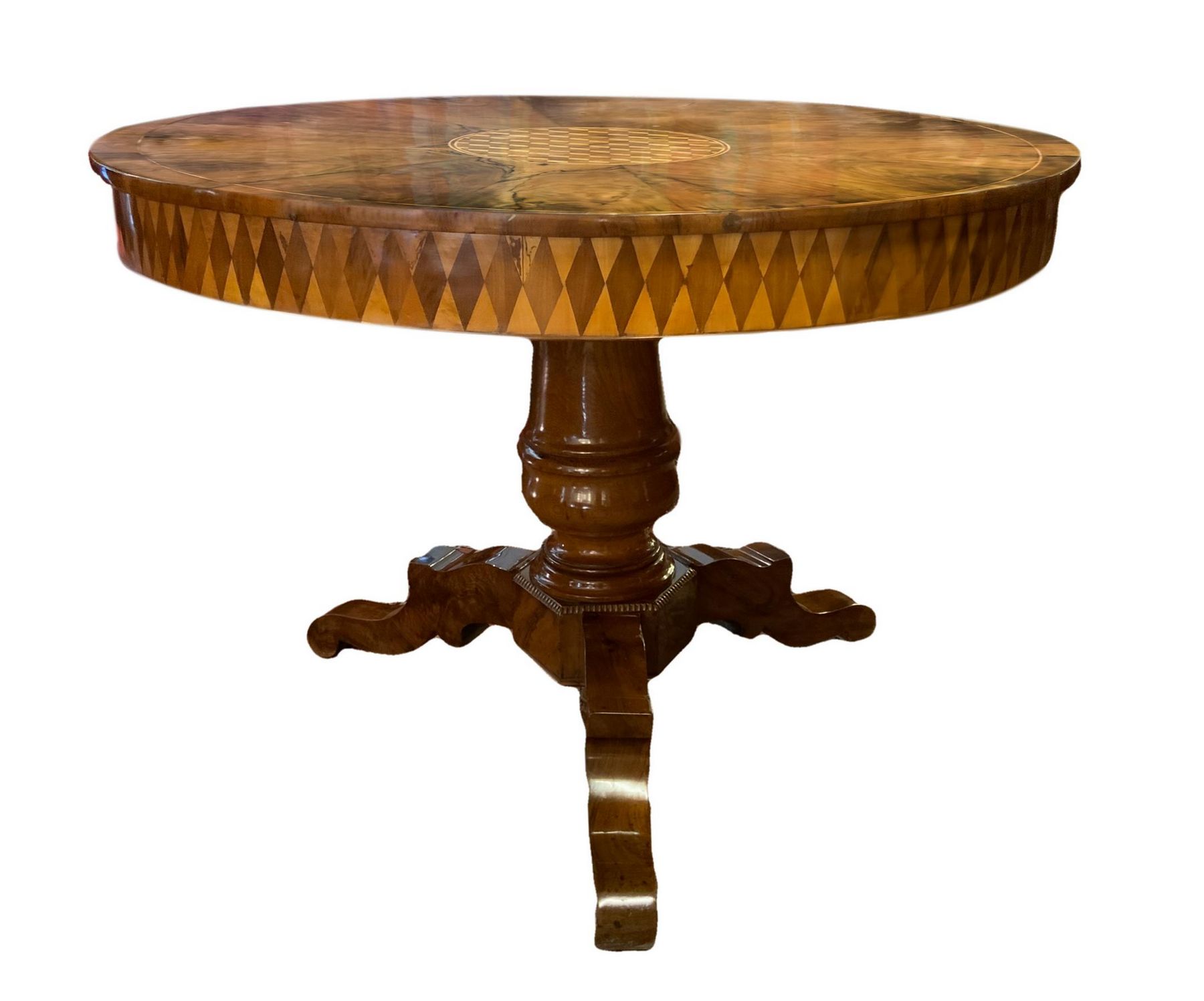 Elegante tavolo da centro rotondo con intarsi al piano e nella balza di...