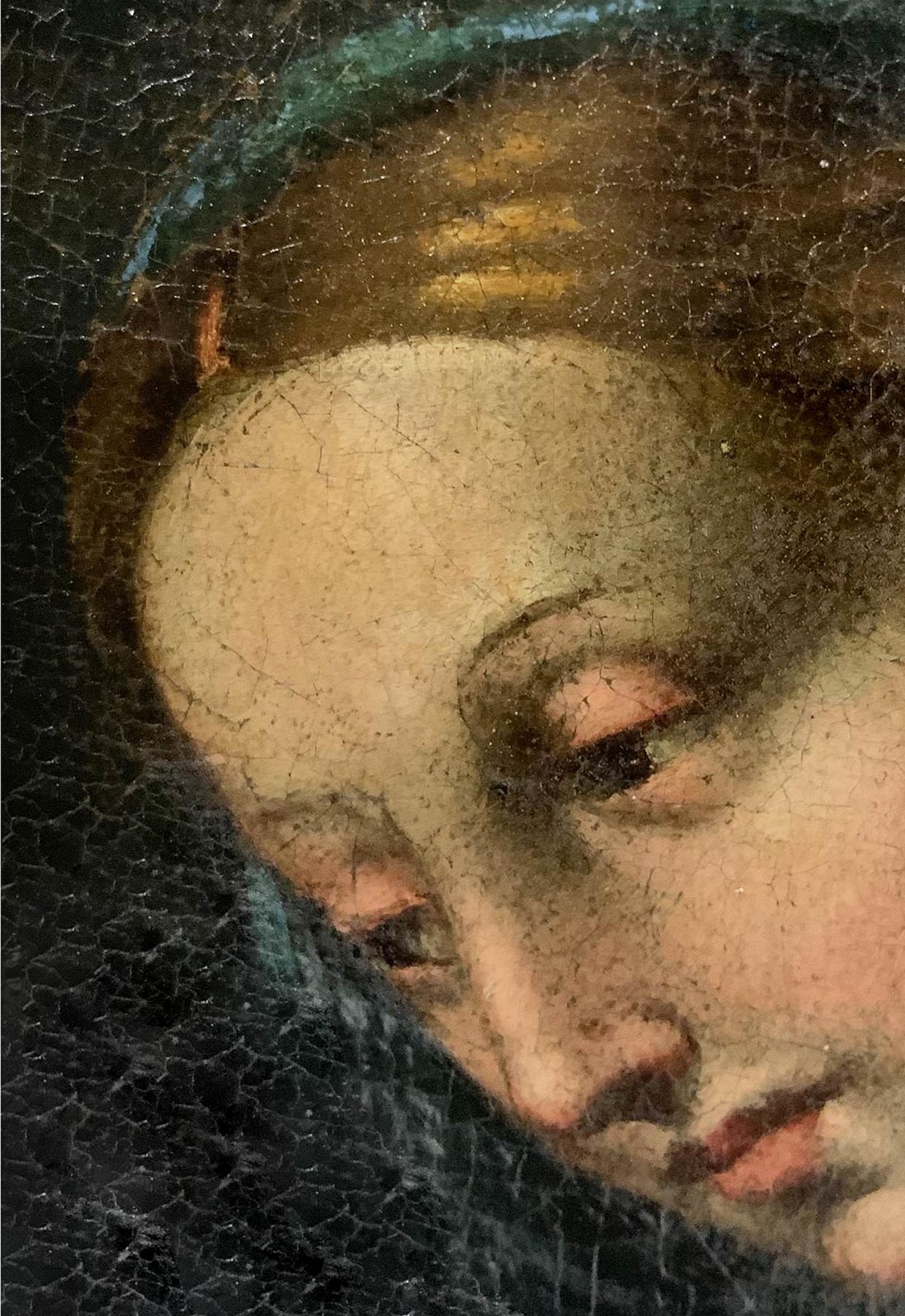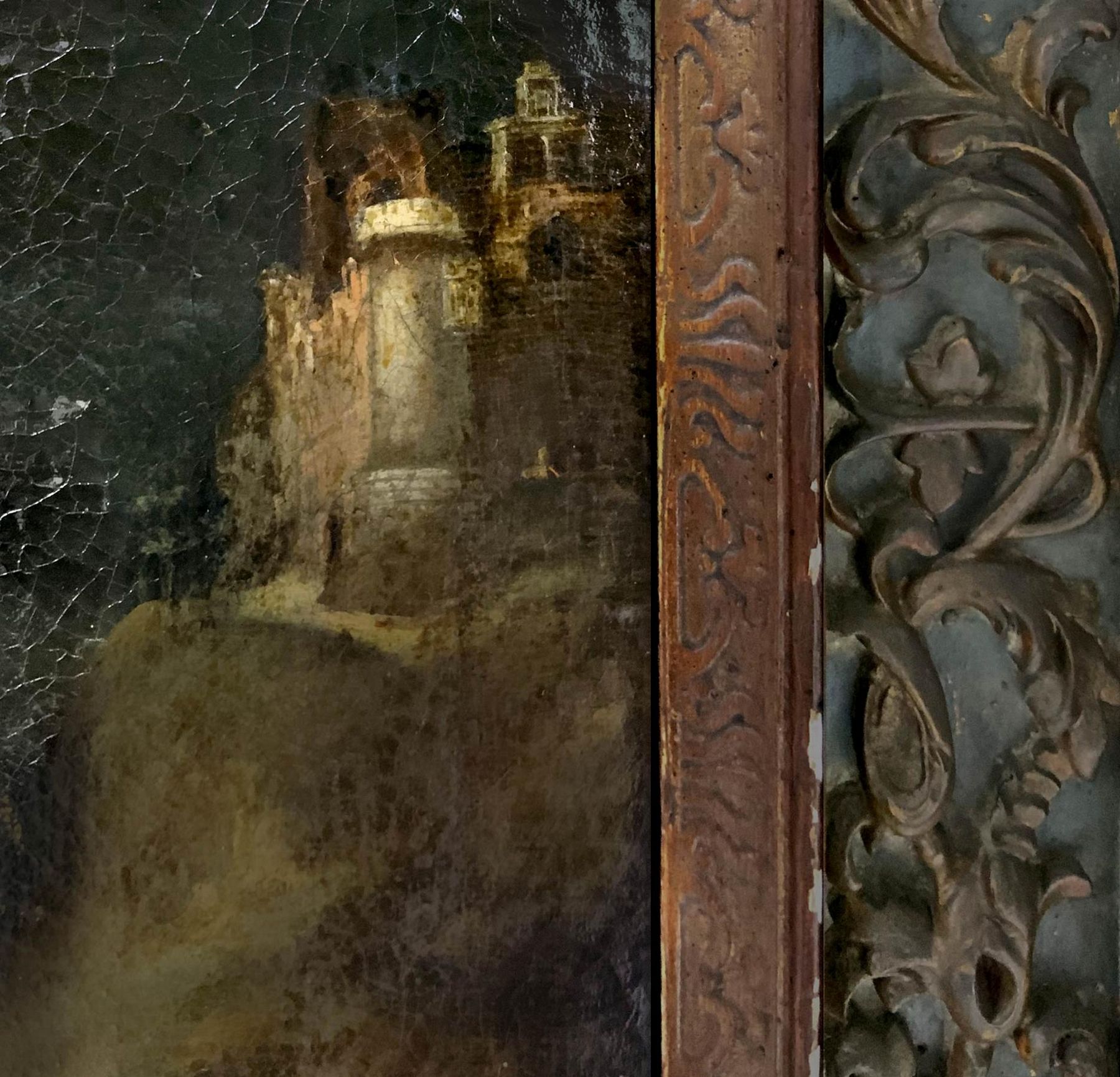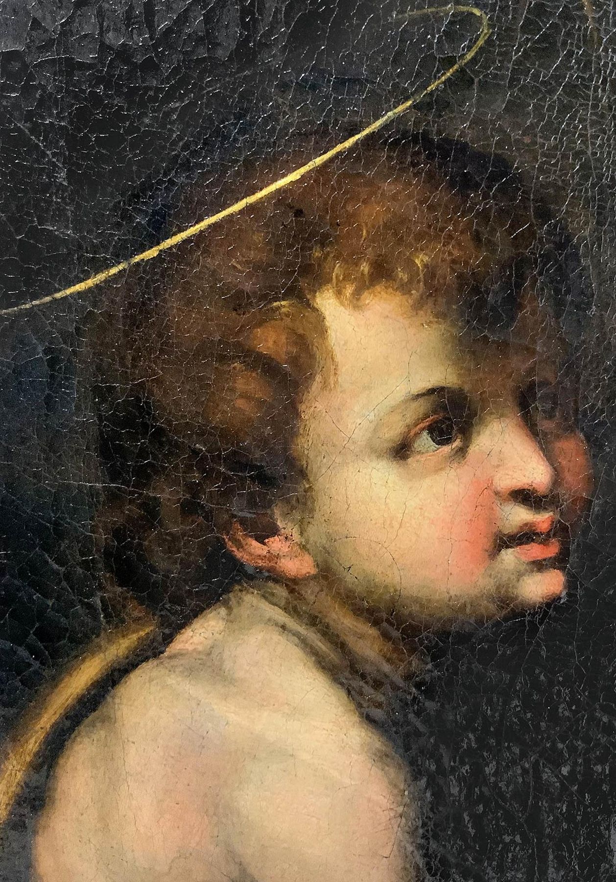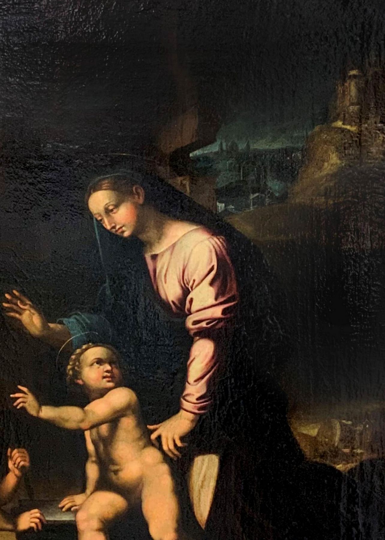 Pittore italiano del XVI secolo cerchia di Raffaello. Madonna con Gesù bambino e San Giovannino. Nell'opera i colori freddi usati, acquistano capacità tonale per la luce che all'imbrunire proviene dall'apertura dell'antro: il dipinto si spinge verso una ricerca di nuova libertà espressiva, esempio inconfutabile dell'arte manierista rinascimentale. 81x59, olio su tela. Opera in cornice. (Vecchia attribuzione a Giulio Romano del Prof. Edoardo Clerici Sella, membro dell'Accademia Tiberina (Roma ). Antica collezione del Principe Boncompagni Ludovisi (timbro in ceralacca sul retro)