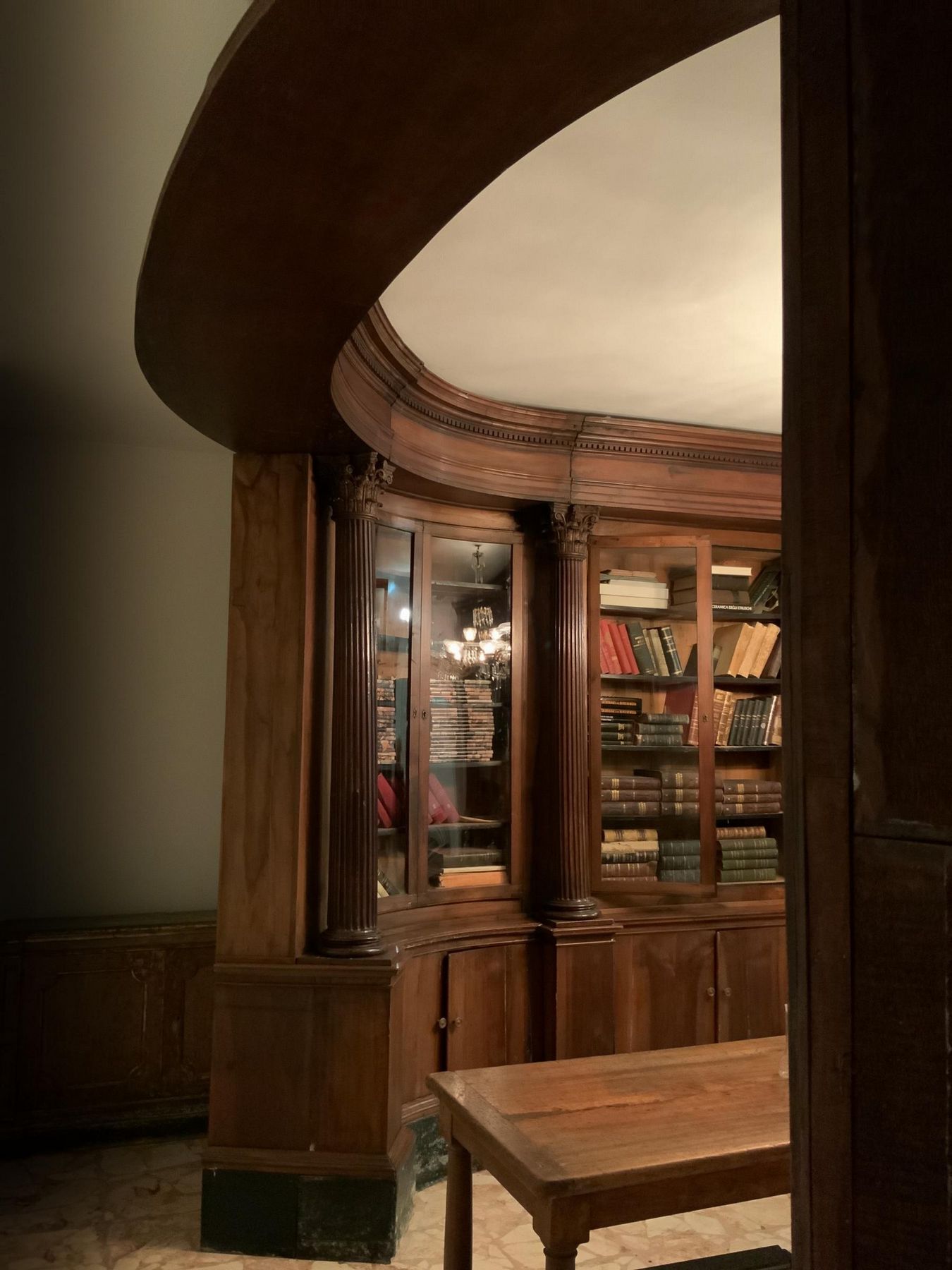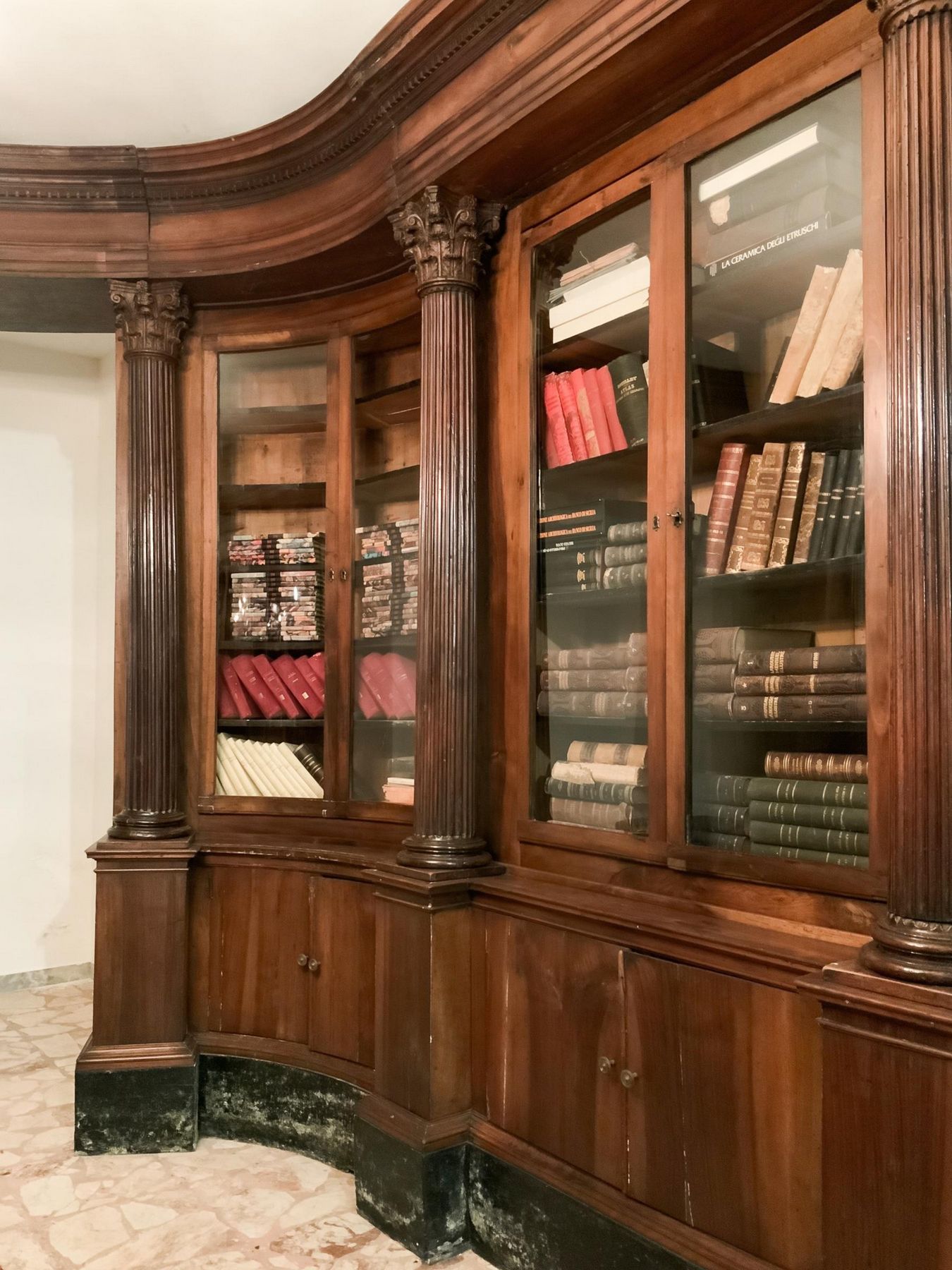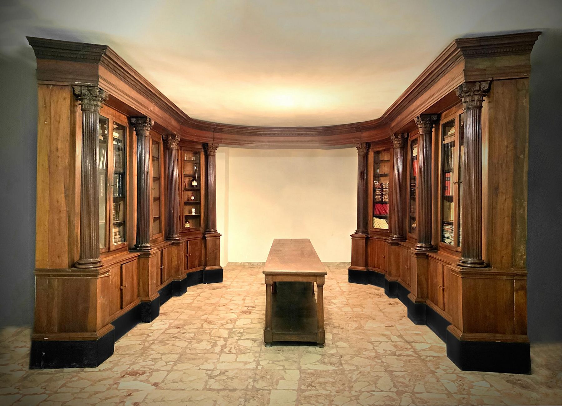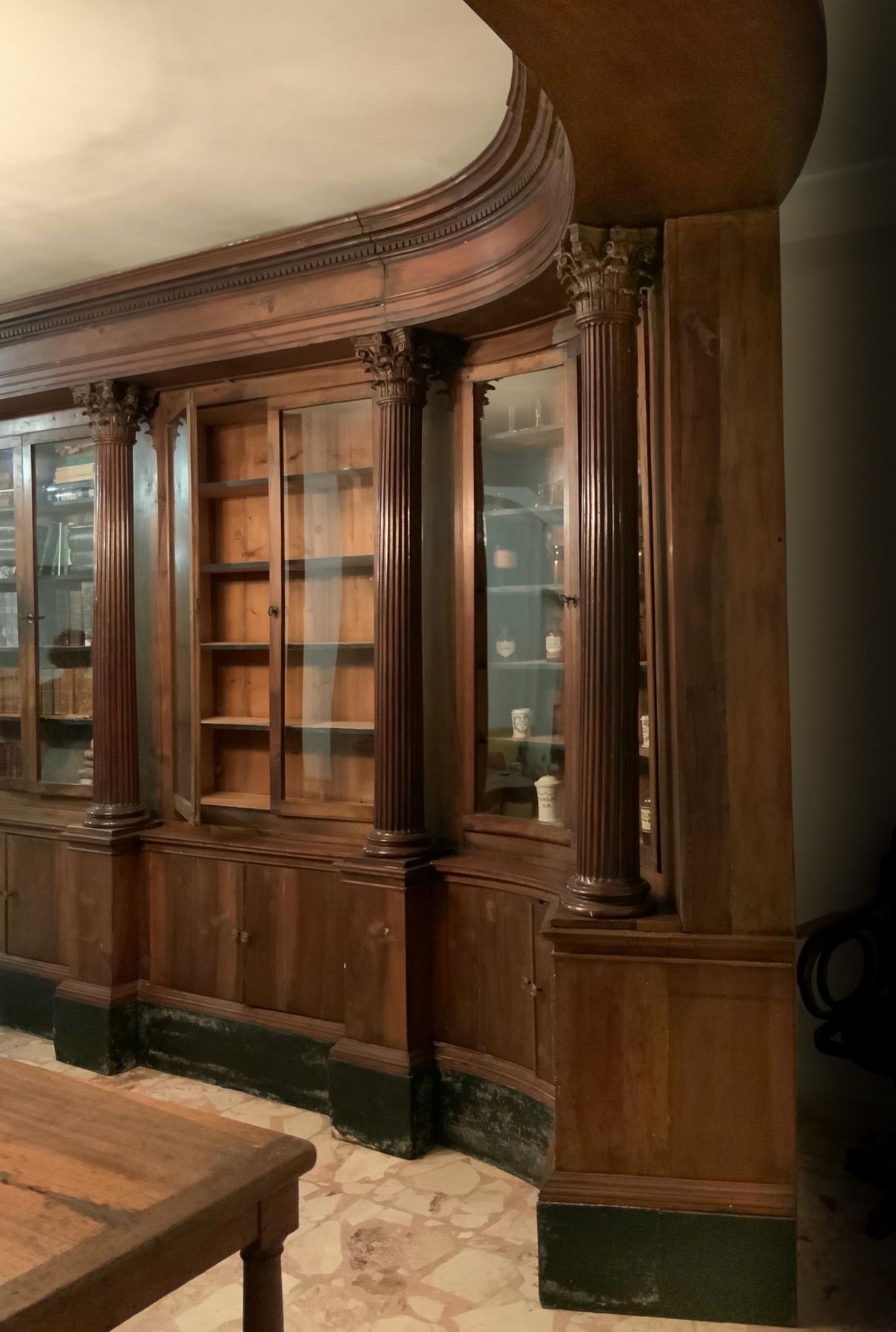 La libreria è composta da sei moduli, tre per lato, di cui l’ultimo curvo che con una trabeazione in testa si concorda con il lato opposto creando una forma semiellittica o a ferro di cavallo.