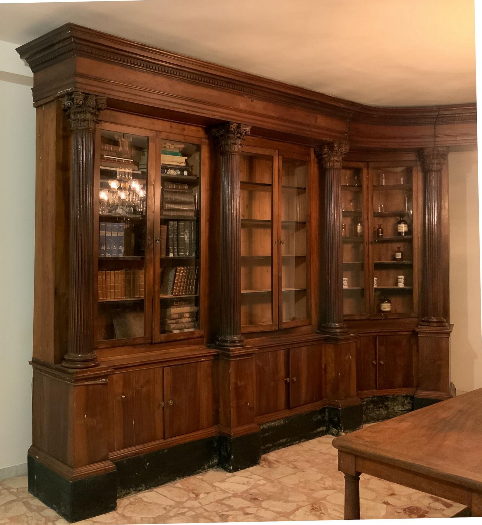 Antico e magnifico mobile di libreria-Boiserie in legno di noce massello di impronta neoclassica rinascimentale, XVIII secolo. Di origini Calatine già sita in palazzo prestigioso di Caltagirone e adesso presso studio di notaio, è un esempio unico di ebanisteria siciliana commissionata da nobile famiglia siciliana.