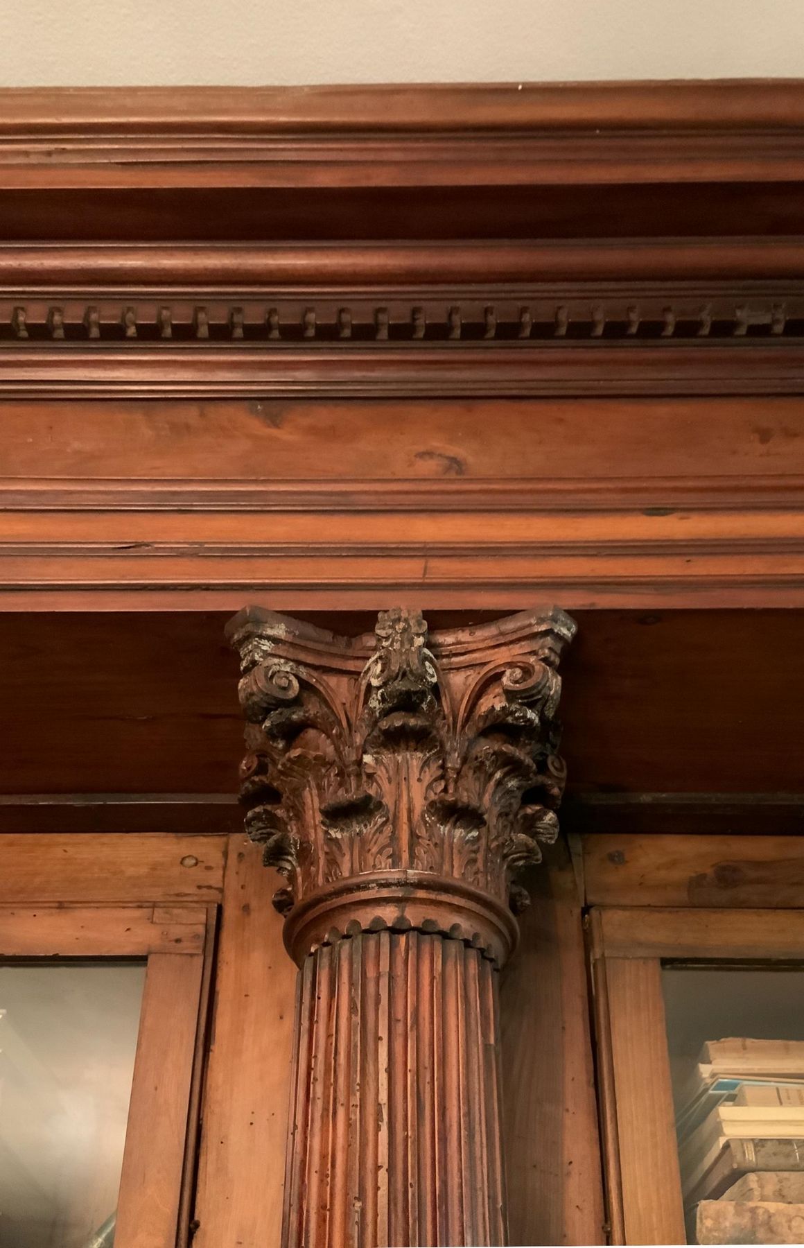 Numero otto colonne di ordine corinzio scanalate, quattro per lato H cm 175 di eccellente qualità scultorea, abbelliscono i prospetti laterali dando volume e decoro a tutta la composizione lignea della libreria.