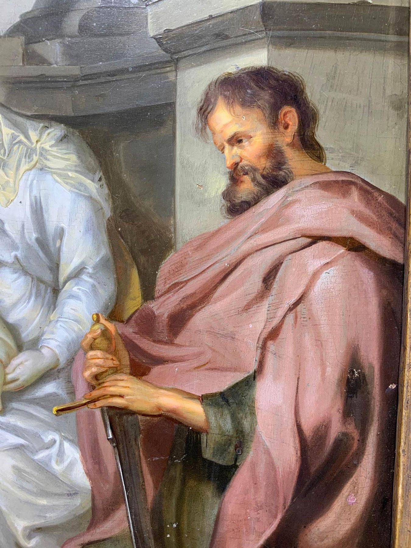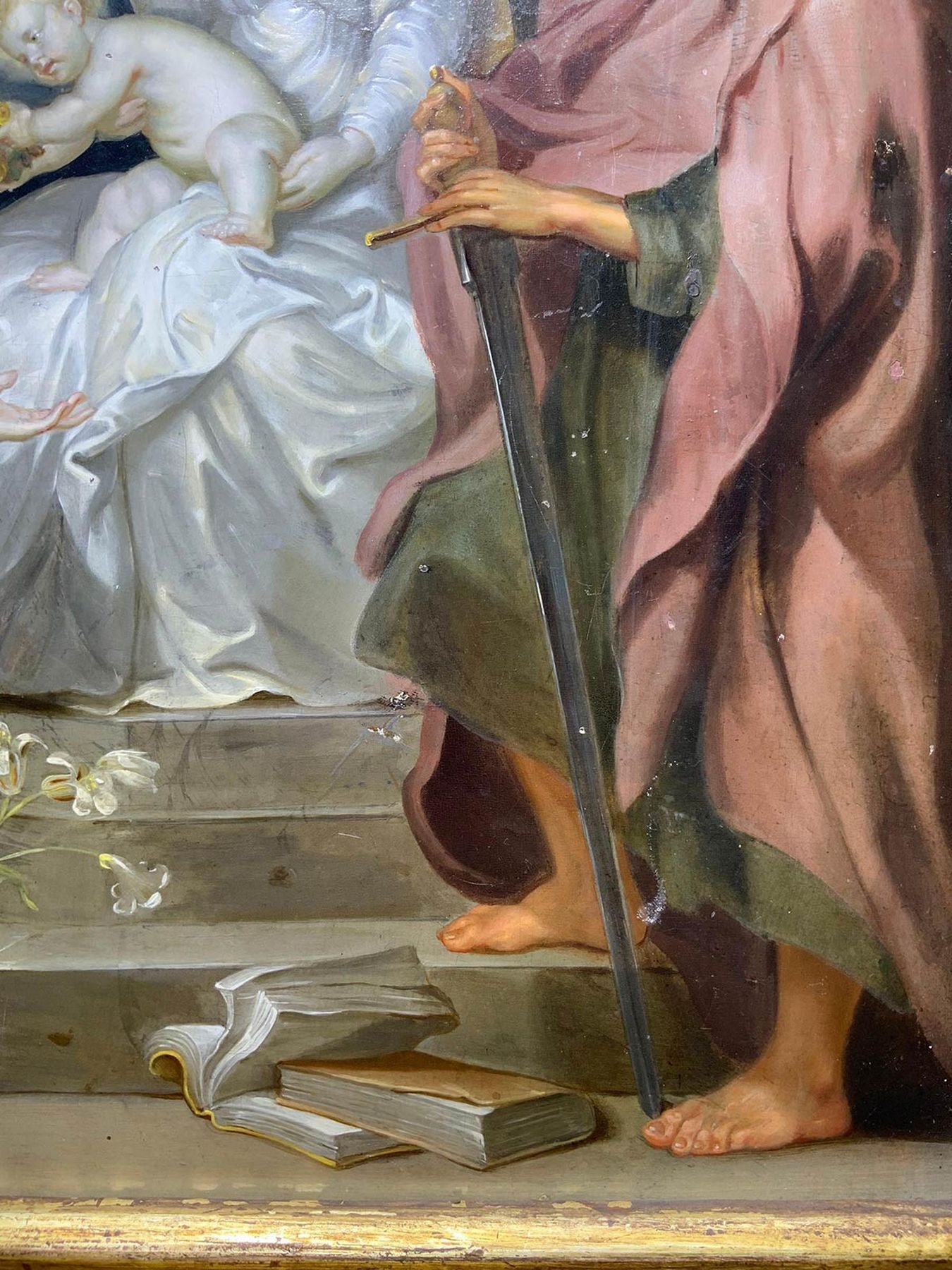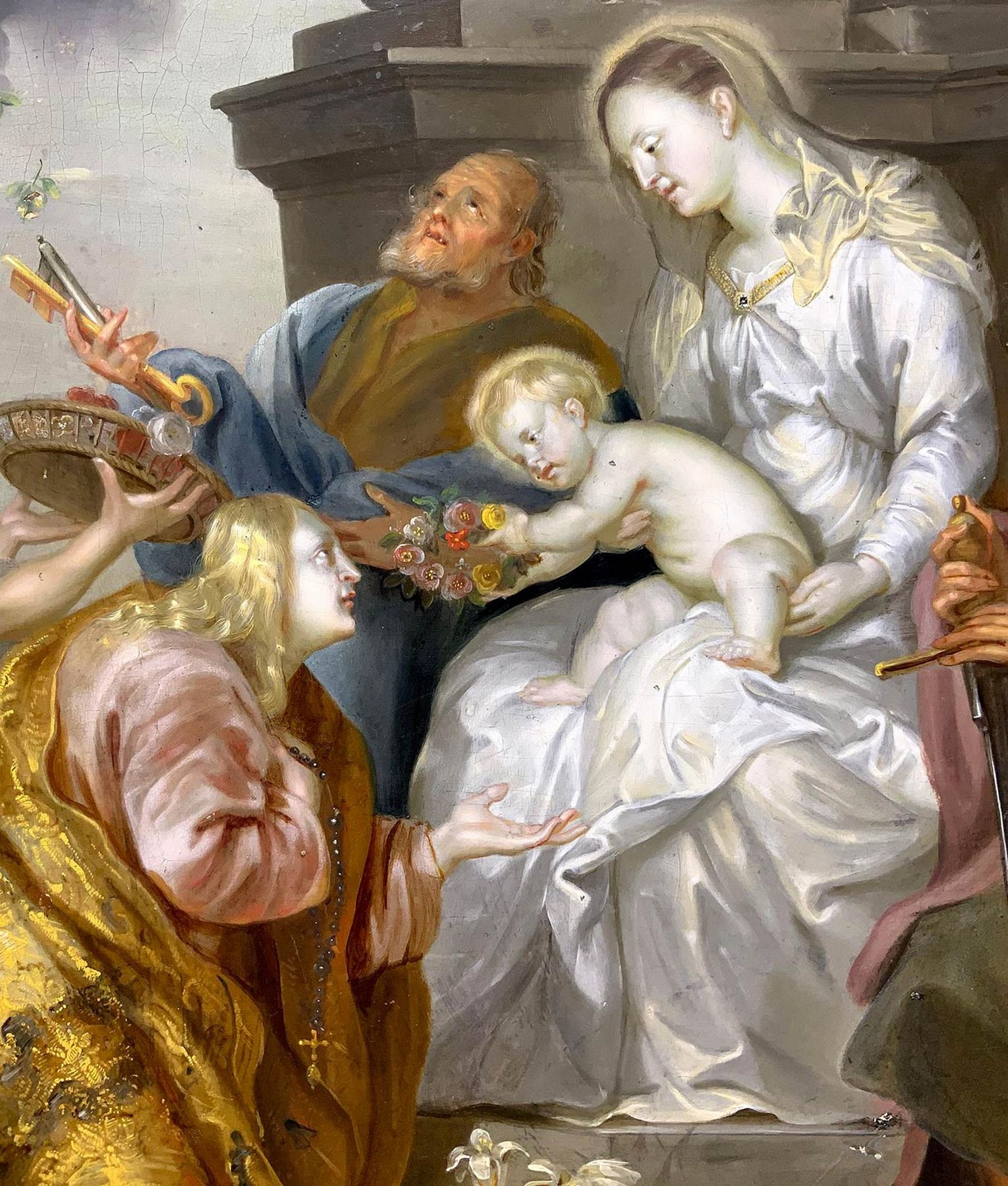 Dipinto ad olio su tavola di Rovere raffigurante Santa Rosalia con Madonna e Gesù Bambino e Santi Pietro e Paolo a latere, pittore fiammingo del XVII Secolo. Riferimento alla pala da Antoon van Dyck presente al Kunsthistorisches Museum (Vienna). 43x35, Olio su tavola di rovere.