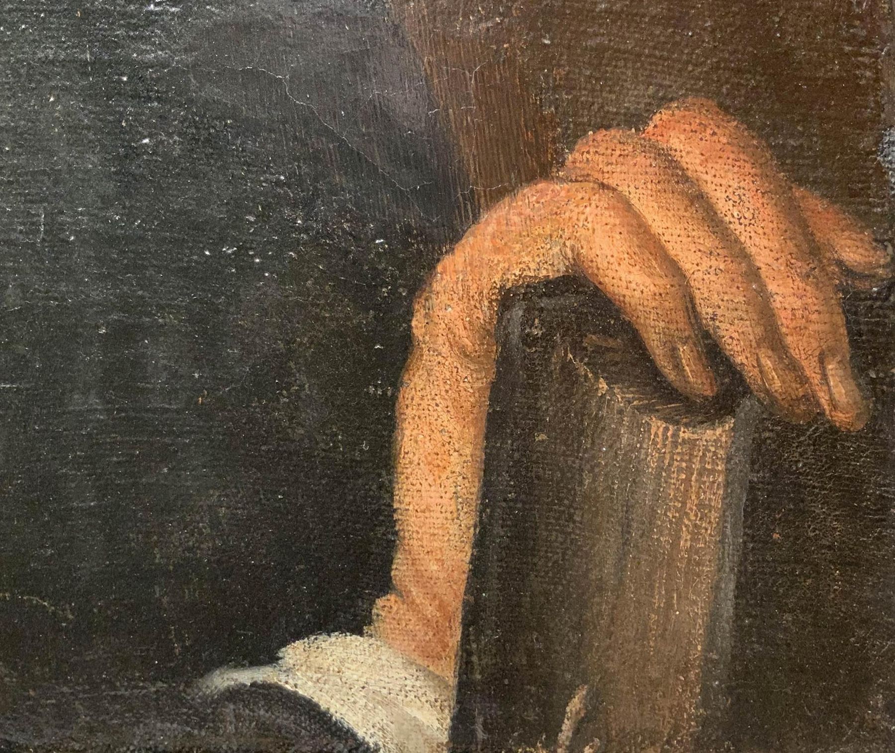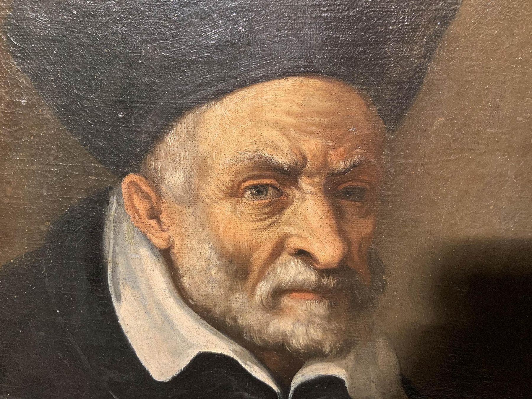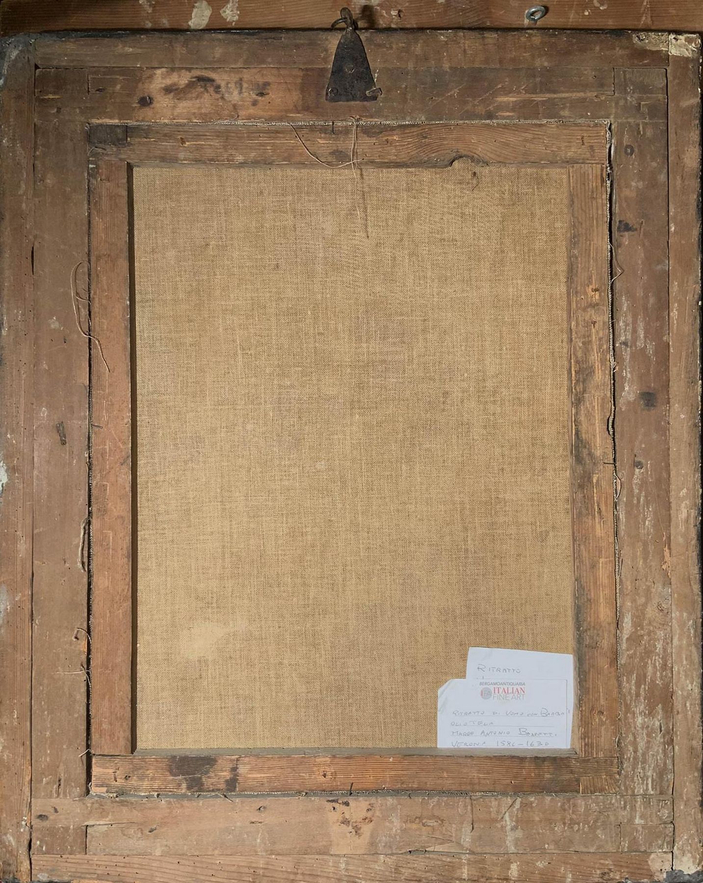 Marco Antonio Bassetti (Verona 1586-1630), attrib. Ritratto di uomo con barba con in mano un libro. 65x55, Olio su tela, in cornice 85x75. "Allievo di Felice Ricci ( Verona 1539- 1605) si trasferisce a Venezia dove è influenzato dalle opere di Tintoretto, di Veronesi e Jacopo Bassano, va a Roma, intorno al 1615, e conosce i dipinti di Caravaggio. Rientrato a Vaenezia declina gli influssi bassaniani e romani ed ha apprezzamenti solo per la pittura veneziana, soprattutto per i naturisti. Orbita nell'ambito dei monasteri e dei conventi (1628). In questo periodo le sue opere più apprezzabili sono i ritratti nei quali, a giudizio del Longhi (1959), è di un valore e di una dignità rembrandtiana, tale da potersi misurare con Hals e Velazquez. Morì di peste a Verona. La rivalutazione del Bassetti è dovuta in gran parte al Longhi."ASORstudio