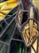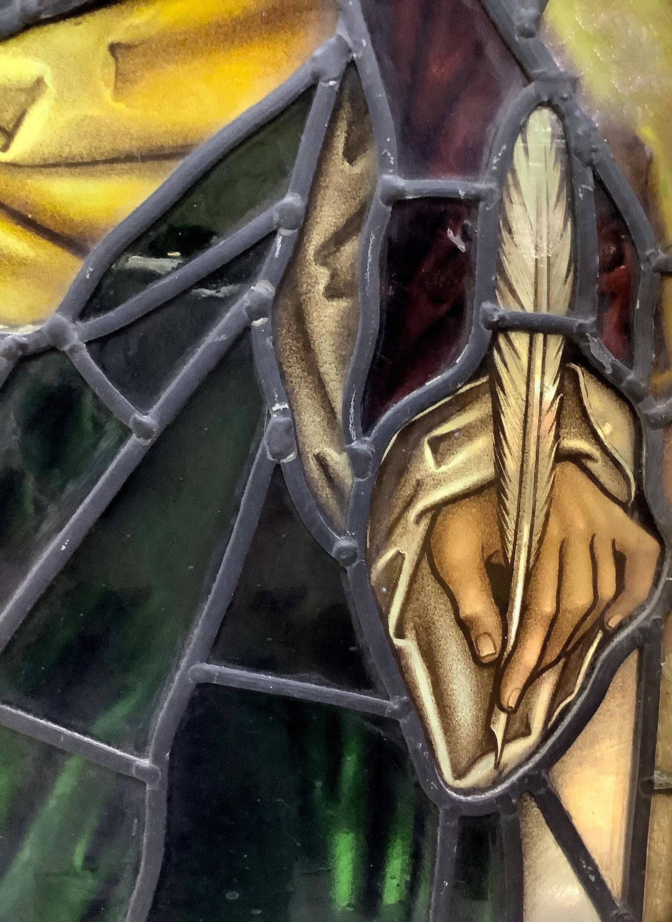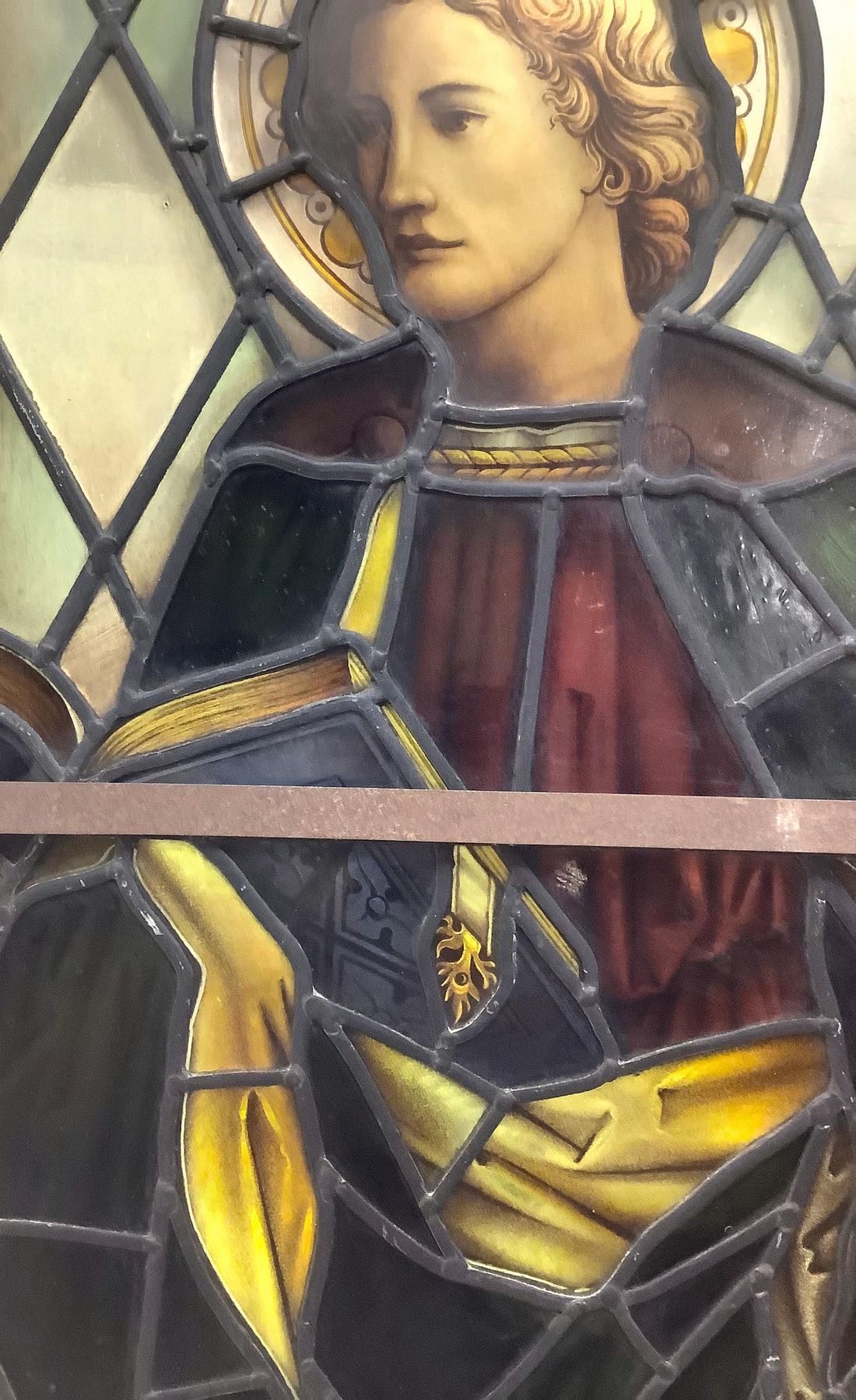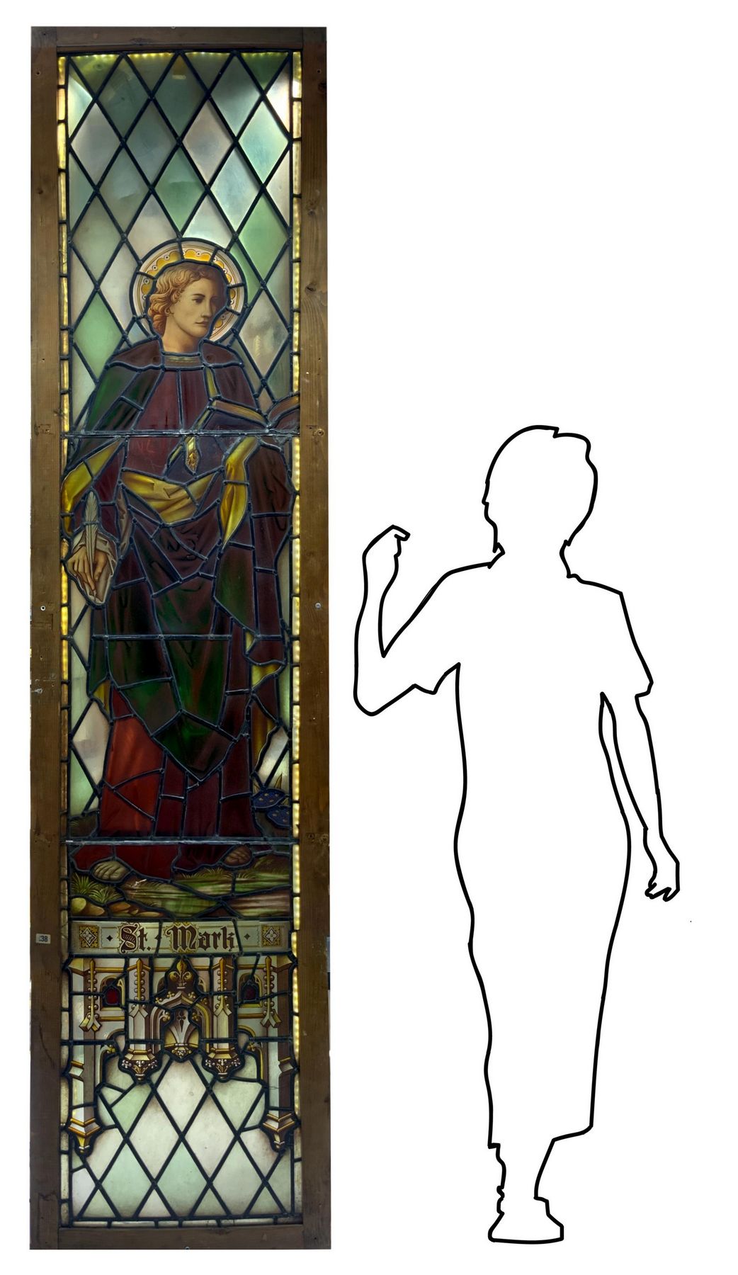 Antica vetrata rilegata a piombo con immagini a infusione nel vetro raffigurante San Mark, l'Evangelista. In telaio in legno, larga cm 6.H cm 255. Larghezza cm 60. Retroilluinata.