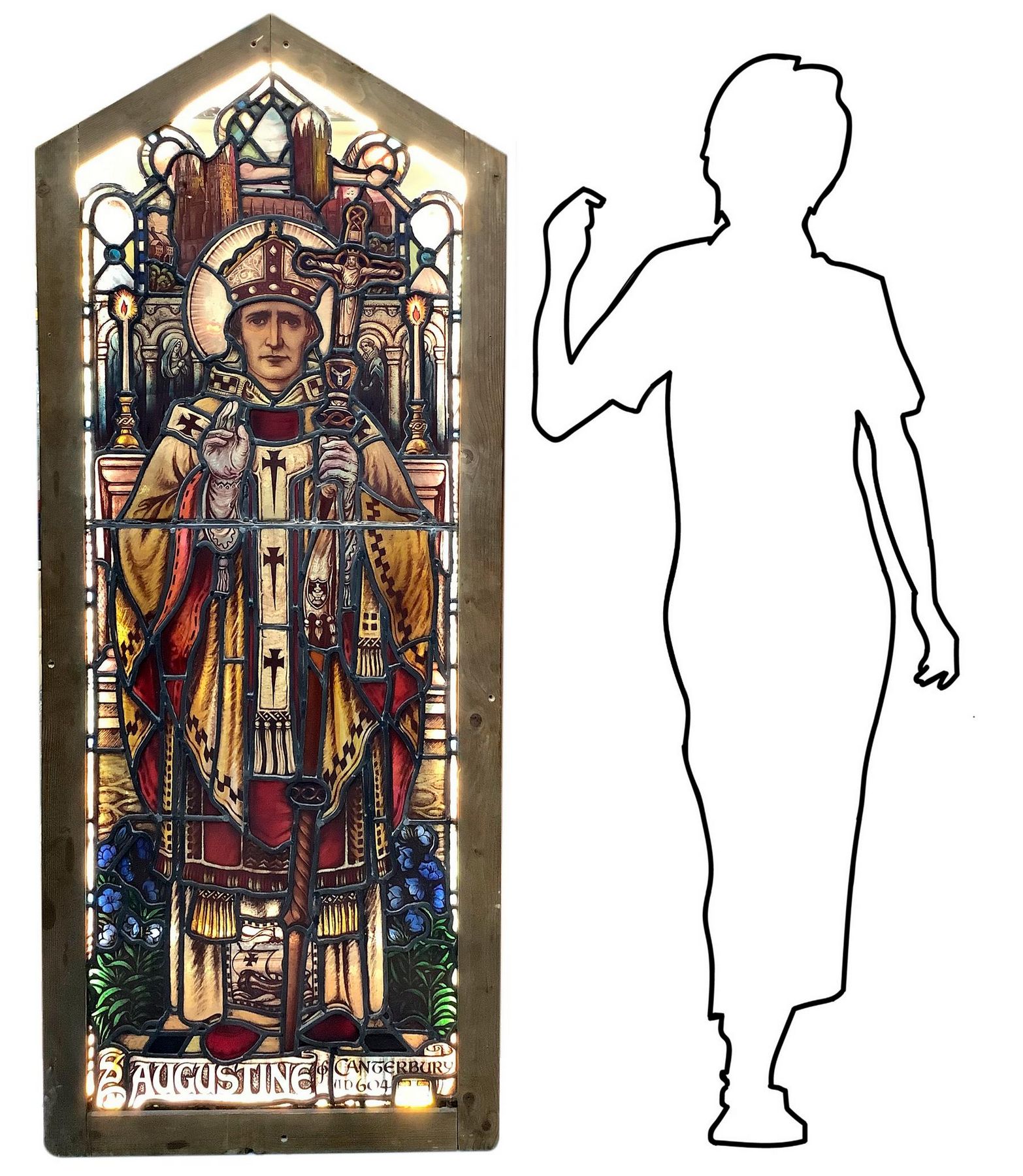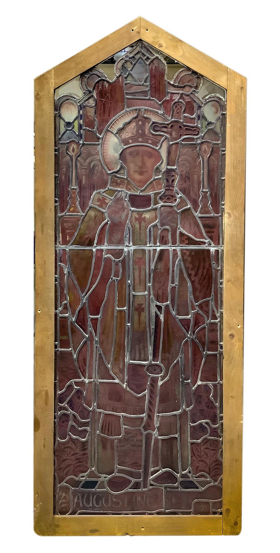 Antica vetrata rilegata a piombo con immagini a infusione nel vetro raffigurante Sant Augustine. In telaio in legno, larga cm 6. H cm 169. Larghezza cm 67. Piccole rotture.