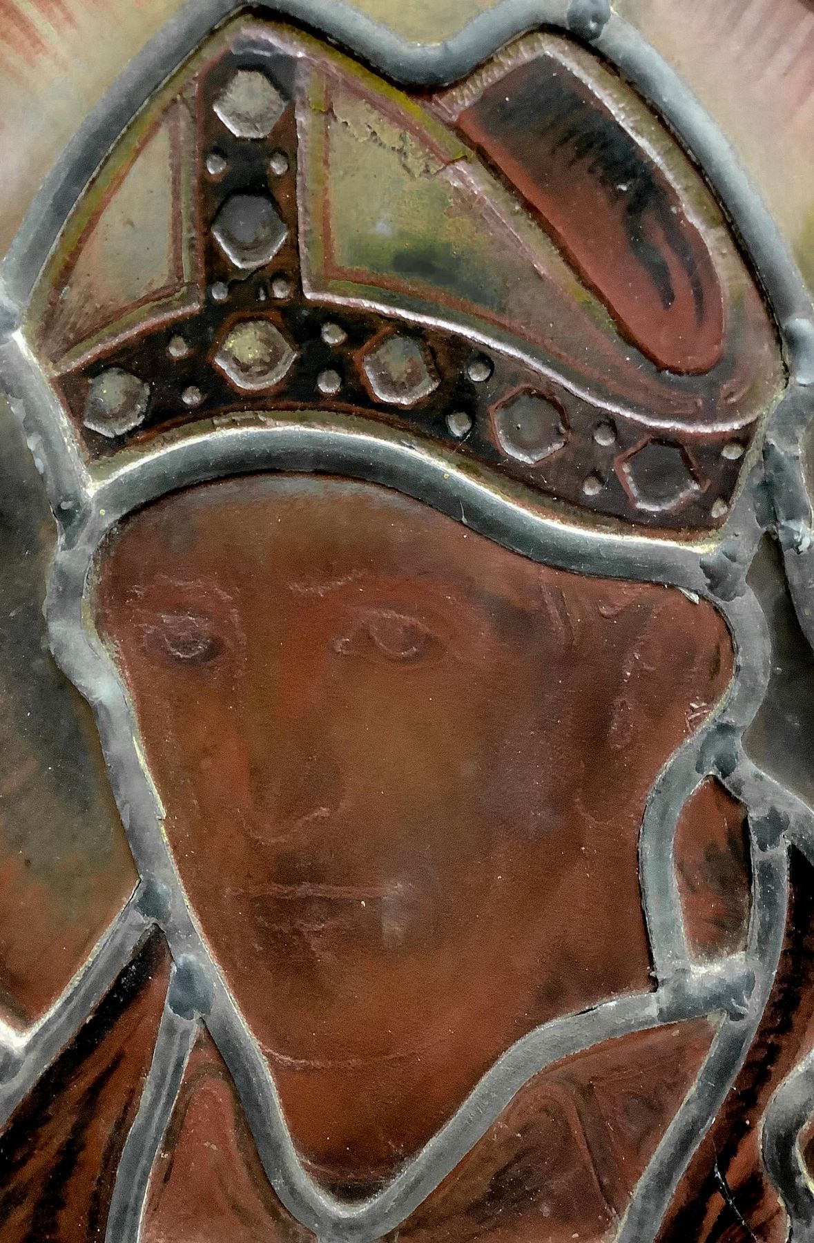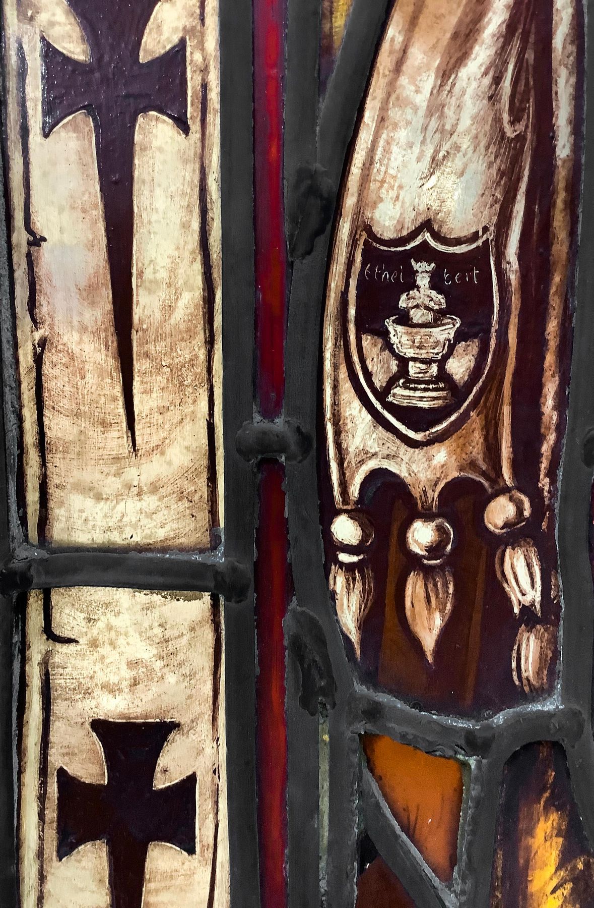 Antica vetrata rilegata a piombo con immagini a infusione nel vetro...