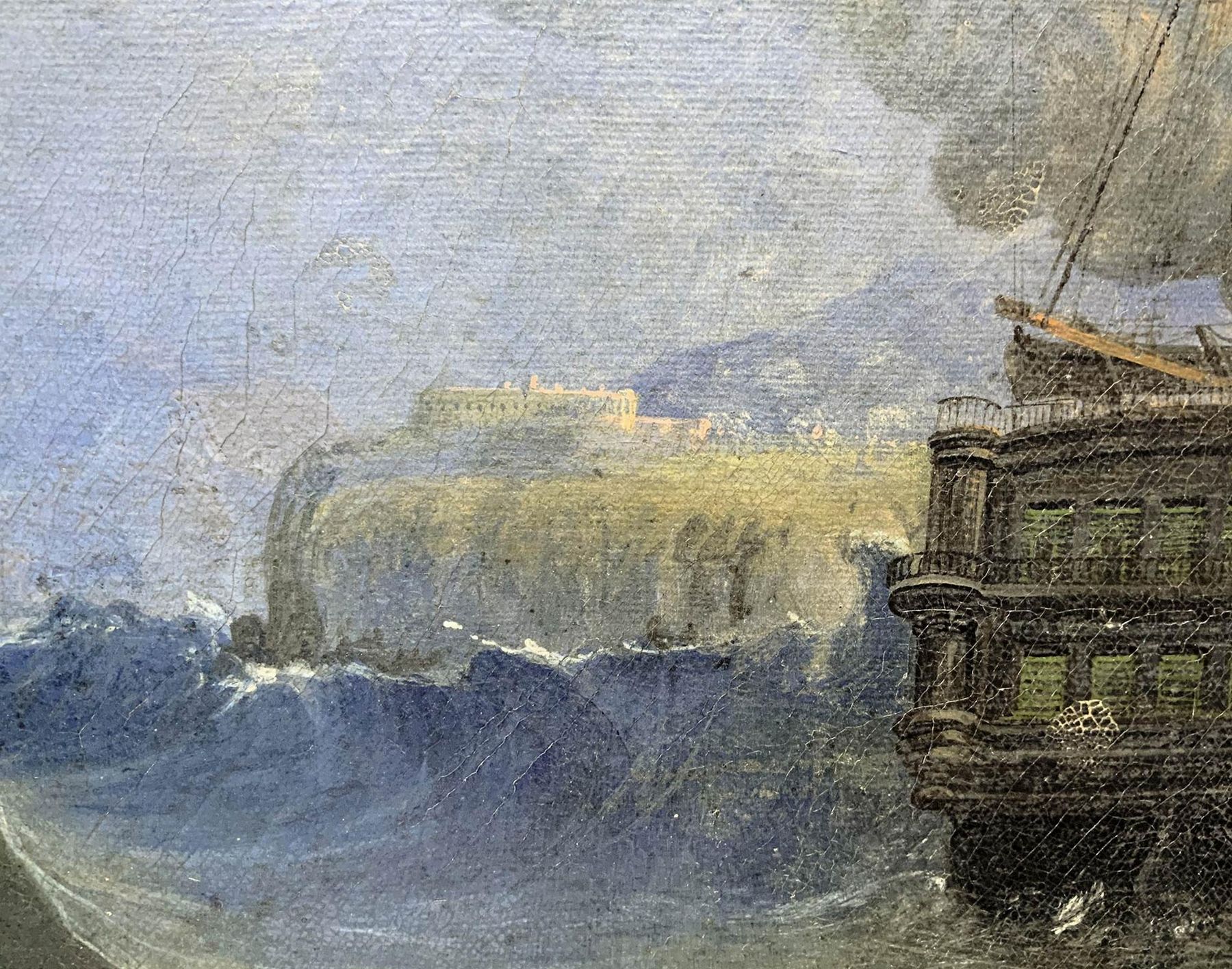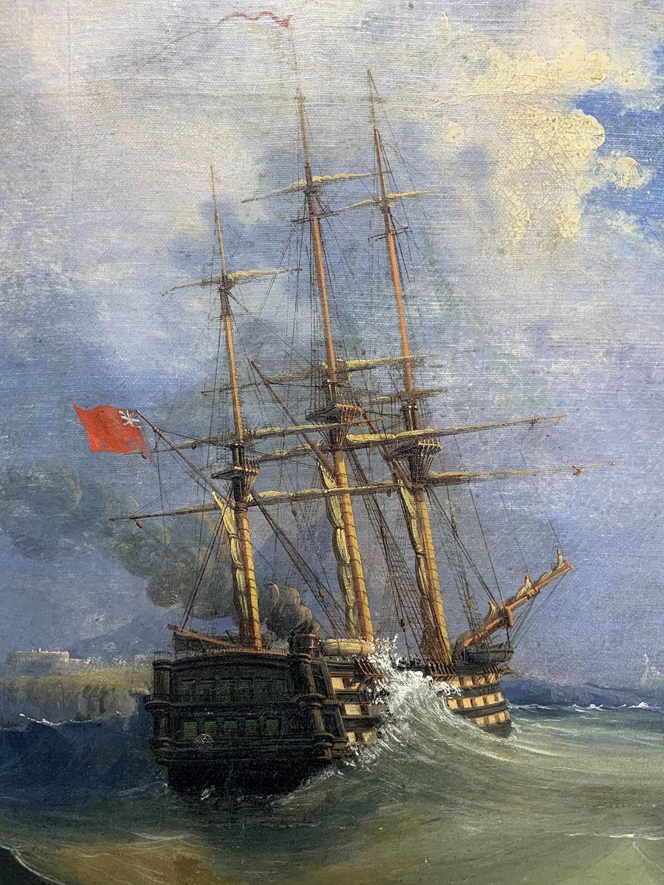 Dipinto ad olio su tela raffigurante veliero a tre alberi, fine XVIII secolo....