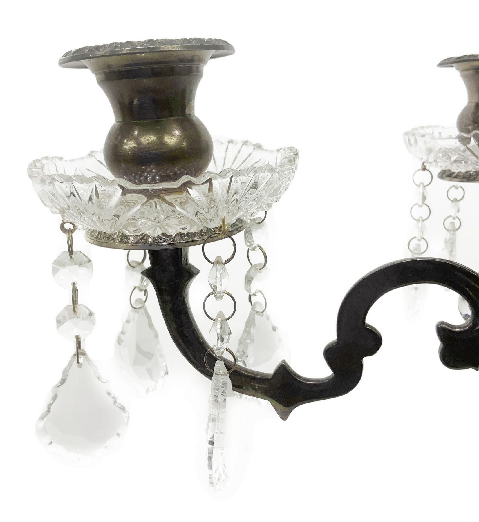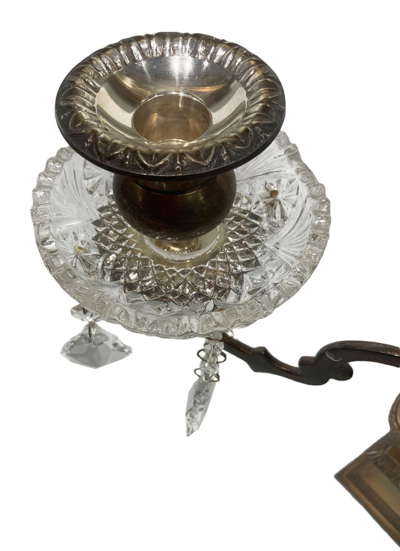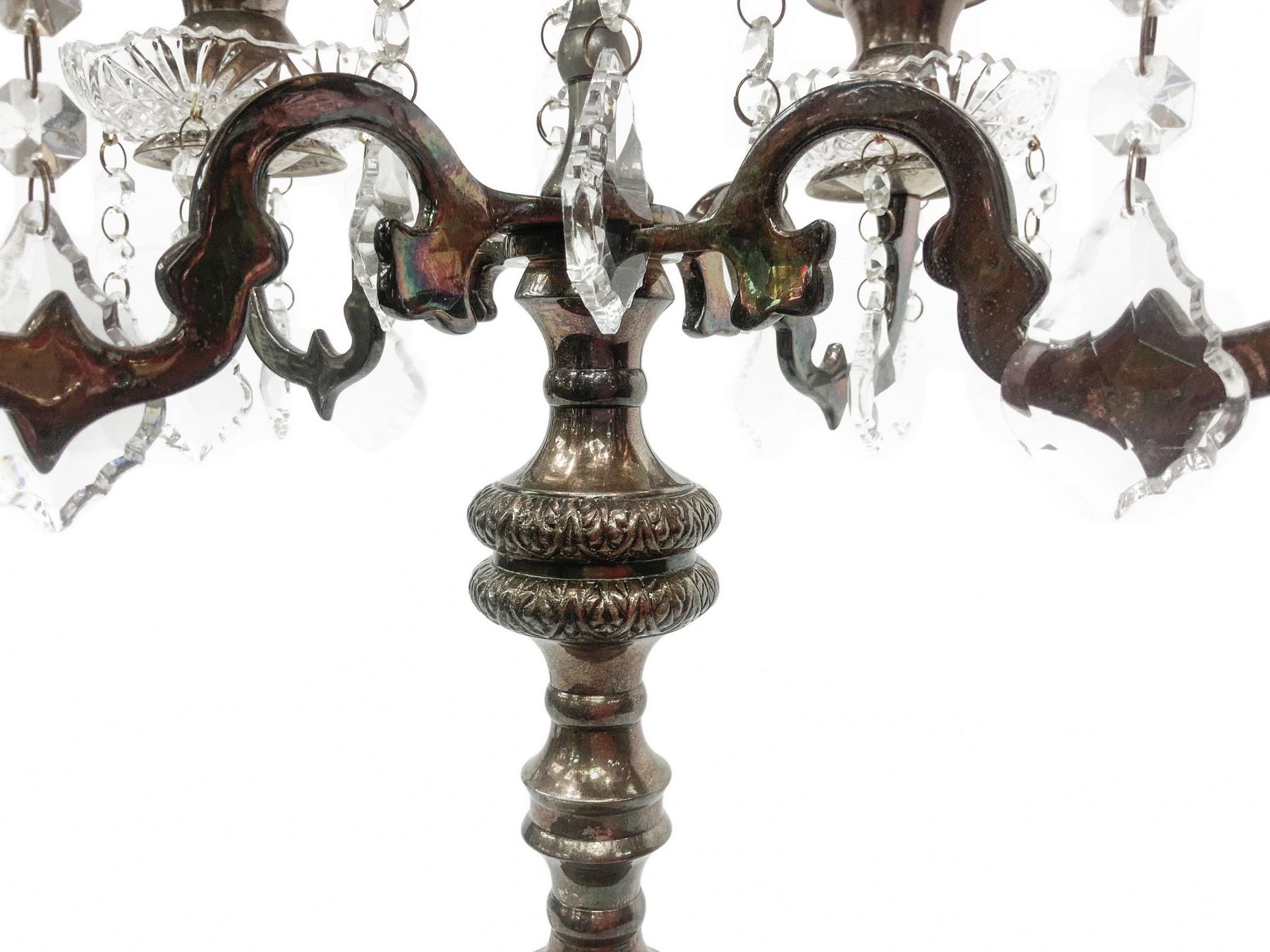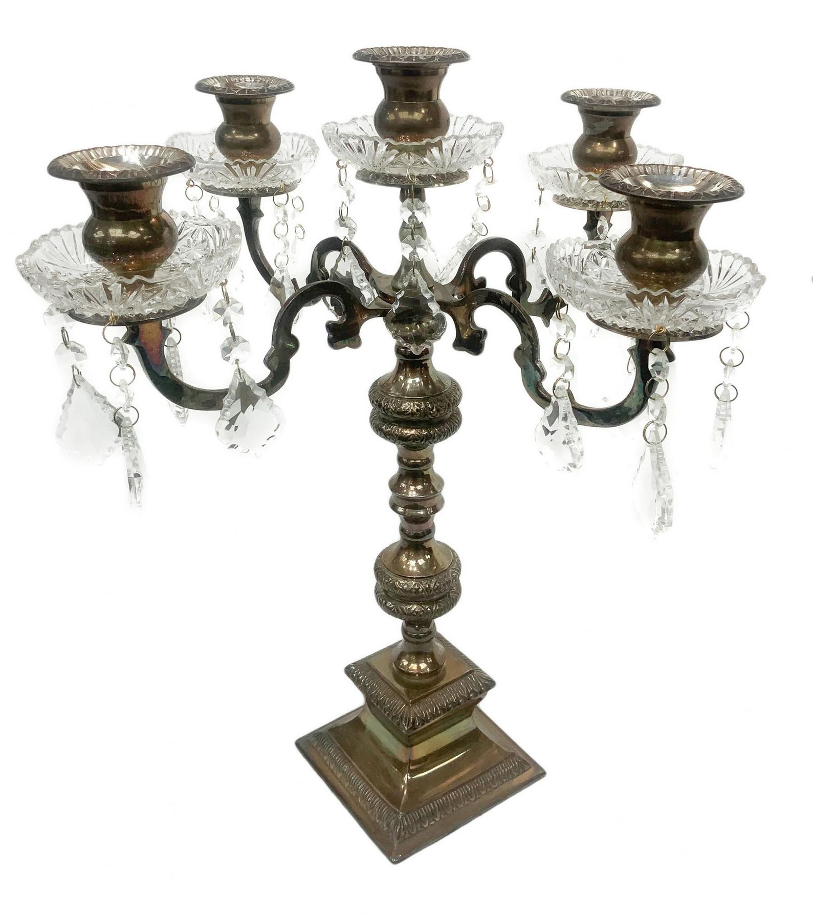 Coppia di candelieri in royal shieffiled (Inghilterra), cinque luci, XX secolo. Base quadrata con brindoli e piattini in vetro molato. H cm 48