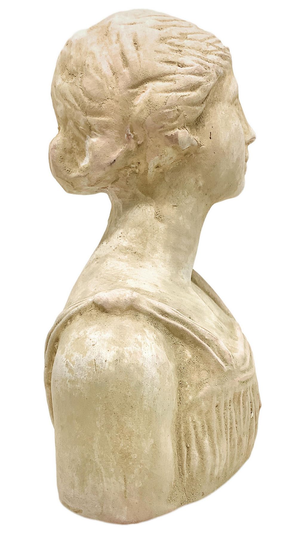 Mezzobusto in terracotta raffigurante donna con drappo sulla spalla, matrona...