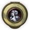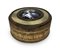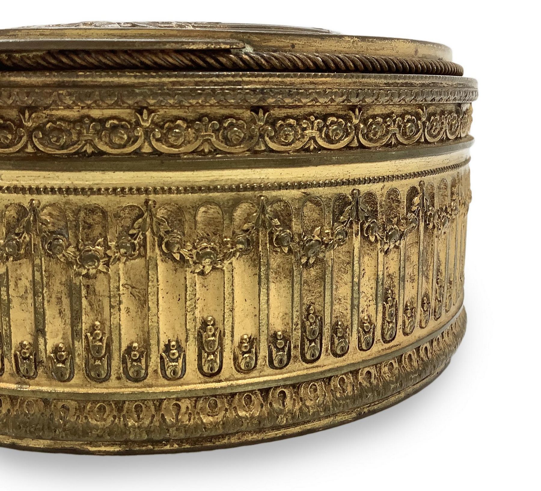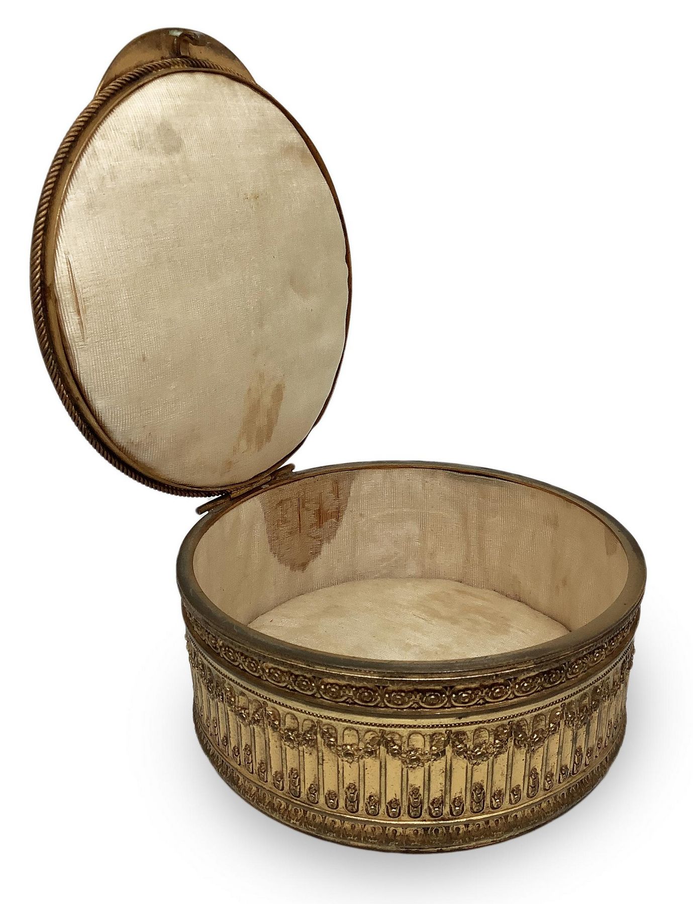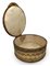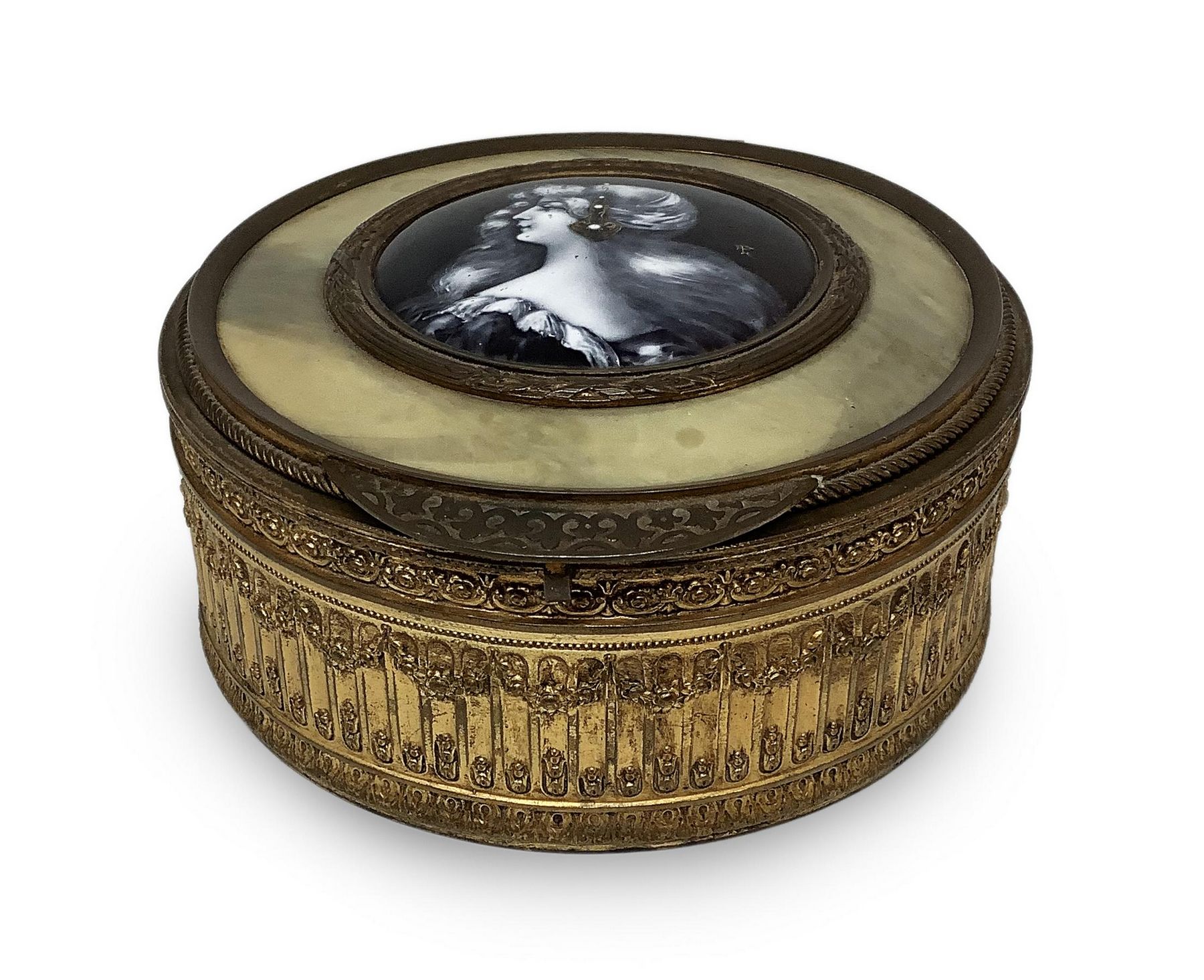 Portagioie in metallo dorato, XIX secolo. Sul coperchio rame smaltato Limoges in porcellana raffigurante figura femminile. Diametro cm 13. H Cm 6