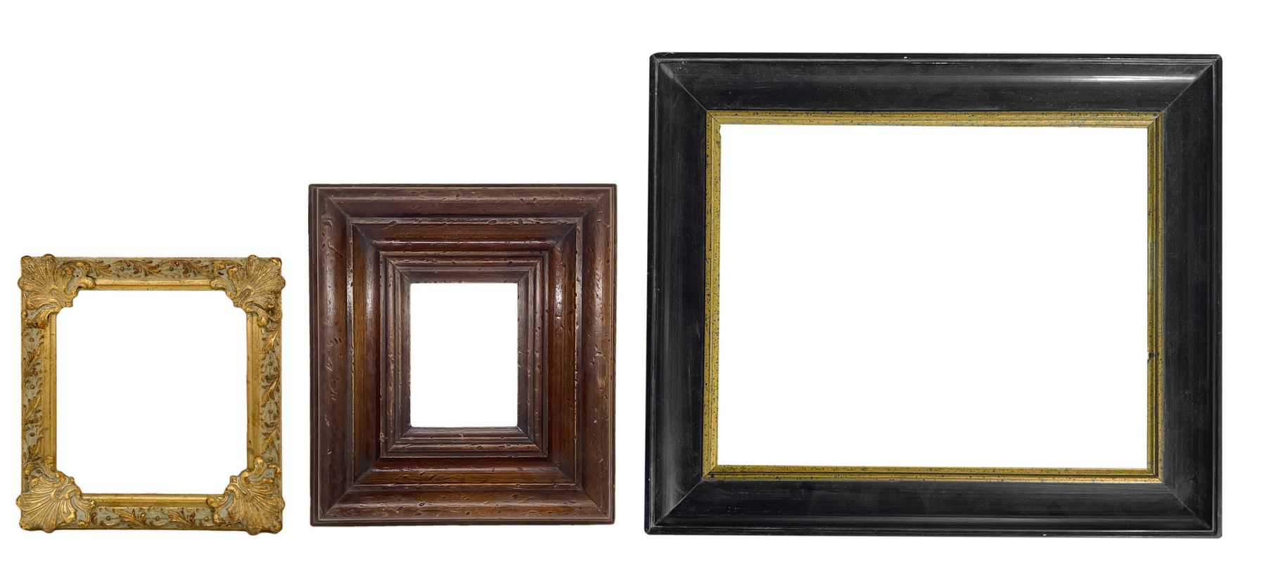 Gruppo di n. 3 cornici. 1- Cornice in legno di colore nero perfilo dorato interno. Misure interne cm 24,2x30,2. Misure esterne cm 32x38. 2 Piccola cornice in legno marrone. Misure interne cm 13x10. Misure esterne cm 28,8x26.3). Piccola cornice in legno dorata. Misure interne cm 16,7x15,1. Misure esterne cm 20,7x19,2.
