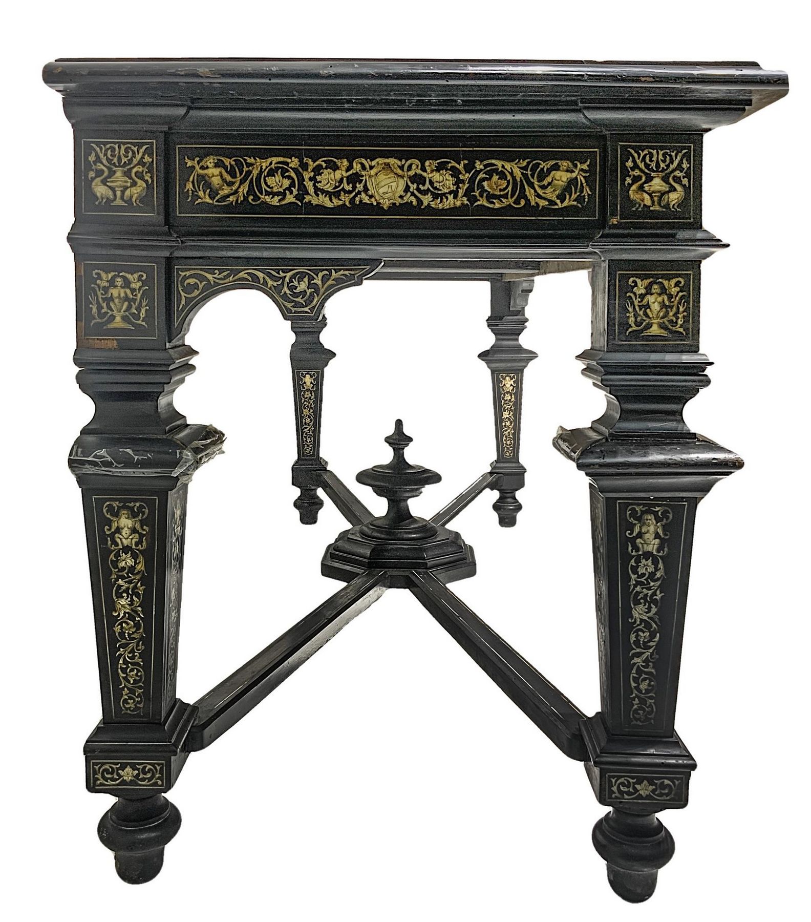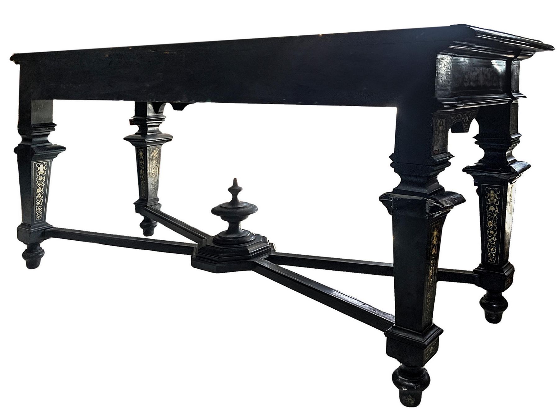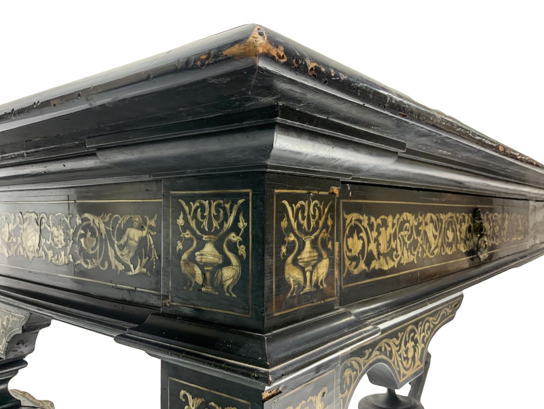 Console, Ferdinando Pogliani Milano(Milano, 1832 -1899, Milano). Console a due cassetti e piani segreti sopra i cassetti da usare come scrittoio. In legno nero ebanizzato e intarsi a grottesche e ghirlande in avorio ai piedi troncopiramidali e sulle fasce laterali e anteriori del piano. Piano incorniciato con intarsi perimetrali e al centro grande riquadro con putti e amorini. H cm 90. Cm 201x74.