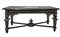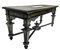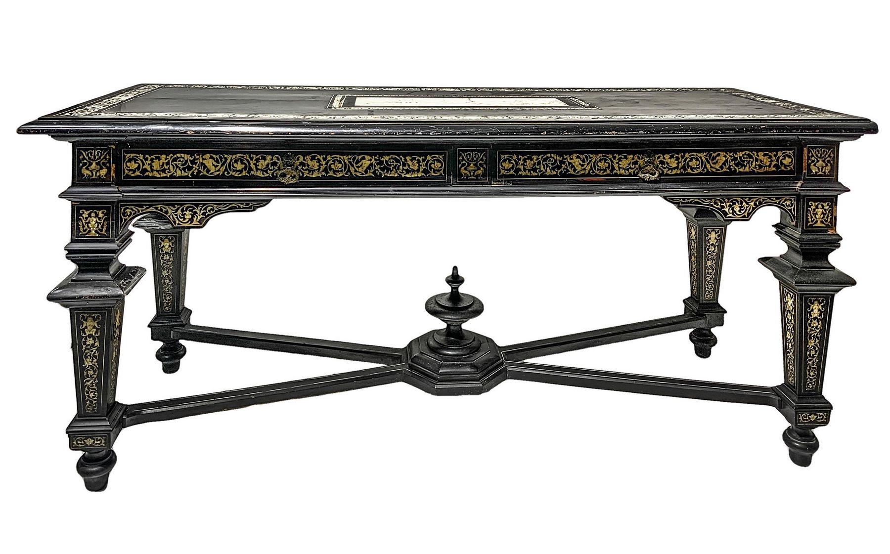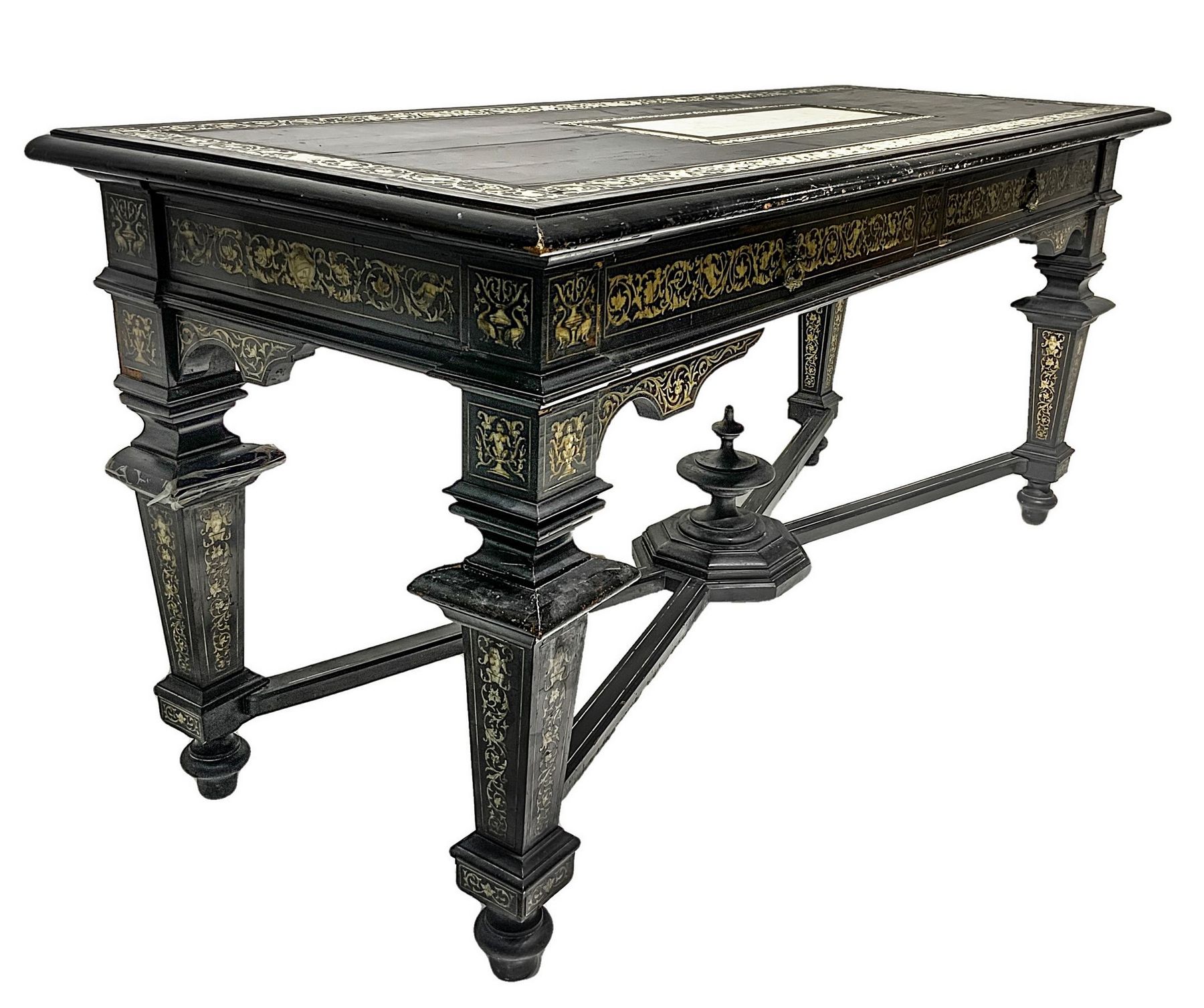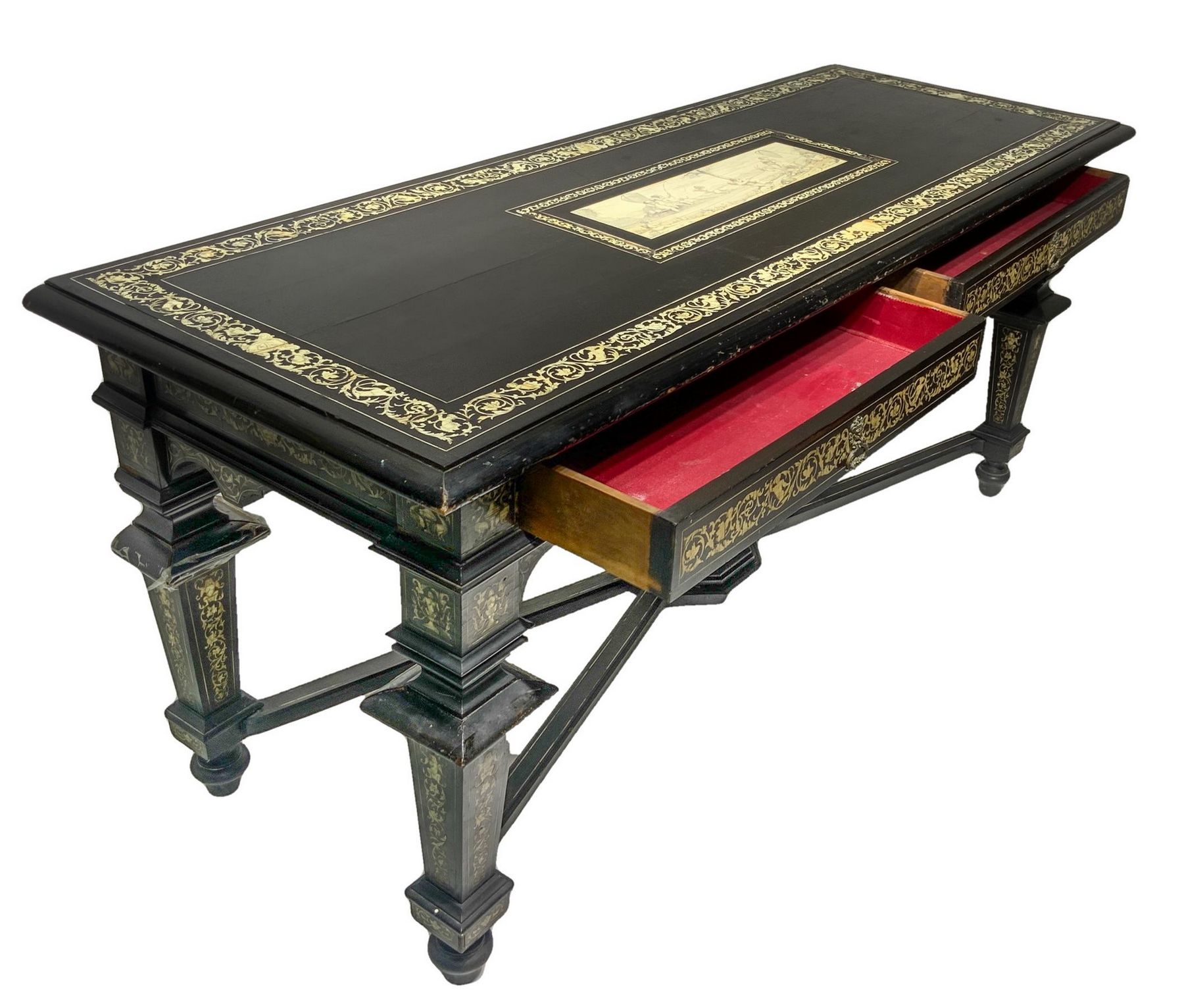 Console, Ferdinando Pogliani Milano(Milano, 1832 -1899, Milano). Console a due cassetti e piani segreti sopra i cassetti da usare come scrittoio. In legno nero ebanizzato e intarsi a grottesche e ghirlande in avorio ai piedi troncopiramidali e sulle fasce laterali e anteriori del piano. Piano incorniciato con intarsi perimetrali e al centro grande riquadro con putti e amorini. H cm 90. Cm 201x74.