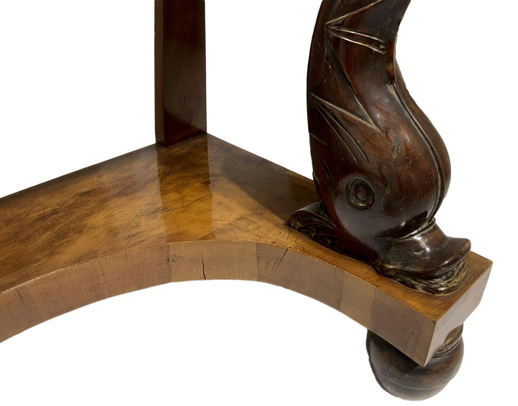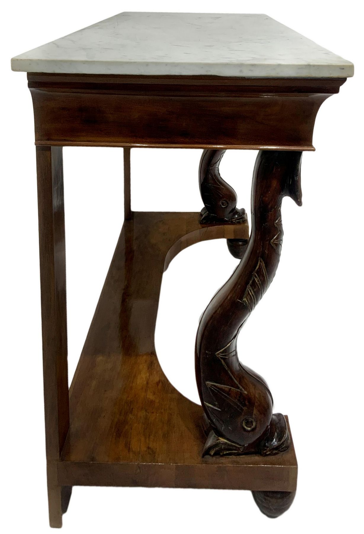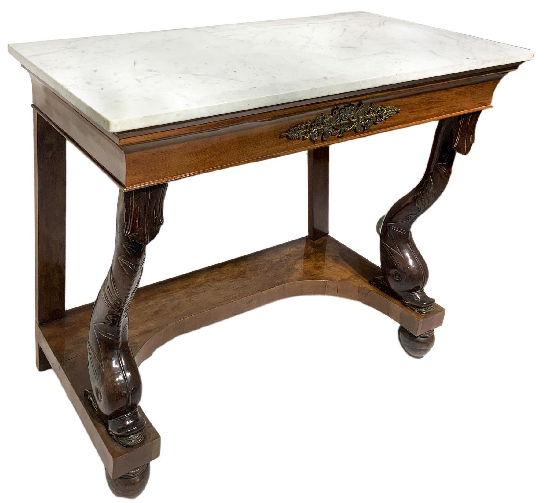 Lot 124 | Console in legno di noce, inizi secolo XIX. Con piedi a delfino, marmo al...