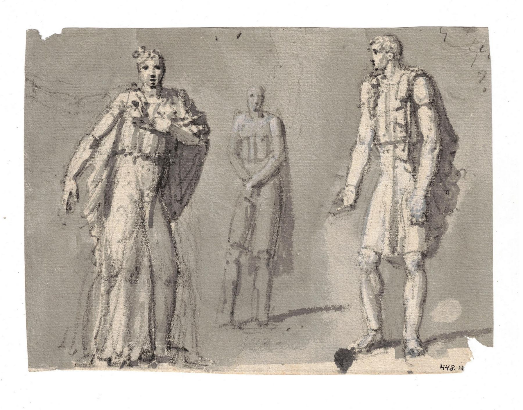 Disegno a inchiostro grigio su carta vergellata raffigurante tre personaggi,...