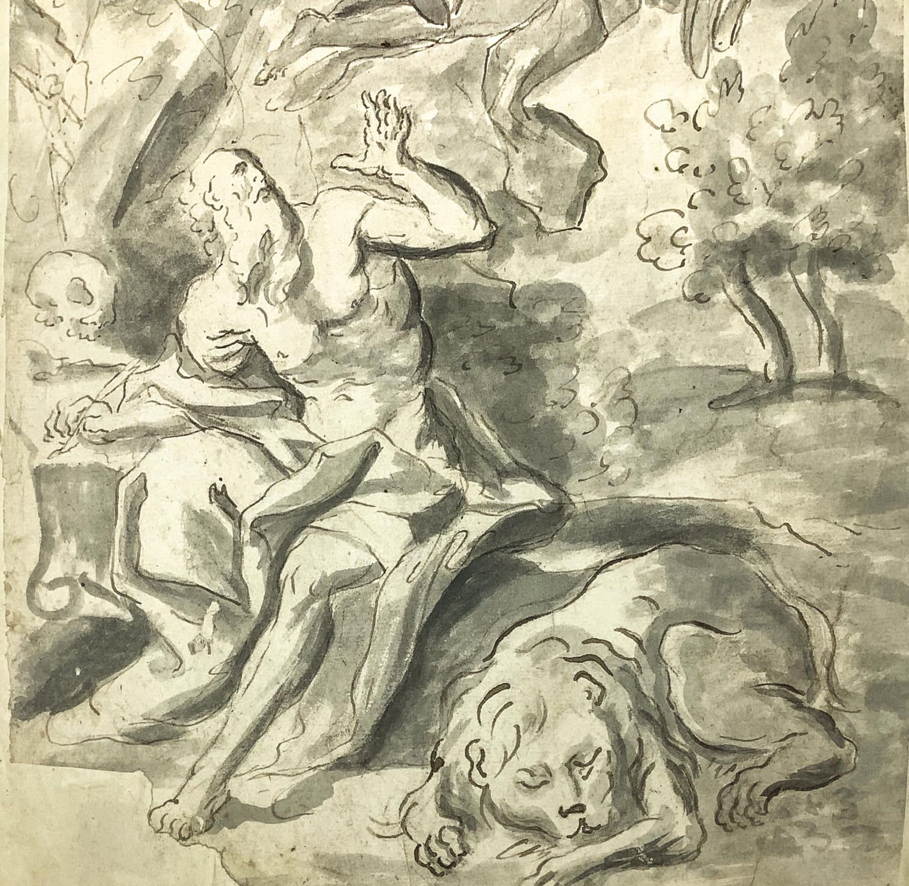 Disegno raffigurante S. Girolamo che traduce le Sacre Scritture, Pietro Novelli, detto il Monrealese (Monreale 1603-1647 Palermo), attribuito. Disegno acquerello su carta, inchiostro bruno. Mm 209x260.