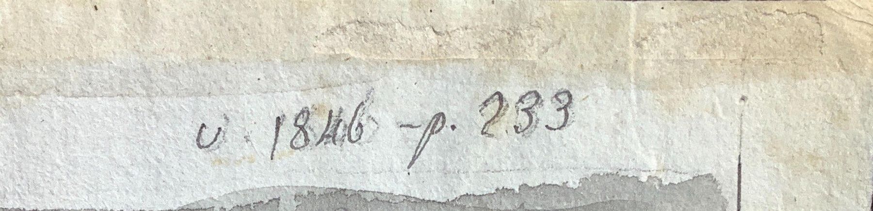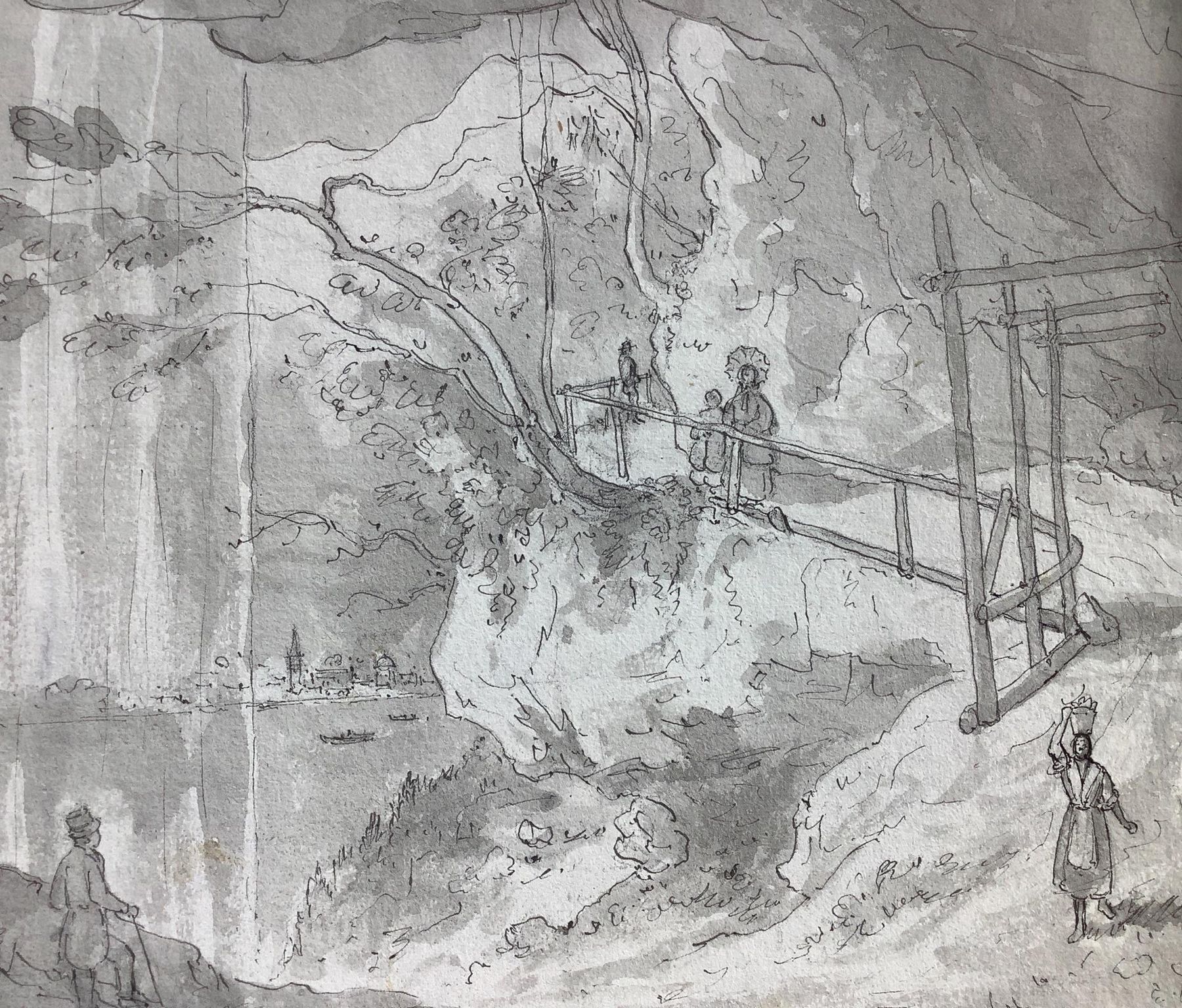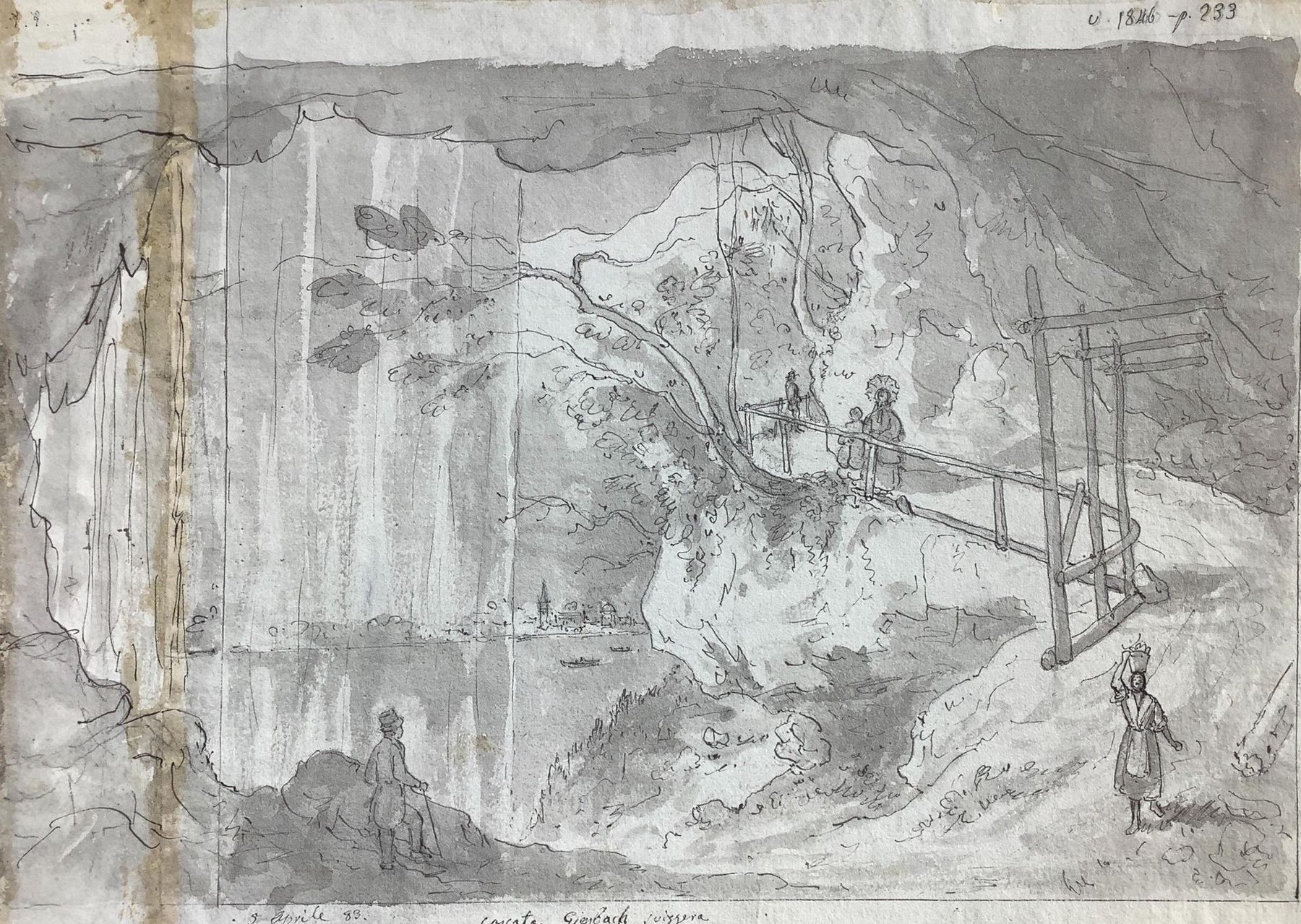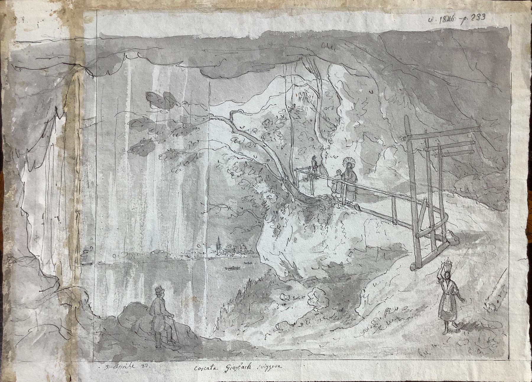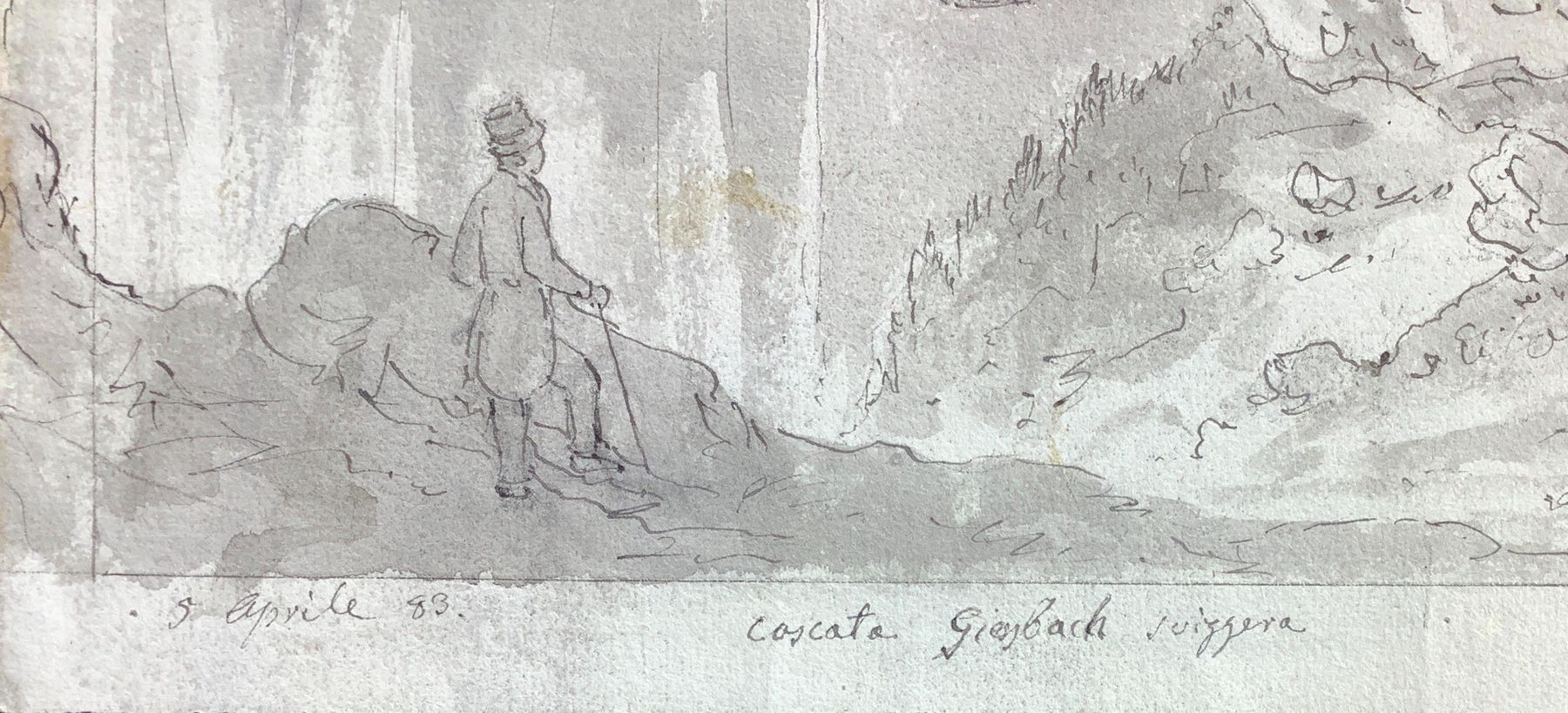 Disegno a inchiostro bruno su carta raffigurante Cascata Giessbach (Svizzera) con personaggi. Datato 5 aprile 83. 370x270mm