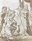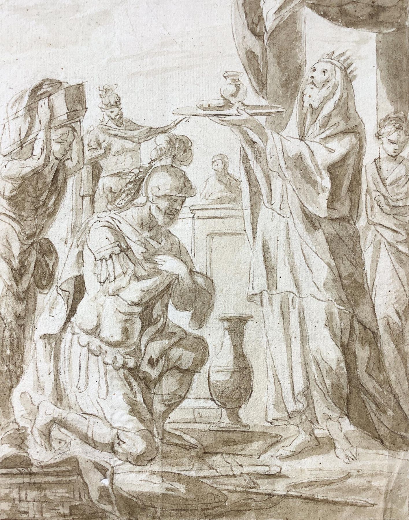 Disegno inchiostro a seppia raffigurante soldato genuflesso davanti al re, anonimo del XVIII, sec. 180x240mm