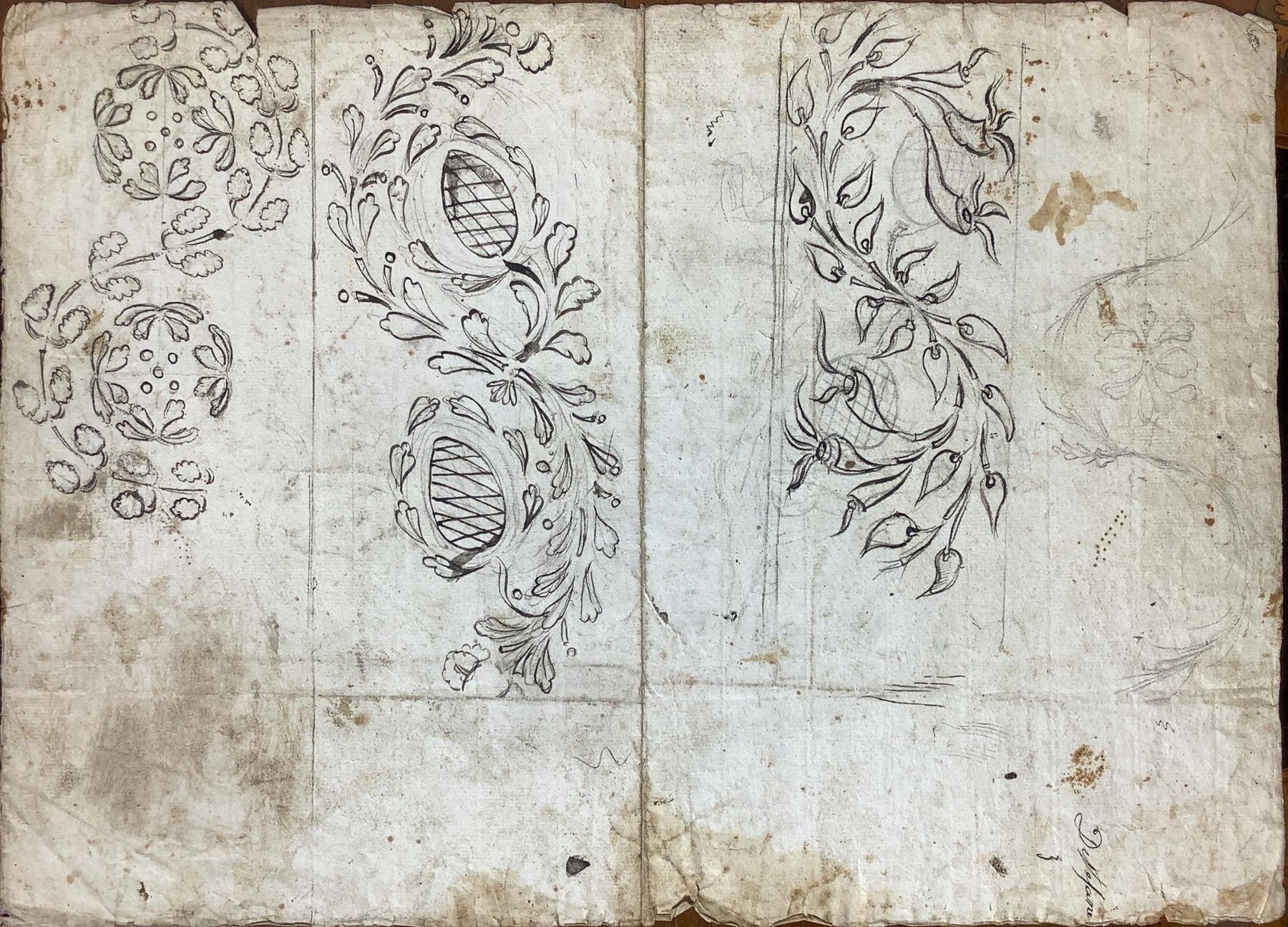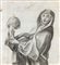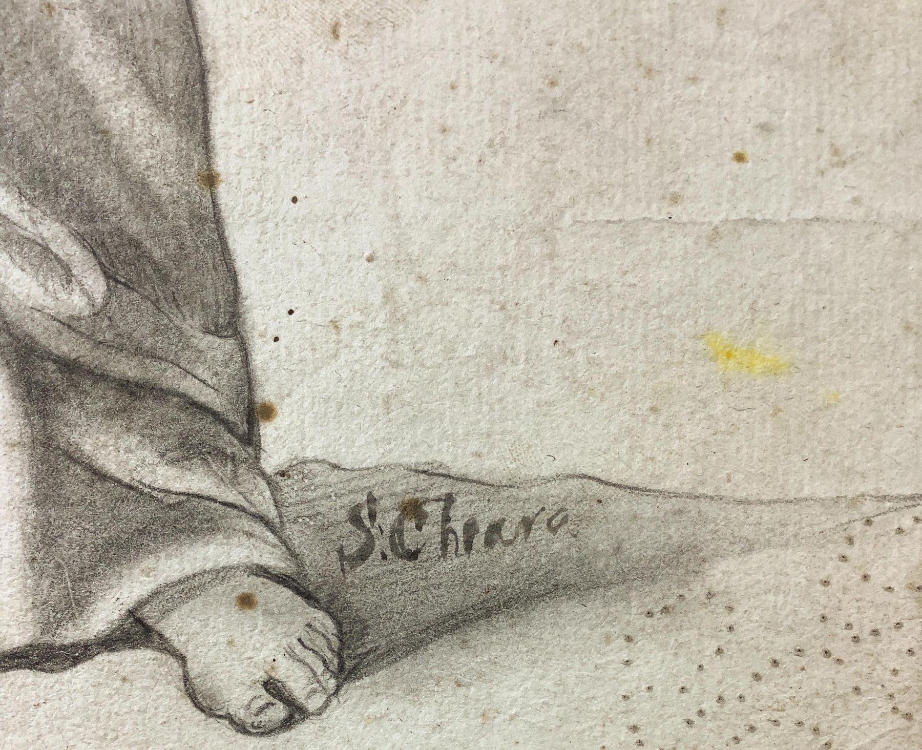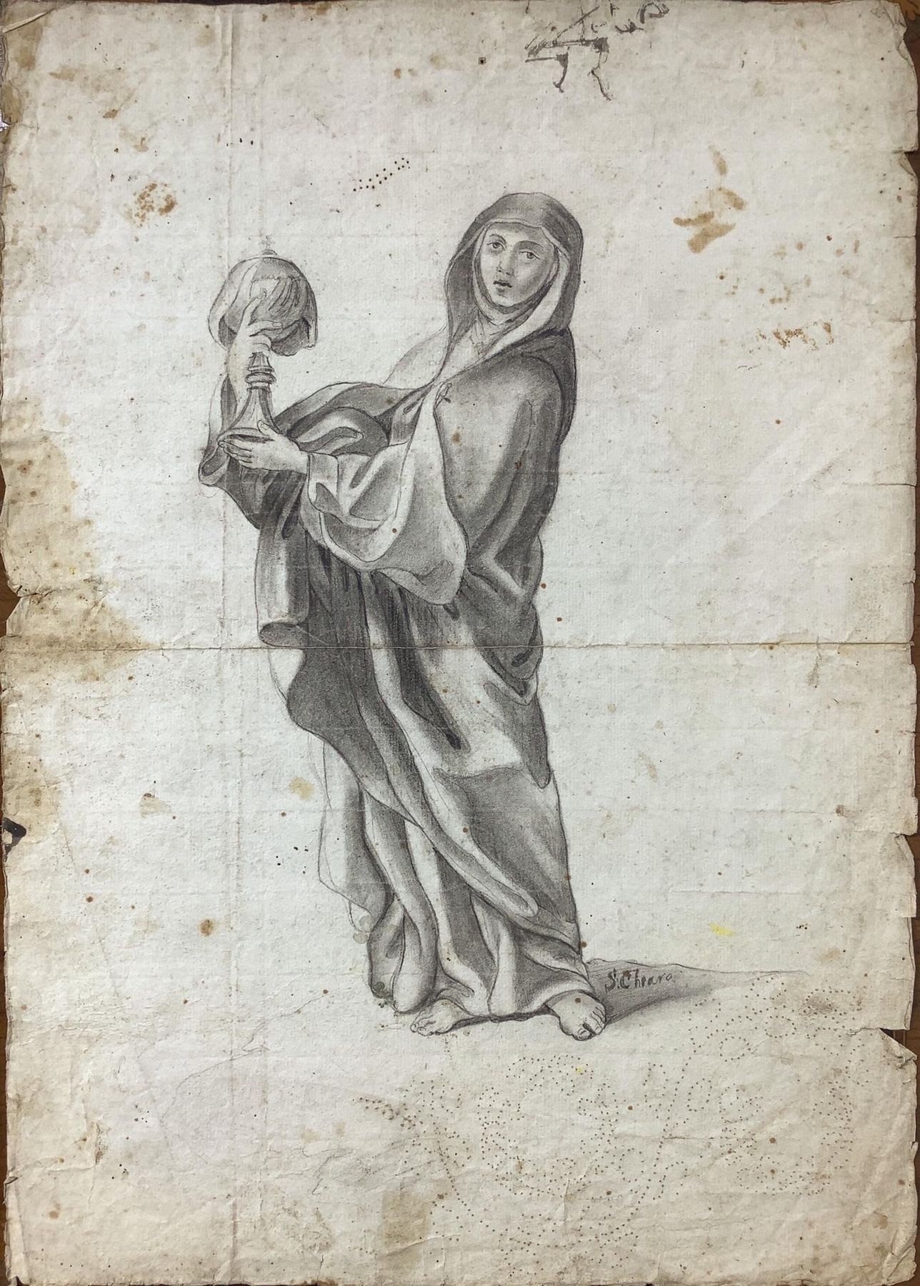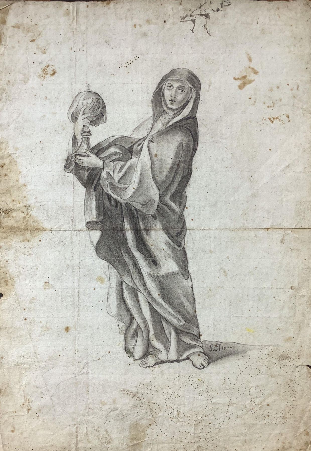 Disegno a matita su carta raffigurante Santa Chiara, cerchia di Guido Reni. Con disegni decorativi. 480 x 345 mm