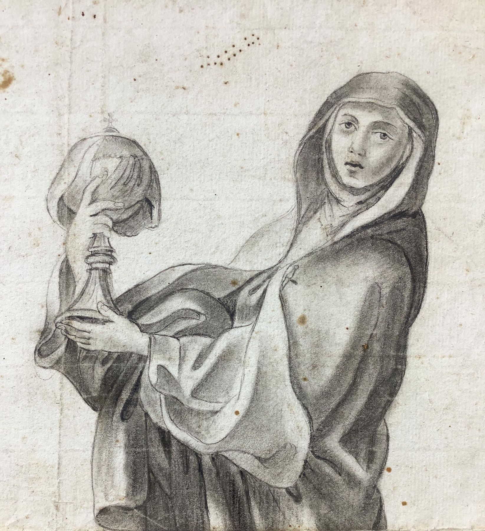 Disegno a matita su carta raffigurante Santa Chiara, cerchia di Guido Reni....