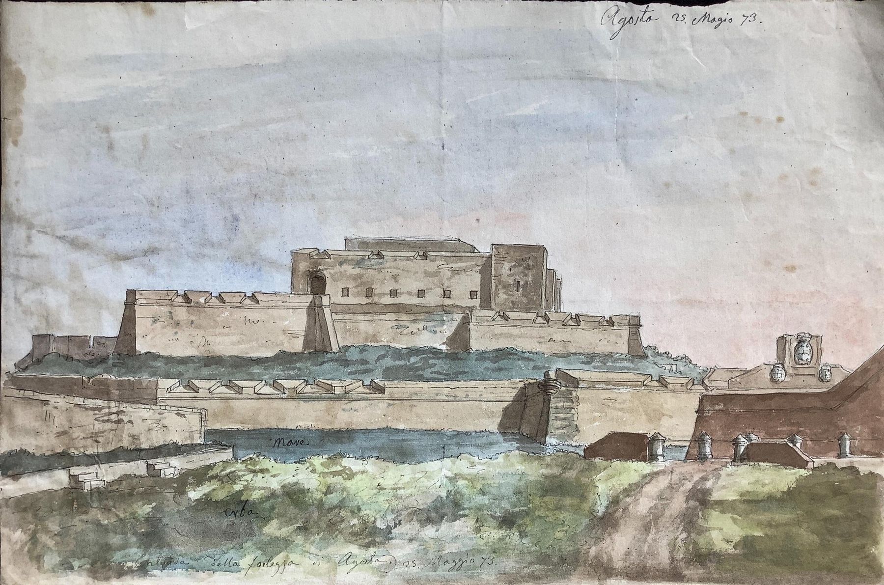 Disegno Acquarello su carta raffigurante la fortezza di Agosta, Roma. Datato 25 maggio 73. 215 x 320 mm