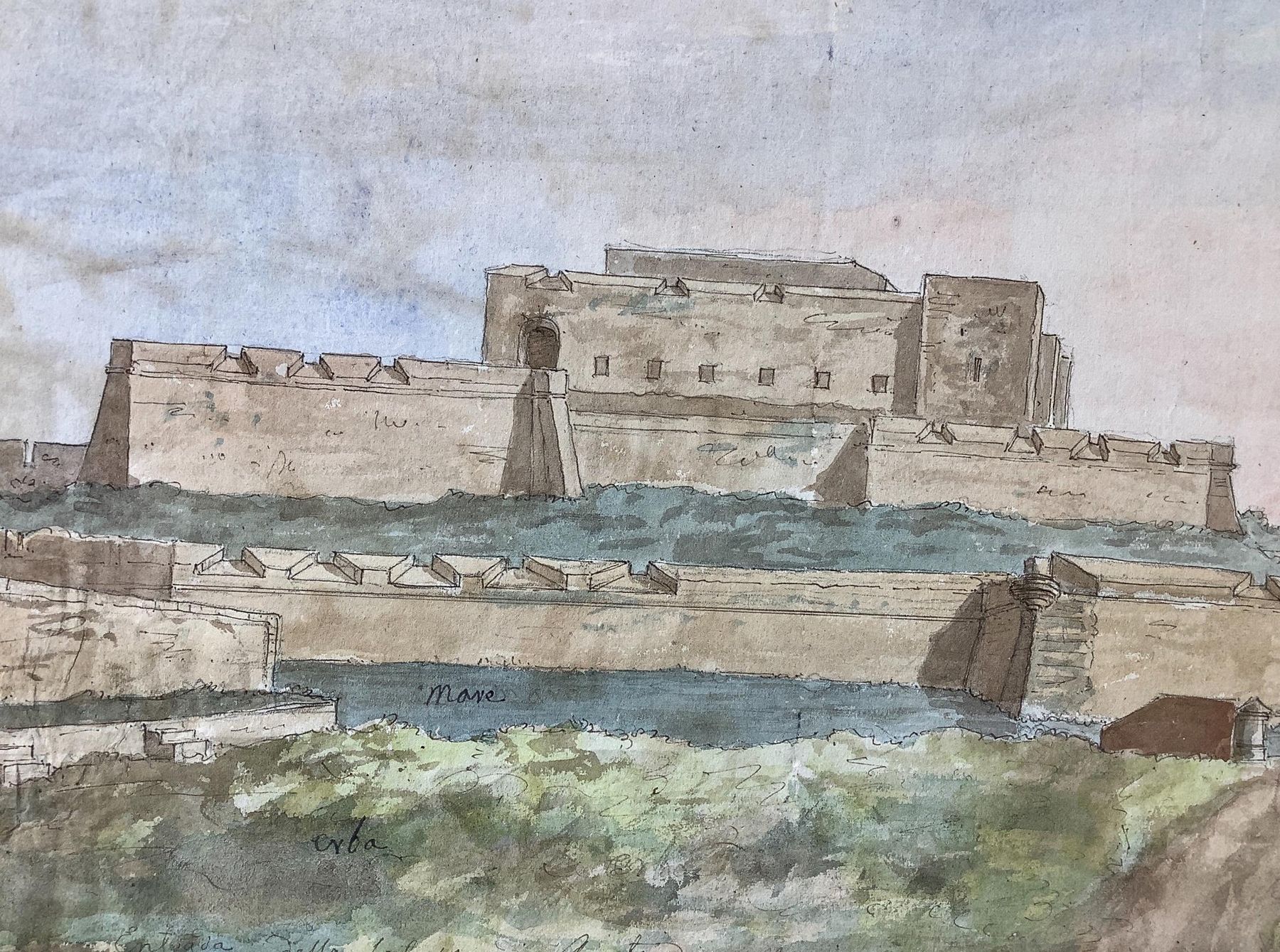 Disegno Acquarello su carta raffigurante la fortezza di Agosta, Roma. Datato...