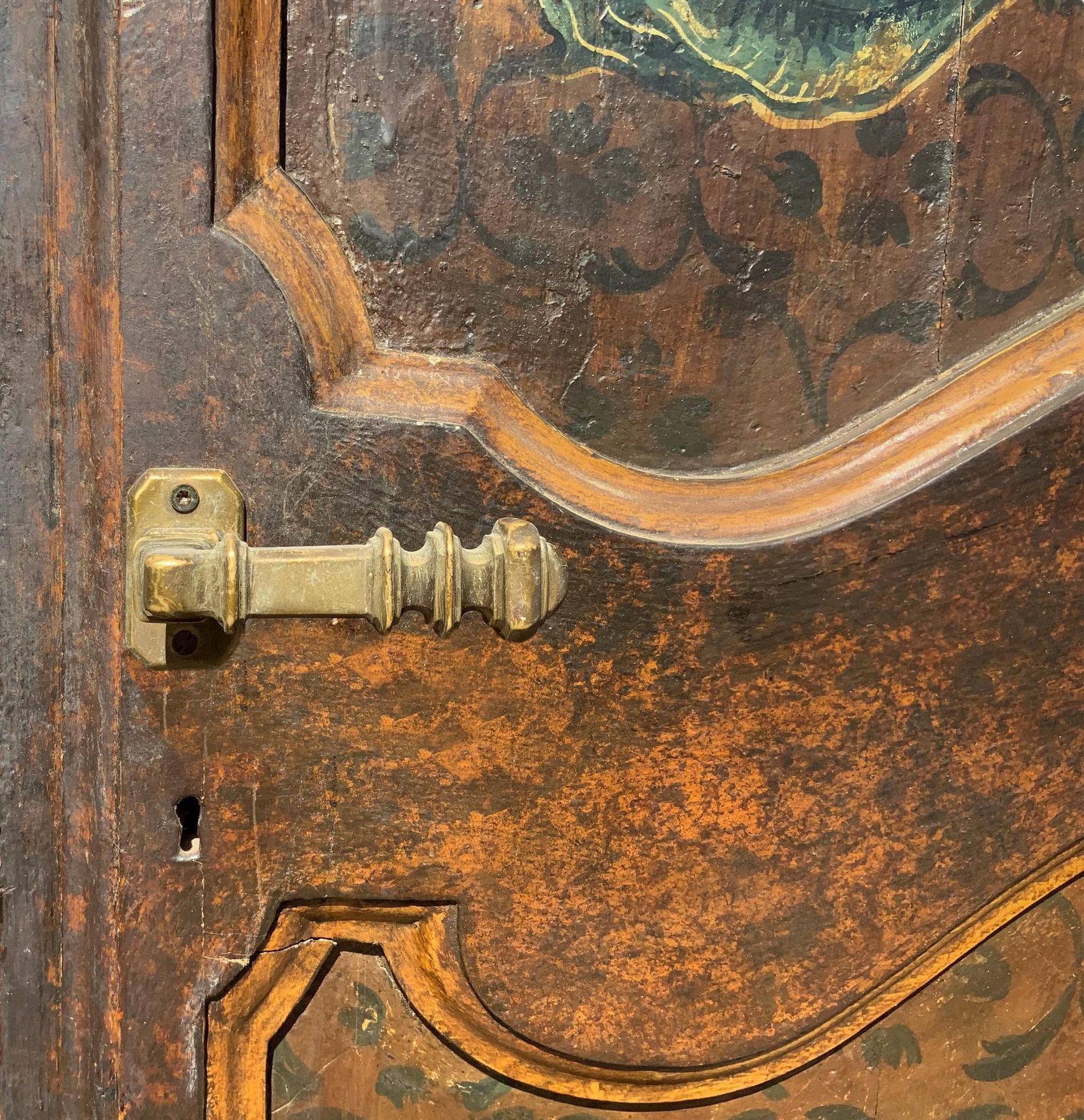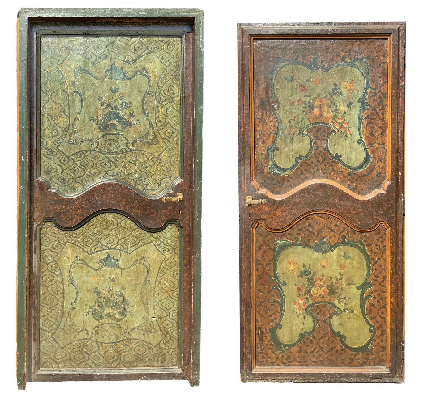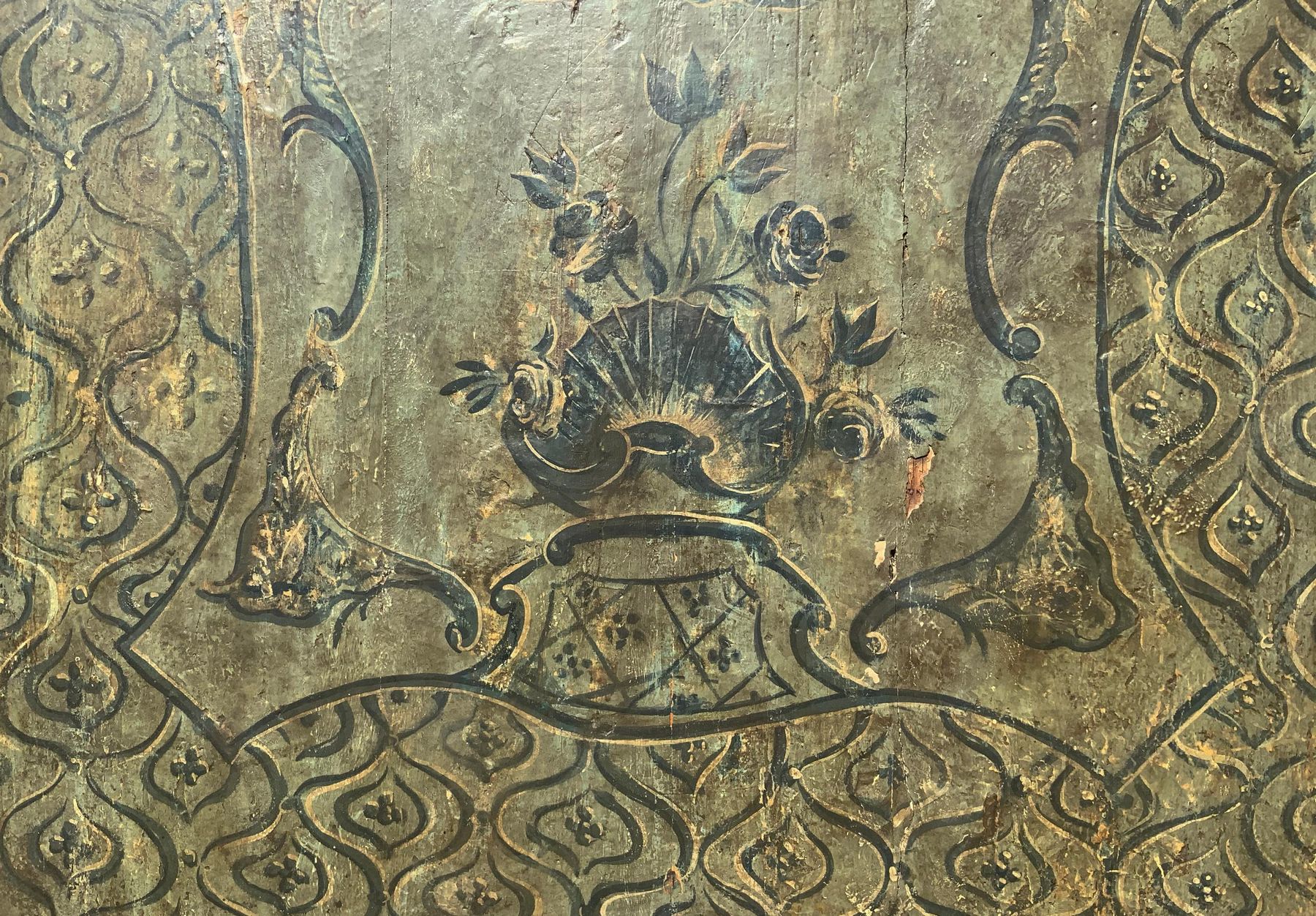 Porta in legno laccata e dipinta sul fronte e sul retro, Sicilia, XVIII secolo. Cm 190x86. Misure comprese del braghettone cm 197x100.