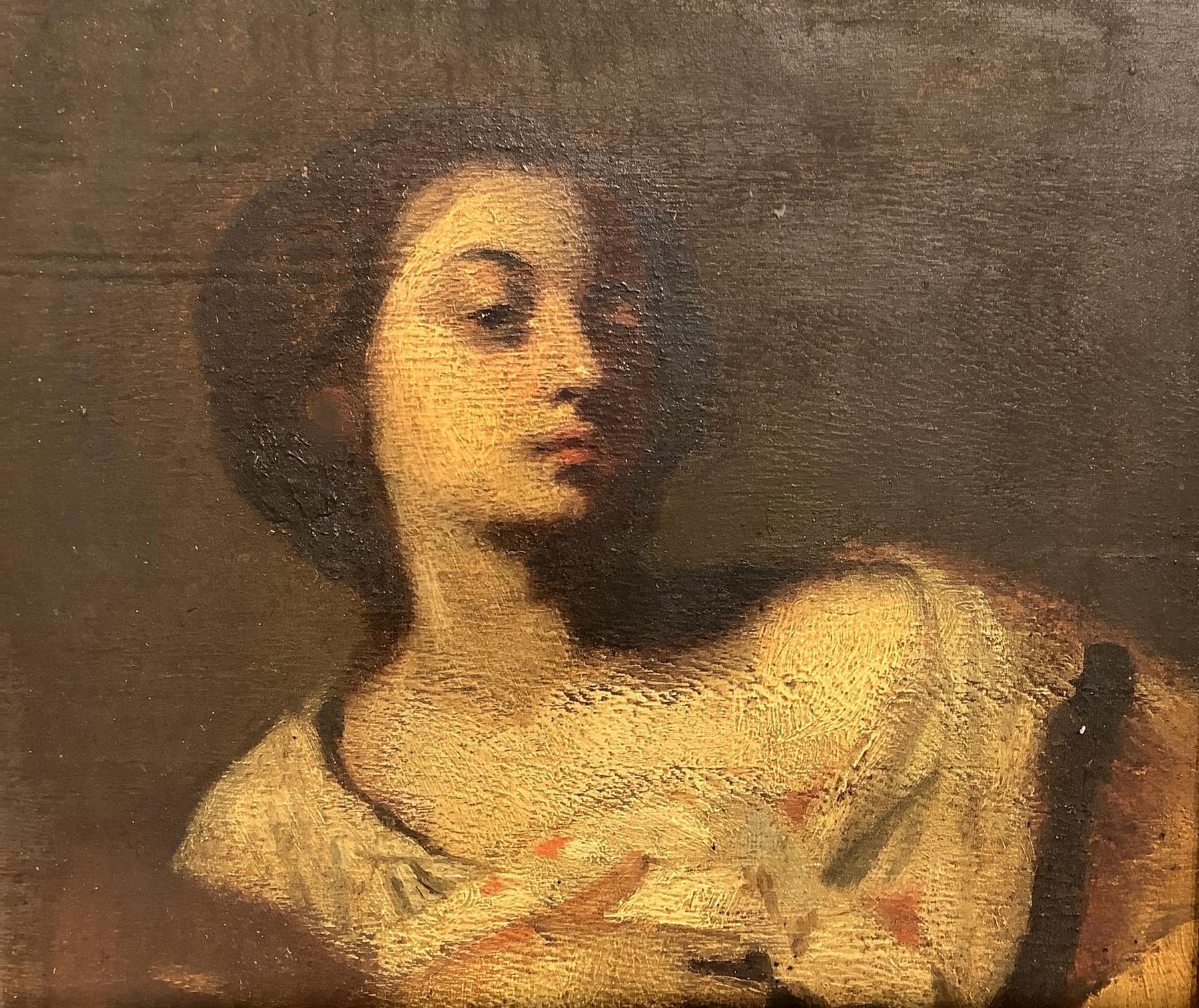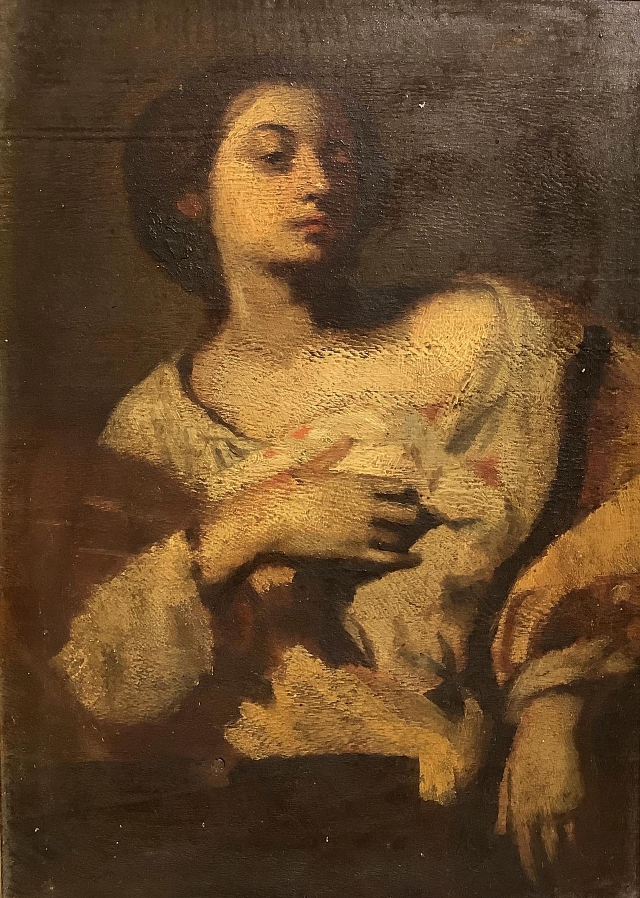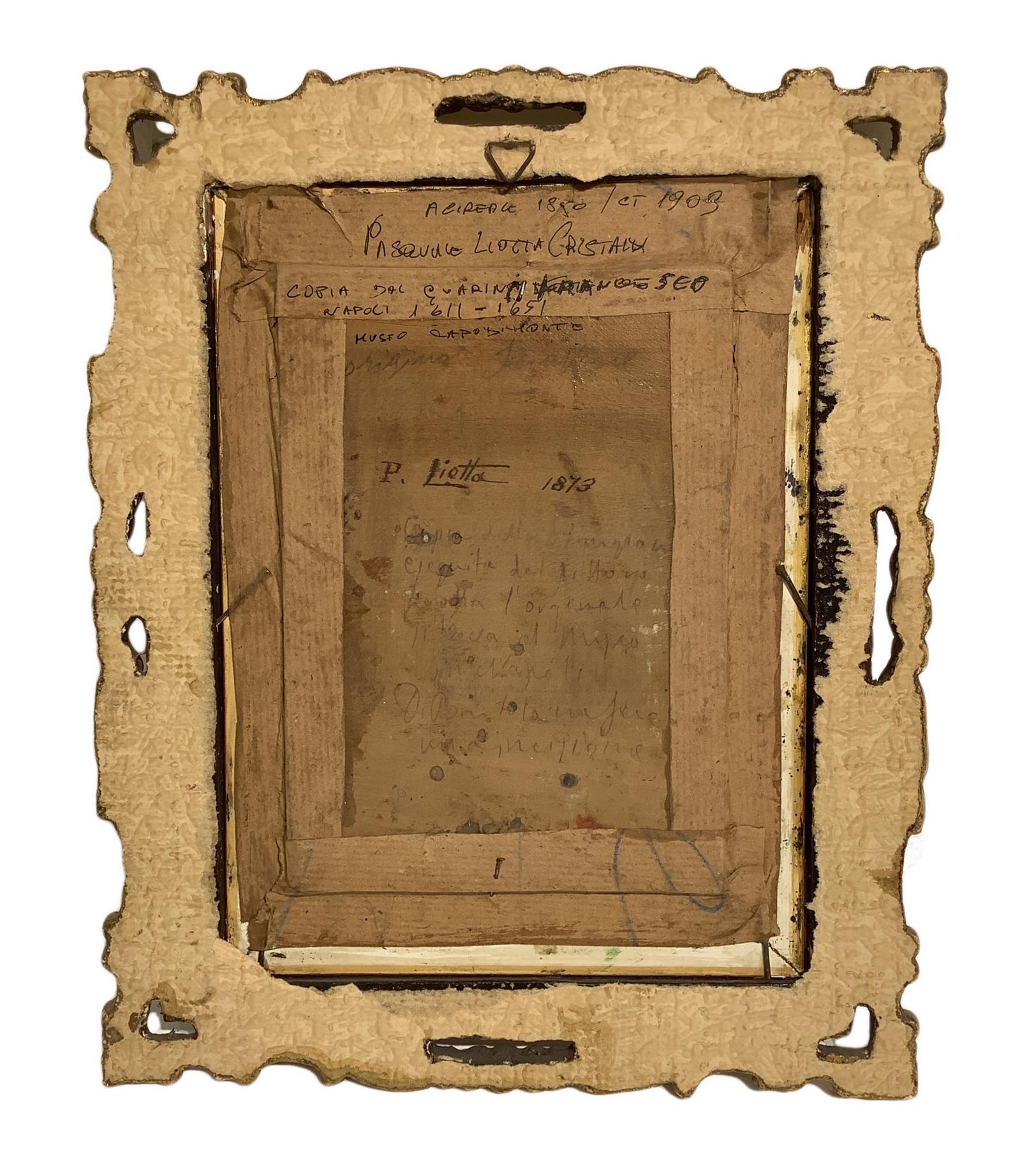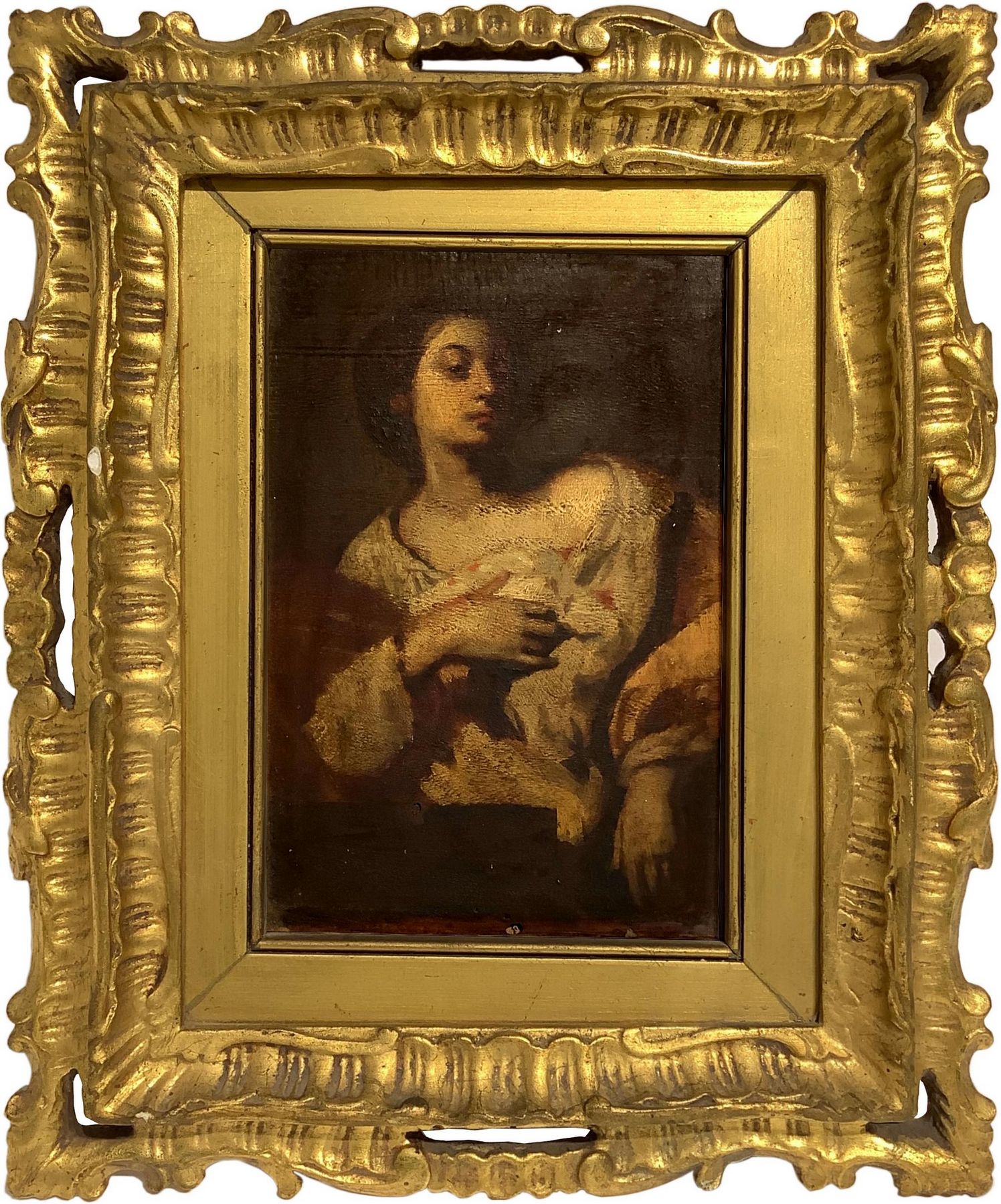 Dipinto ad olio su tavola raffigurante Sant’Agata, Pasquale Liotta Cristaldi (Acireale, 1850-Catania, 1909) da Francesco Guarino (Napoli, 1611-Napoli, 1651). Cm 19x13,5. Misure in cornice cm 31x25. Firmato P. Liotta e datato 1873 sul retro.