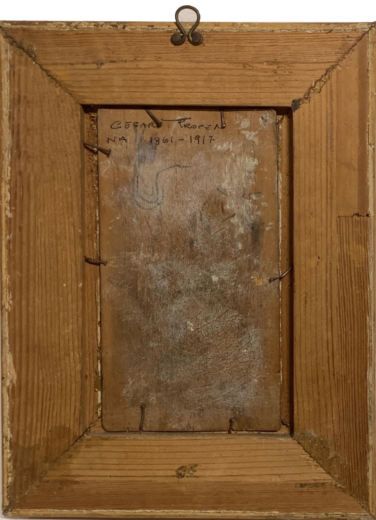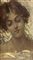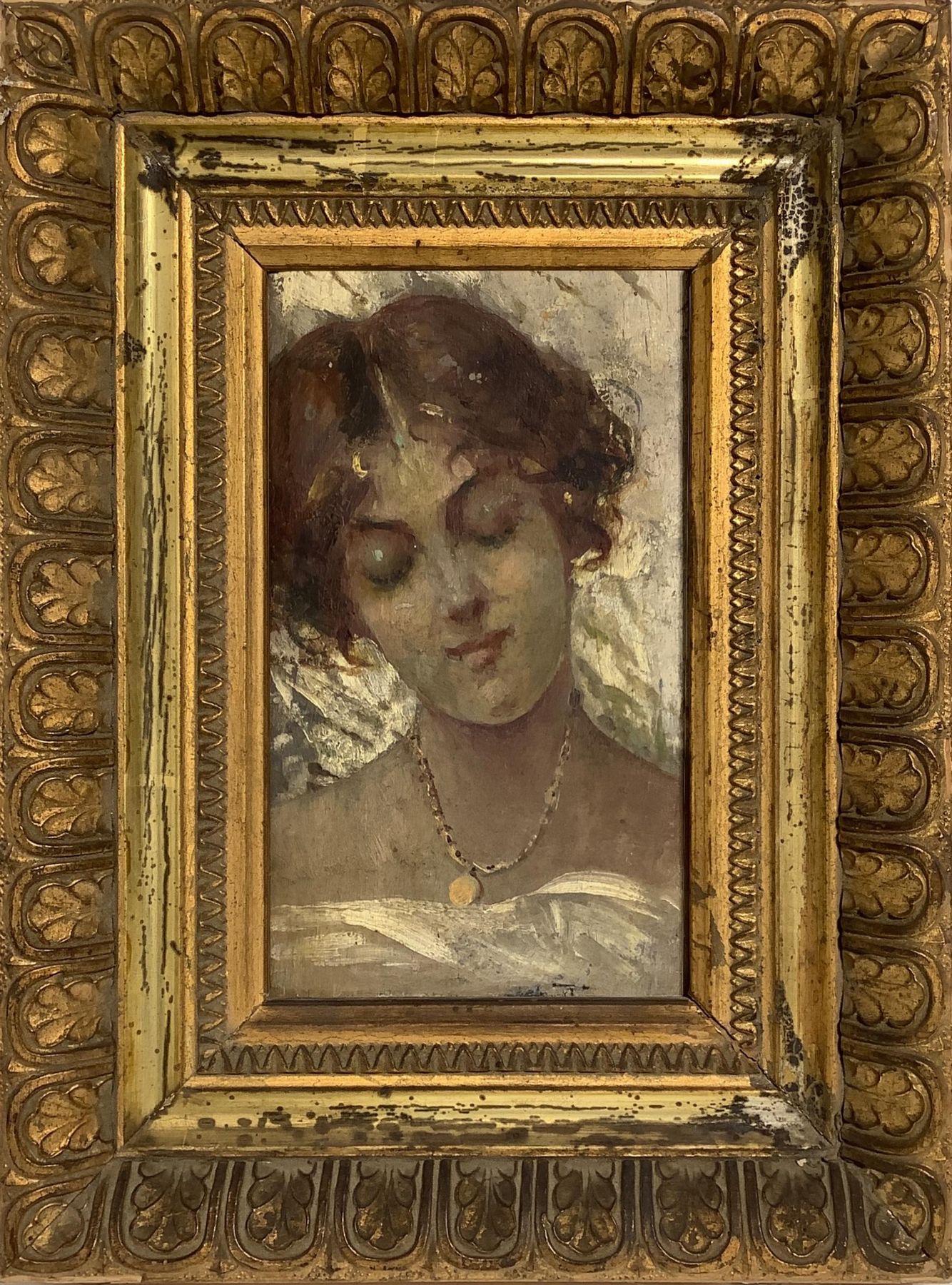 Dipinto ad olio su tavola raffigurante viso di giovane donna con collana, Cesare Tropea (Napoli, 1861- Napoli, 1917). Cm 13,7x7,5. In cornice di legno dorato cm 21x16.