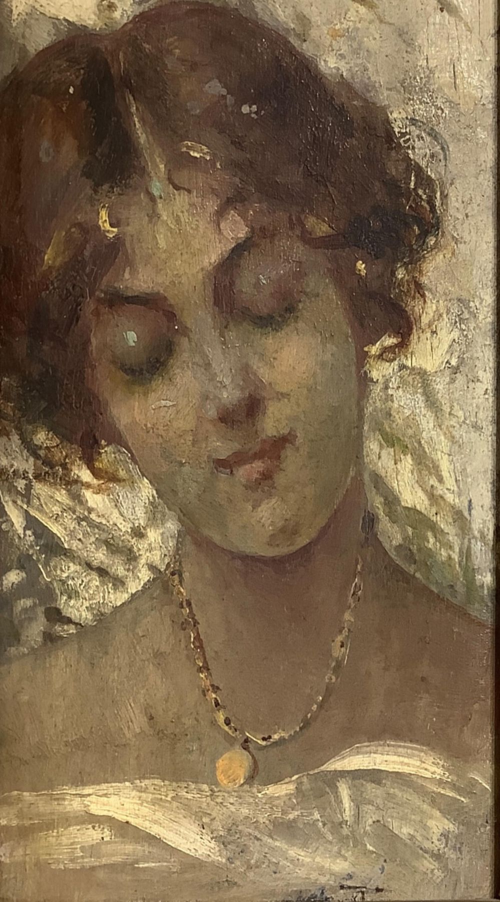 Dipinto ad olio su tavola raffigurante viso di giovane donna con collana,...