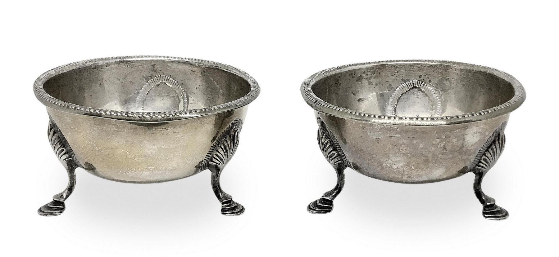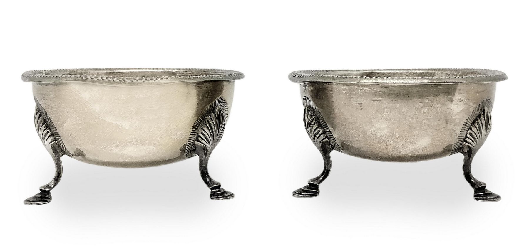 Coppia compostiere in argento, Londra, argento sterling 925, argentieri A.P-F.P, data 1918. H cm 7,5xcm 14. Gr 252 cadauno