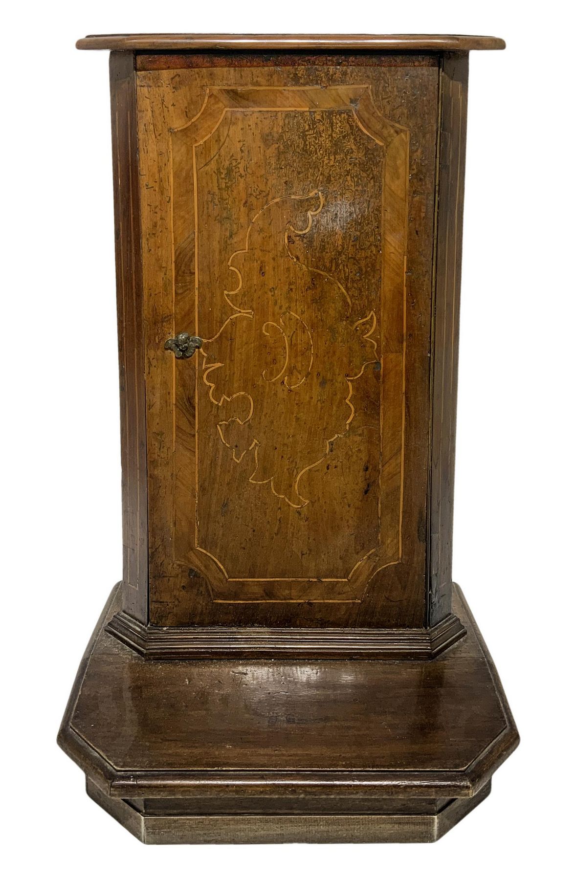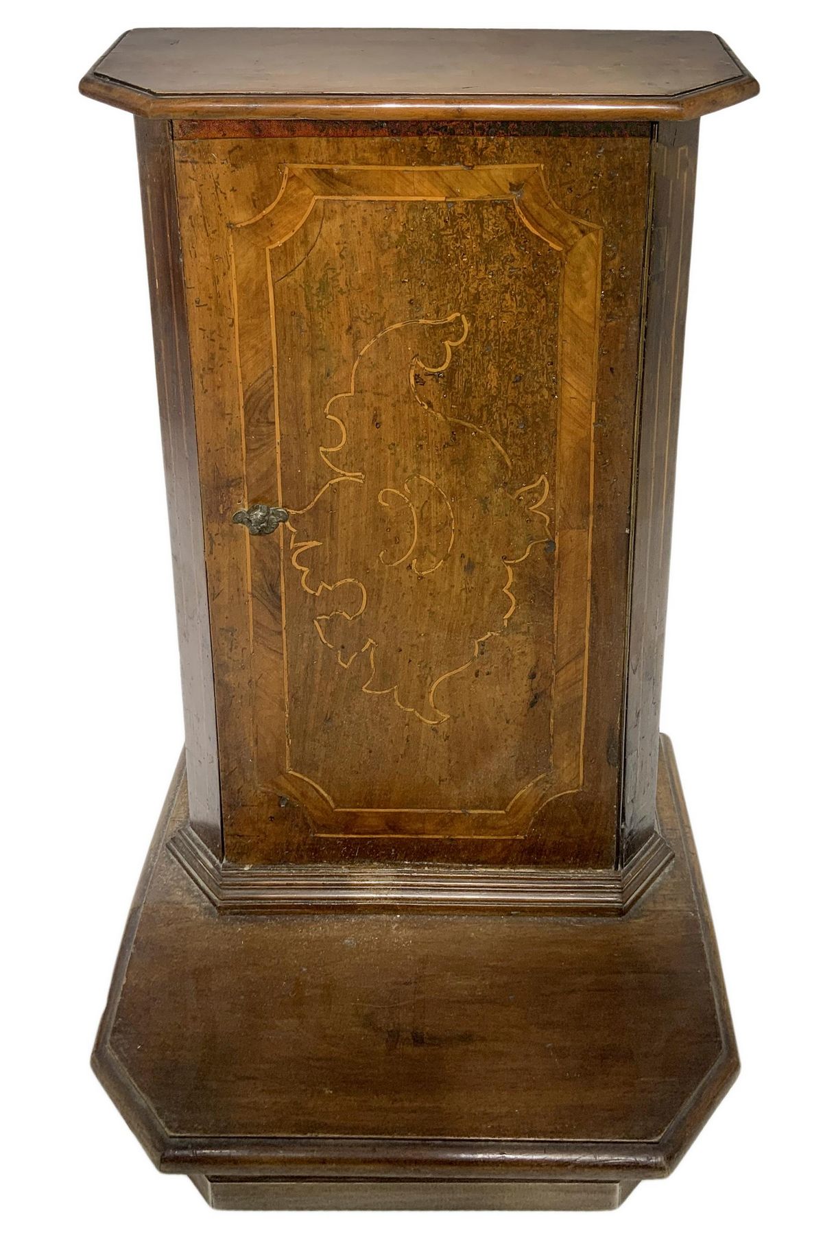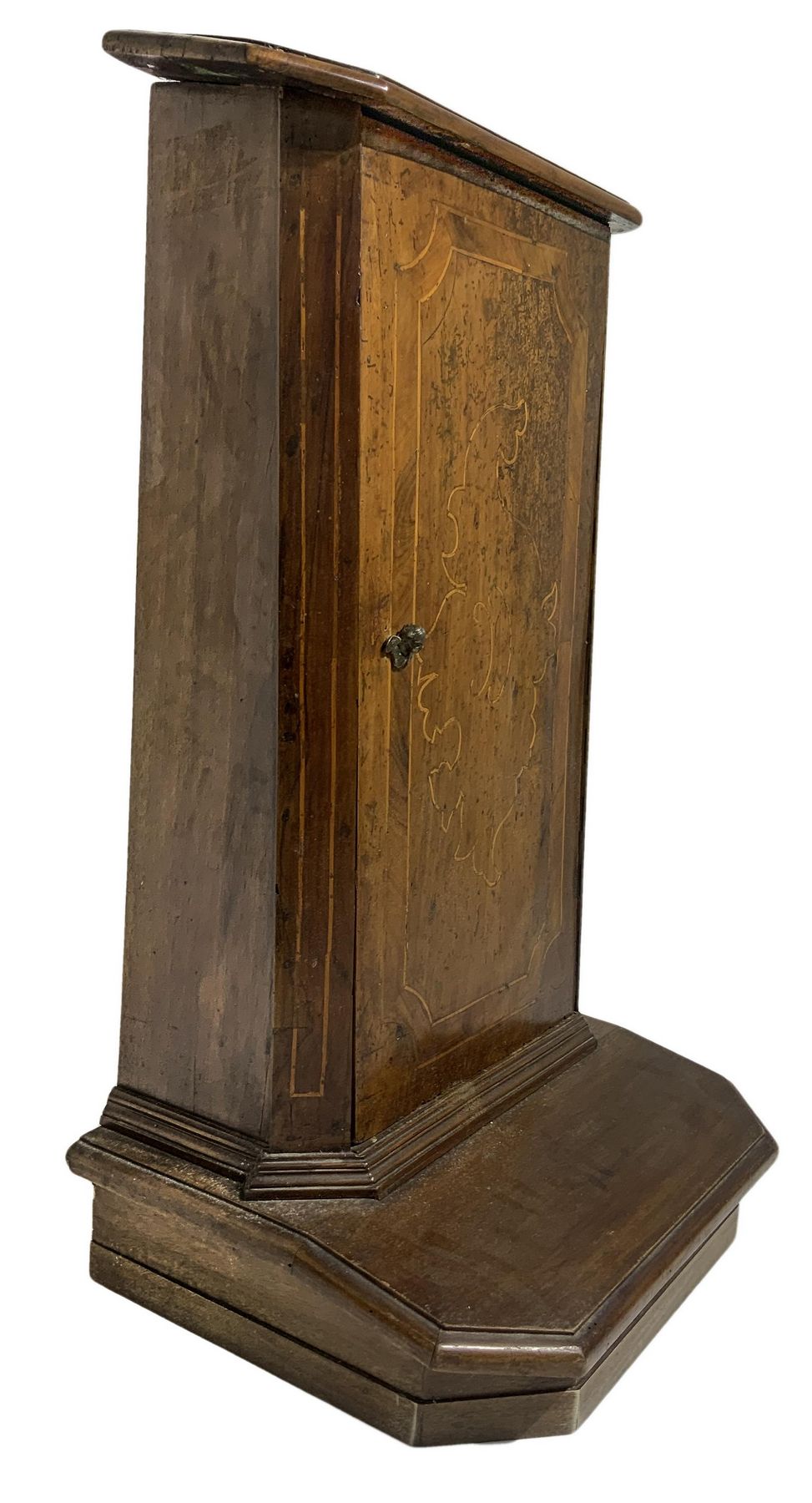 Inginocchiatoio contenitore in legno di noce, fine XIX secolo. Intarsi sul fronte. H cm 85 per 40